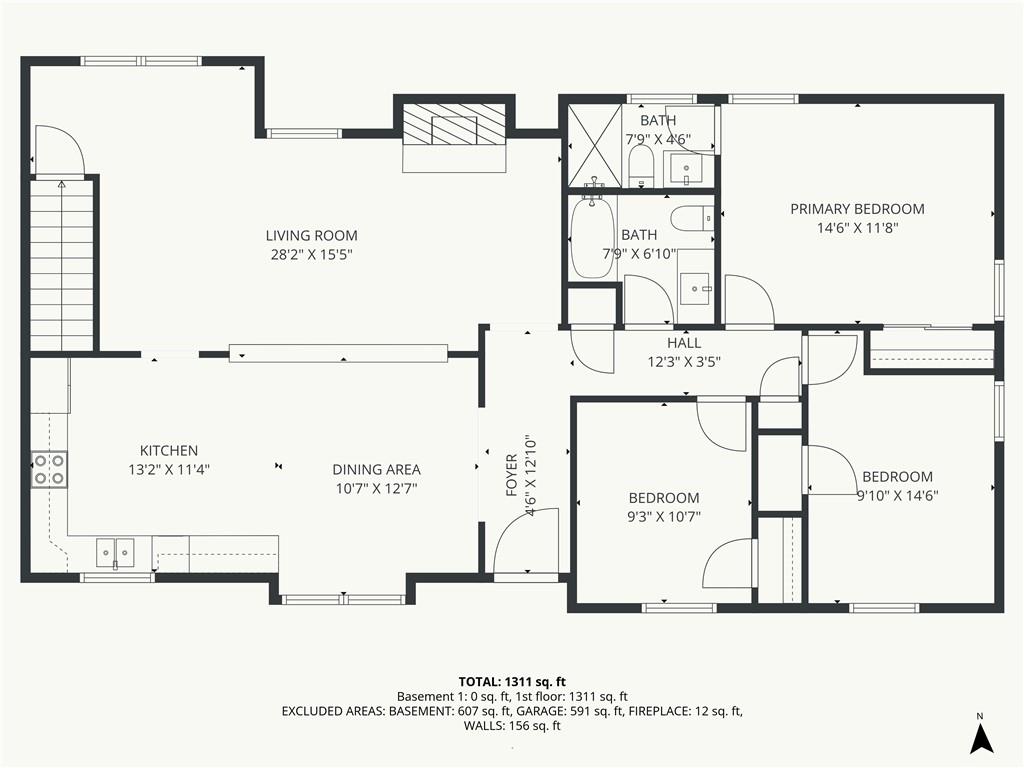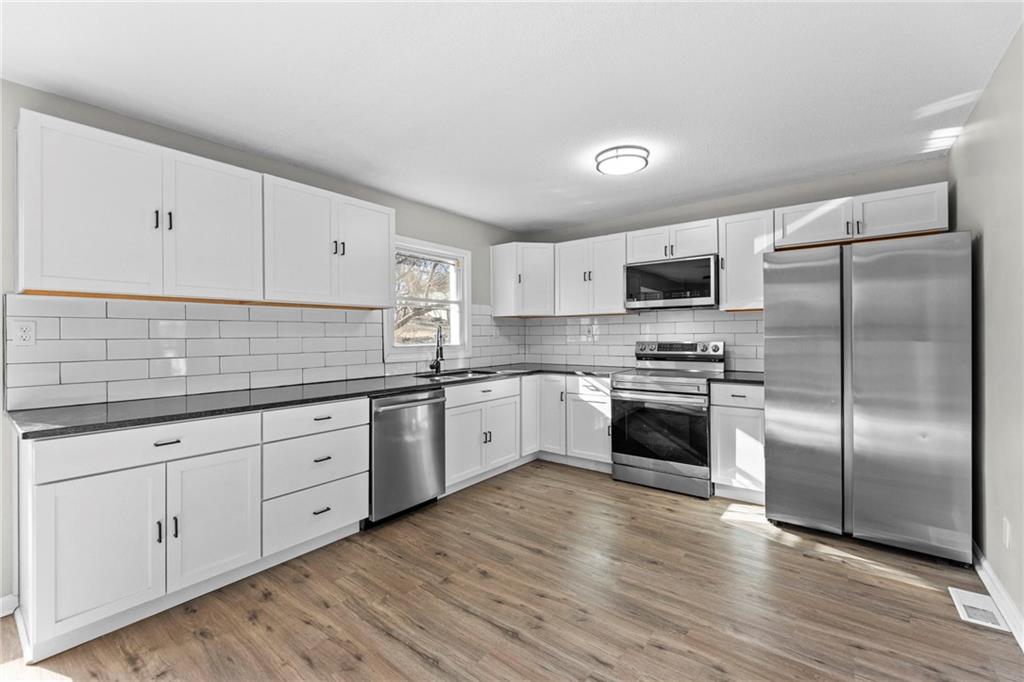 Fully remodeled and move-in ready in Raytown School District! This 3-bedroom, 2-bath home shines with a completely updated kitchen featuring new cabinetry, granite countertops, tile backsplash and stainless steel appliances. Adjacent dining area is perfect for entertaining. Stylish modern finishes flow throughout, highlighted by accent walls and a fresh color palette. Living area boasts a vaulted ceiling and an inviting fireplace, perfect for relaxing next to during the chilly months! Primary bedroom offers a private en-suite bath. 2-car garage and unfinished basement provide ample storage space. Great location close to dining, shops and easy highway access to enjoy all KC has to offer. WELCOME HOME!
