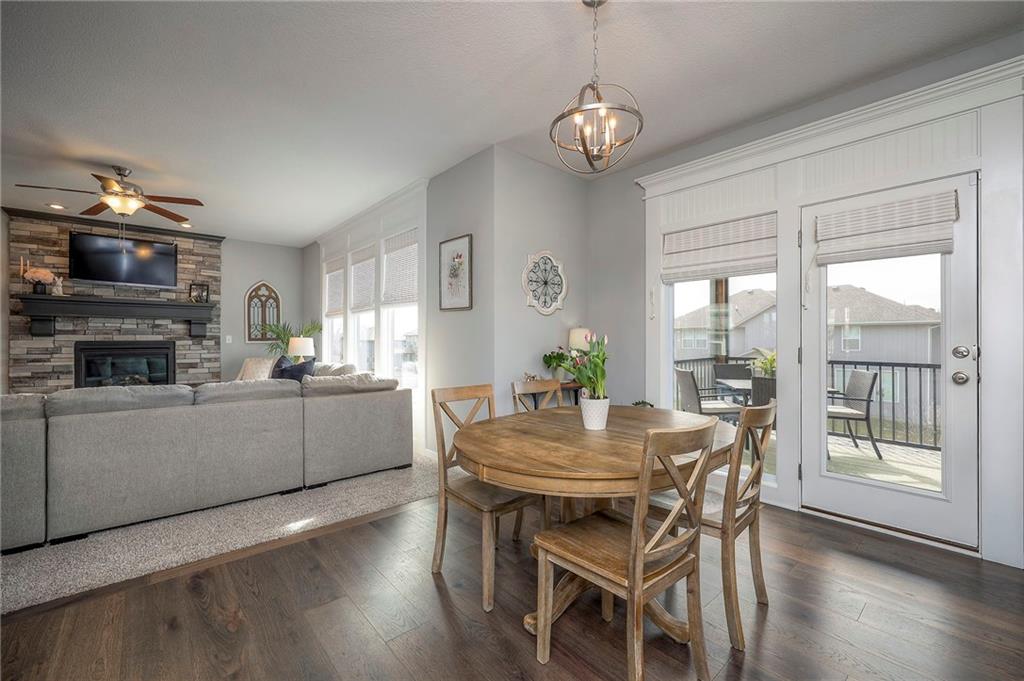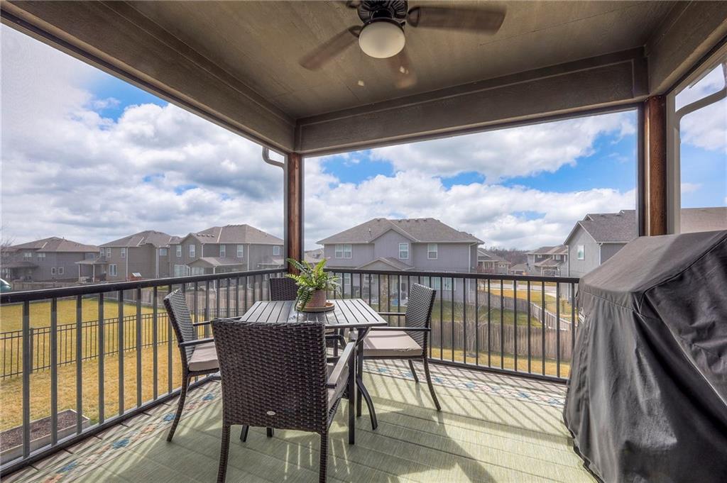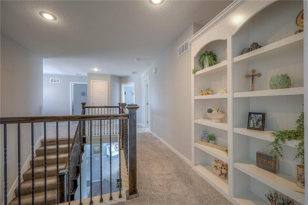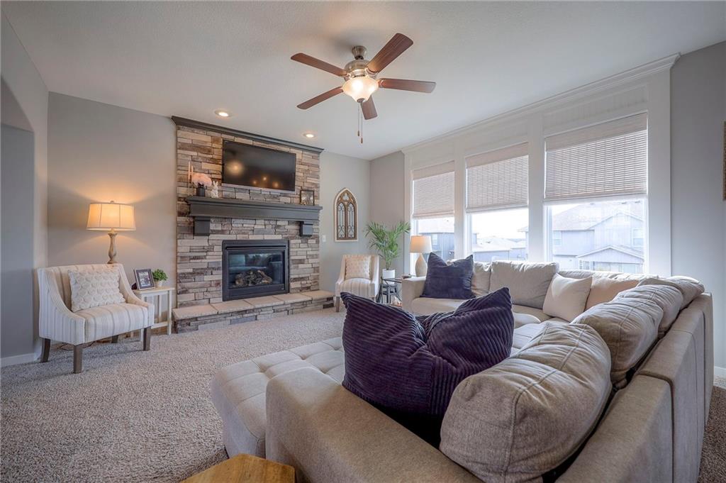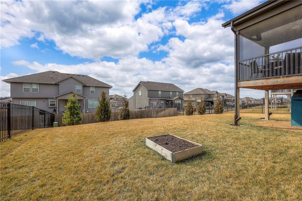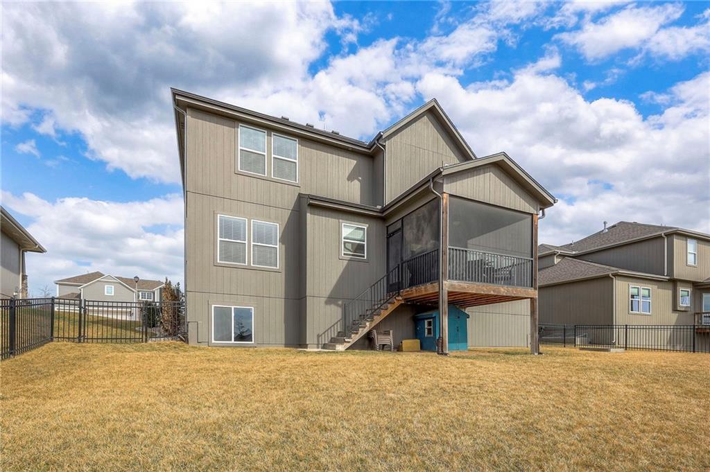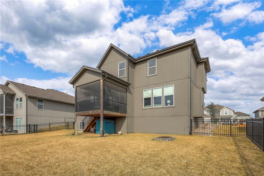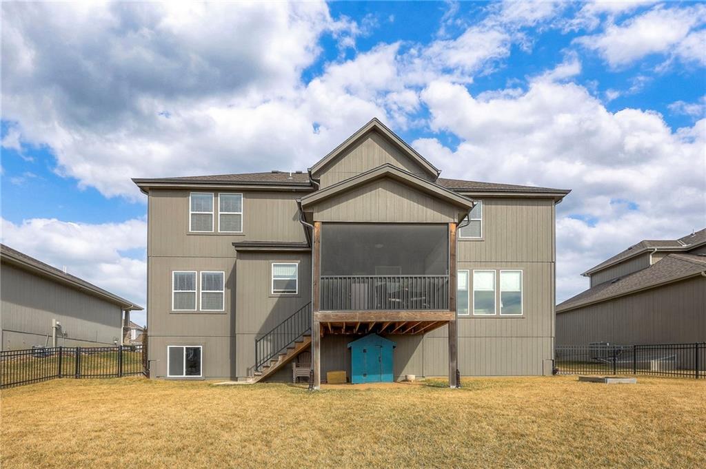 Move In Ready - with full landscaping, window blinds, metal fenced yard and screened porch with added stairs to get to yard (all items new construction does not come with) - This popular Levi II by Prieb Homes faces West, giving you ideal summer deck parties in the shade. Spacious entry, with formal dining room to left, and first floor 5th bedroom/office/flex room includes a closet and 3/4 bath. A must see open great room with fireplace and oversized windows streaming in tons of natural light. Bright kitchen includes center island, granite countertops, custom cabinets with upgraded hardware and soft close drawers & doors, built in microwave, large walk in pantry, stainless appliances and breakfast room. Beautiful hardwood floors throughout the entry kitchen and breakfast room. Second floor features 3 more bedrooms with walk in closets. Two bedrooms with Jack & Jill bath, and one bedroom has its own private bath, A beautiful private primary suite with vaulted ceiling and natural light through the windows. This spacious bedroom includes a cozy sitting area and huge walk in closet. The spa-like bath features double granite vanity, tile floors, walk in shower and separate soaking tub. The oversized walk in closet leads to the laundry room with folding table and room for your baskets. Also, attached to the hallway, it is a convenient laundry room for all. Another great feature is a storm room which gives a great peace of mind during a storm. Tons of storage in the unfinished basement. Prairie Farms is adjacent to the newly renovated Lake Olathe. Offering a large community pool, cabana, playground and walking trails, Prairie Farms is a great place to call home!