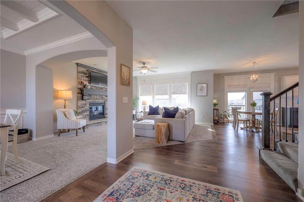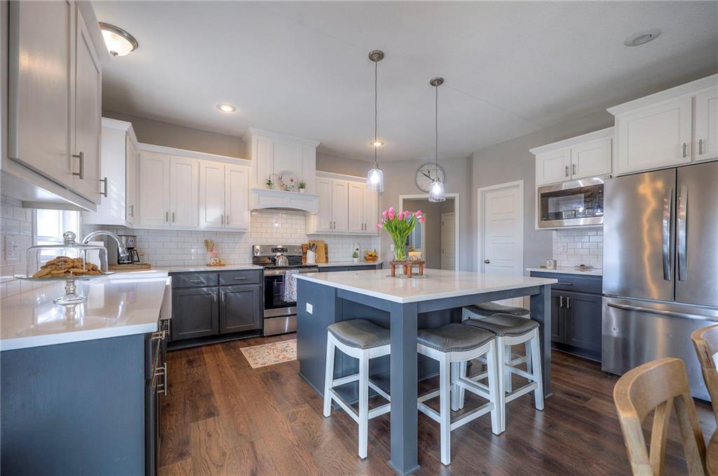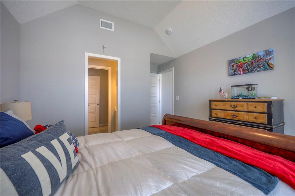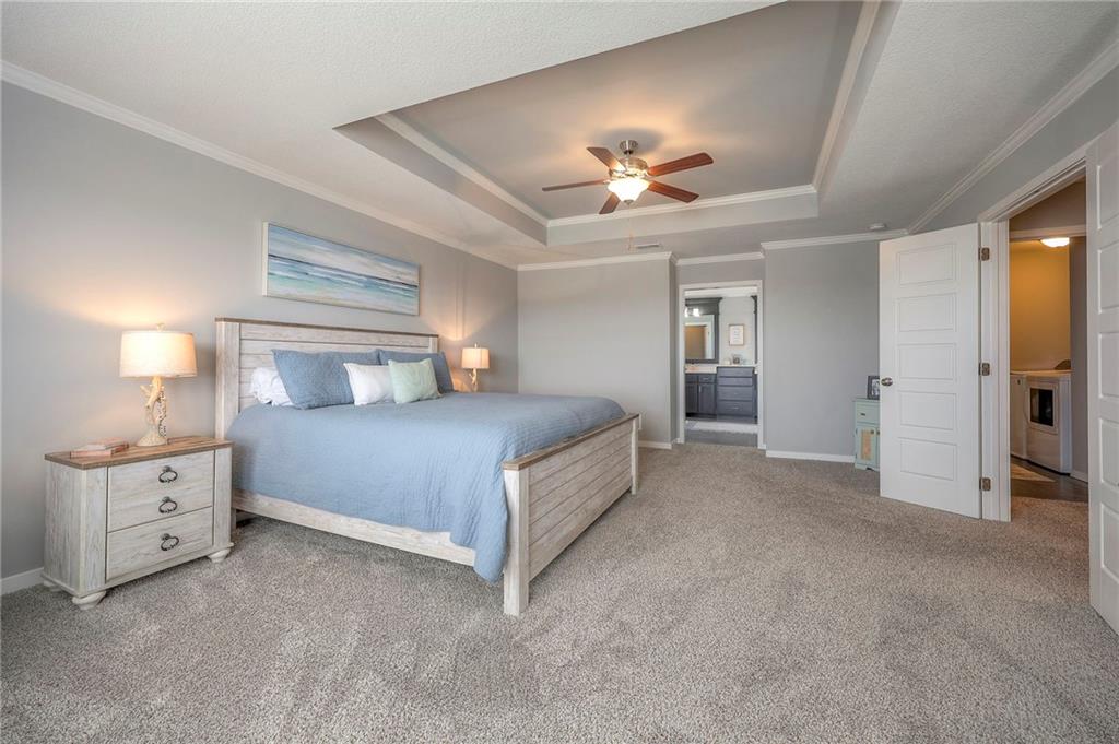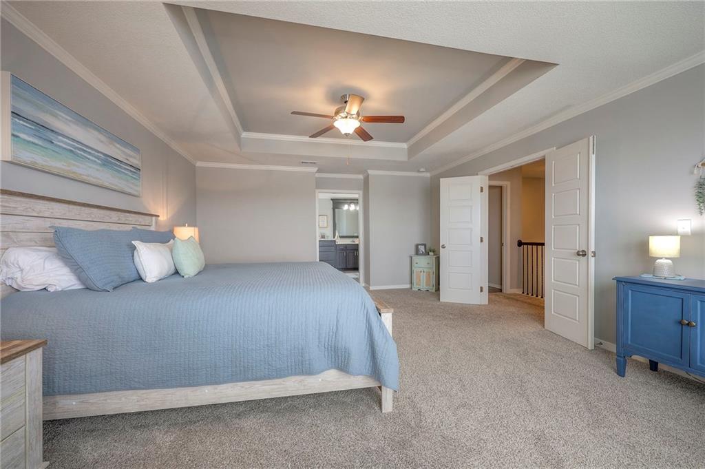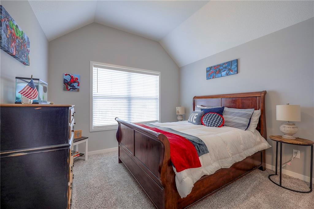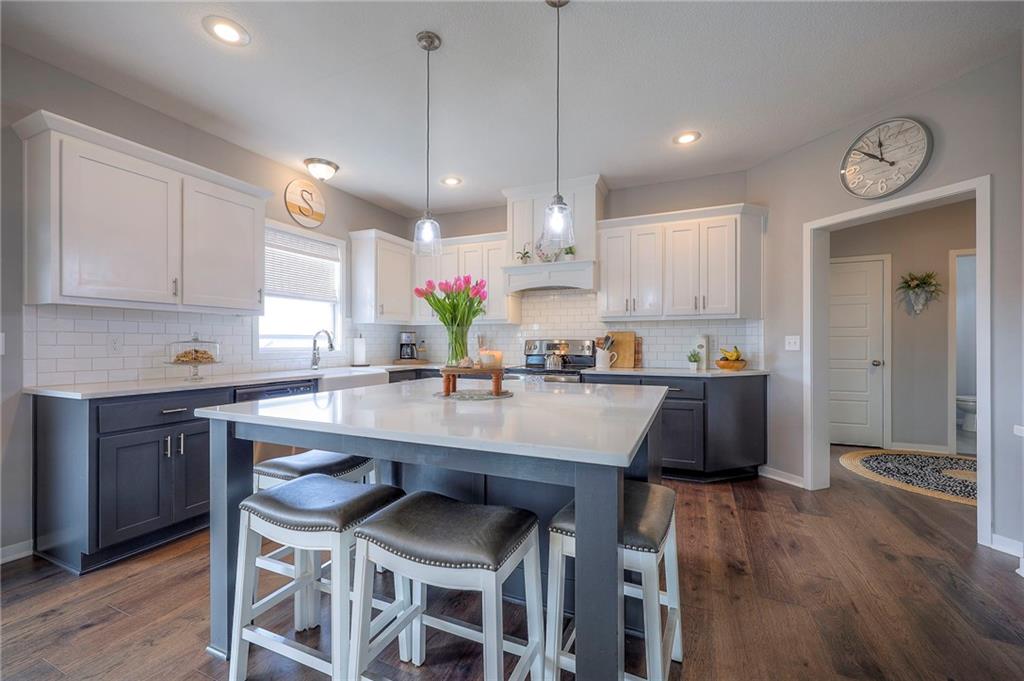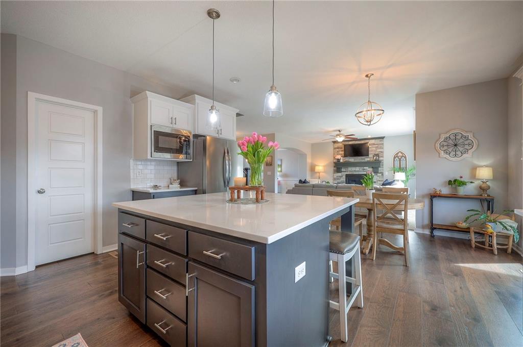 Move In Ready - with full landscaping, window blinds, metal fenced yard and screened porch with added stairs to get to yard (all items new construction does not come with) - This popular Levi II by Prieb Homes faces West, giving you ideal summer deck parties in the shade. Spacious entry, with formal dining room to left, and first floor 5th bedroom/office/flex room includes a closet and 3/4 bath. A must see open great room with fireplace and oversized windows streaming in tons of natural light. Bright kitchen includes center island, granite countertops, custom cabinets with upgraded hardware and soft close drawers & doors, built in microwave, large walk in pantry, stainless appliances and breakfast room. Beautiful hardwood floors throughout the entry kitchen and breakfast room. Second floor features 3 more bedrooms with walk in closets. Two bedrooms with Jack & Jill bath, and one bedroom has its own private bath, A beautiful private primary suite with vaulted ceiling and natural light through the windows. This spacious bedroom includes a cozy sitting area and huge walk in closet. The spa-like bath features double granite vanity, tile floors, walk in shower and separate soaking tub. The oversized walk in closet leads to the laundry room with folding table and room for your baskets. Also, attached to the hallway, it is a convenient laundry room for all. Another great feature is a storm room which gives a great peace of mind during a storm. Tons of storage in the unfinished basement. Prairie Farms is adjacent to the newly renovated Lake Olathe. Offering a large community pool, cabana, playground and walking trails, Prairie Farms is a great place to call home!