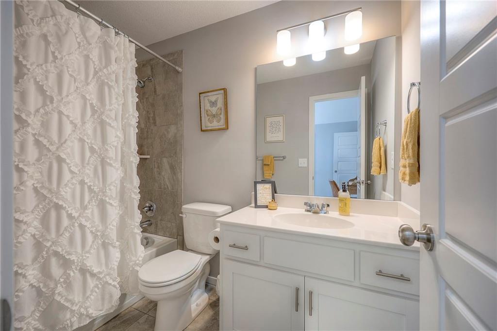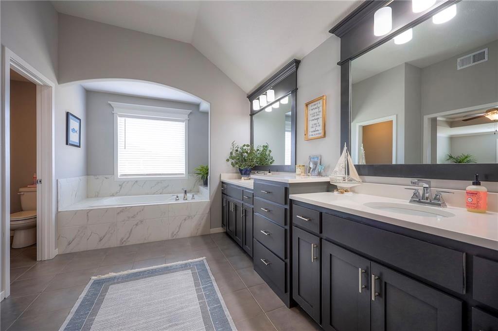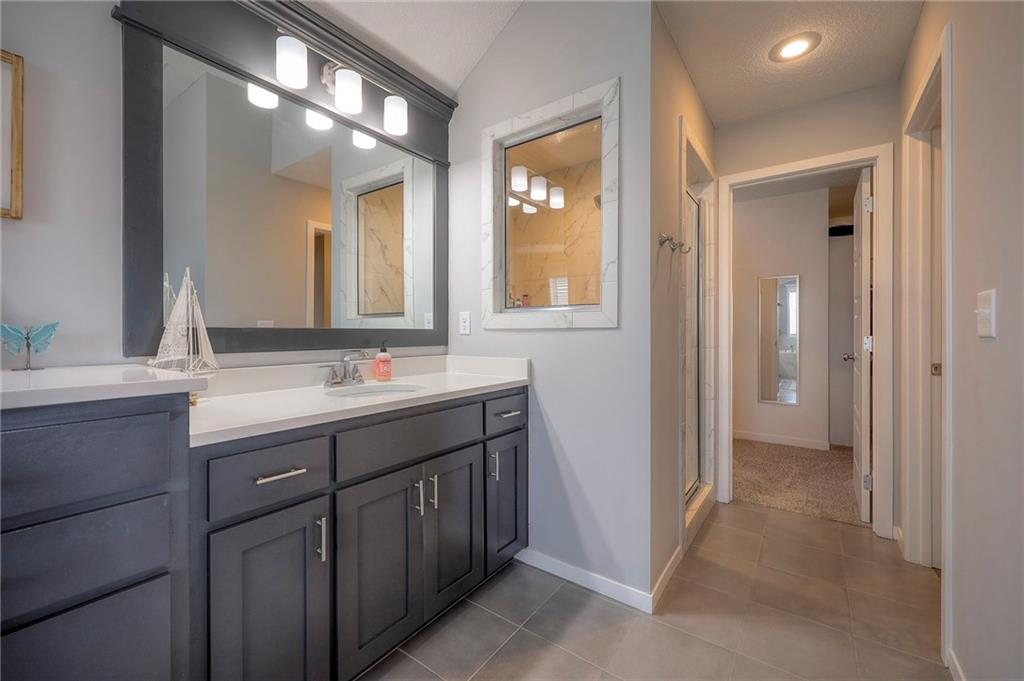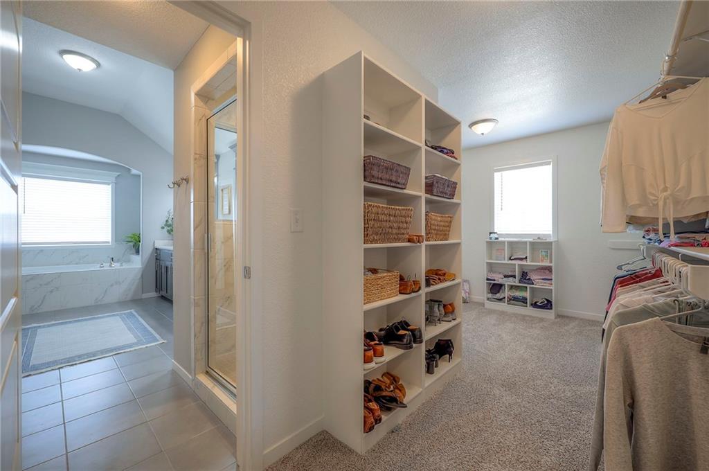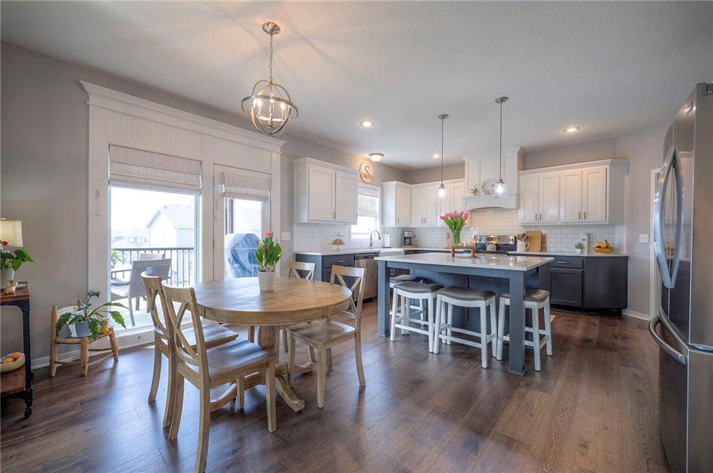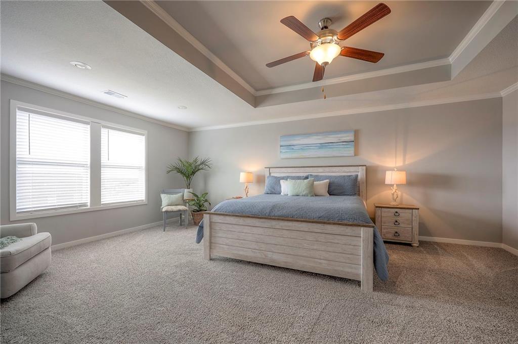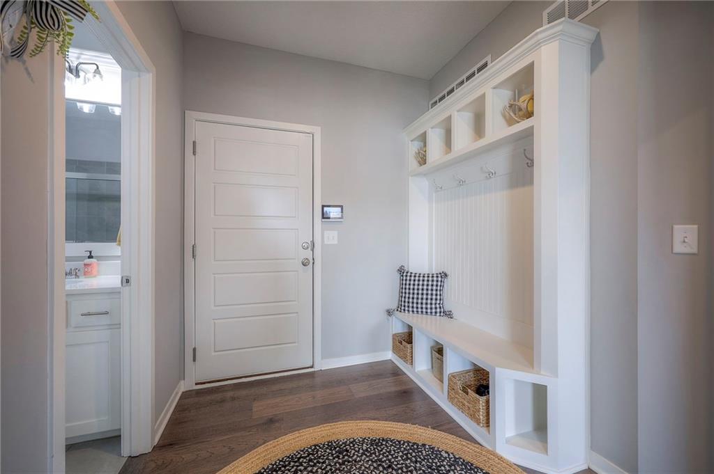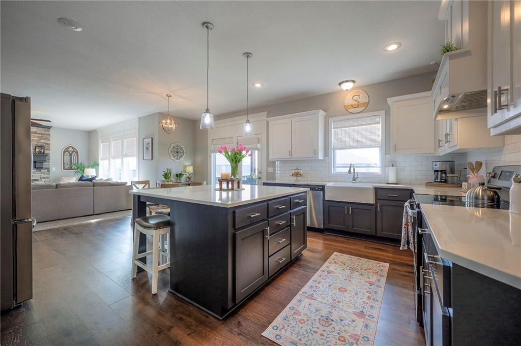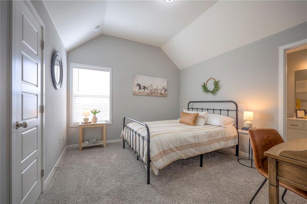 Move In Ready - with full landscaping, window blinds, metal fenced yard and screened porch with added stairs to get to yard (all items new construction does not come with) - This popular Levi II by Prieb Homes faces West, giving you ideal summer deck parties in the shade. Spacious entry, with formal dining room to left, and first floor 5th bedroom/office/flex room includes a closet and 3/4 bath. A must see open great room with fireplace and oversized windows streaming in tons of natural light. Bright kitchen includes center island, granite countertops, custom cabinets with upgraded hardware and soft close drawers & doors, built in microwave, large walk in pantry, stainless appliances and breakfast room. Beautiful hardwood floors throughout the entry kitchen and breakfast room. Second floor features 3 more bedrooms with walk in closets. Two bedrooms with Jack & Jill bath, and one bedroom has its own private bath, A beautiful private primary suite with vaulted ceiling and natural light through the windows. This spacious bedroom includes a cozy sitting area and huge walk in closet. The spa-like bath features double granite vanity, tile floors, walk in shower and separate soaking tub. The oversized walk in closet leads to the laundry room with folding table and room for your baskets. Also, attached to the hallway, it is a convenient laundry room for all. Another great feature is a storm room which gives a great peace of mind during a storm. Tons of storage in the unfinished basement. Prairie Farms is adjacent to the newly renovated Lake Olathe. Offering a large community pool, cabana, playground and walking trails, Prairie Farms is a great place to call home!