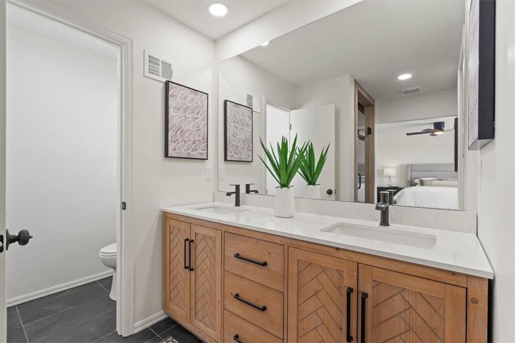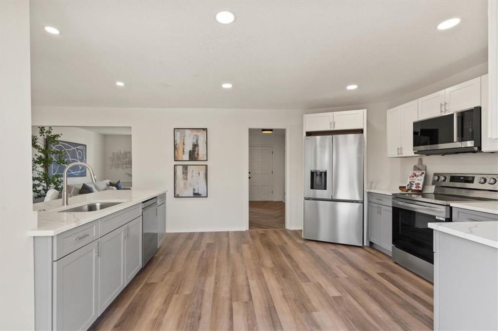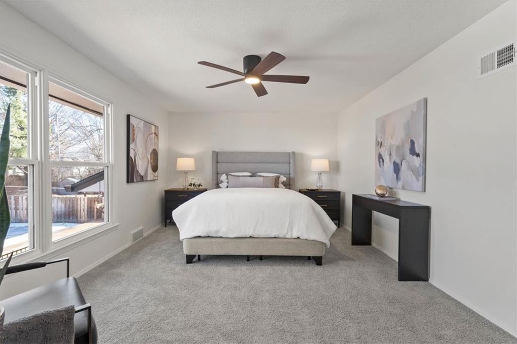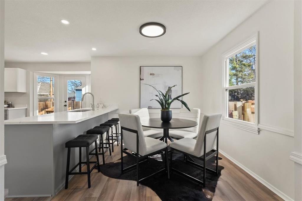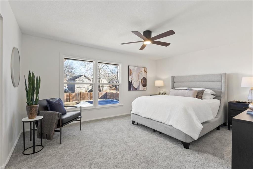 Fully renovated from top to bottom, this stunning home has been thoughtfully reimagined with elevated finishes, a fresh layout, and a backyard that feels like your own private resort. From the moment you arrive, the updates shine—new roof, new exterior paint, new gutters, and striking black-framed windows create a bold first impression. Inside, herringbone luxury vinyl plank flooring welcomes you at the entry and flows into wide-plank LVP throughout the main living spaces. Fresh interior paint, curated lighting, and a redesigned floor plan create a bright, modern feel. The main living room is filled with natural light from oversized windows and opens seamlessly into the kitchen, featuring quartz countertops, modern two-tone cabinetry, and brand-new LG smart appliances. A cozy breakfast nook and direct backyard access make entertaining effortless. Upstairs, the primary suite is a true retreat with a spacious walk-in closet and a beautifully finished bath with double vanity and oversized walk-in shower. Two additional bedrooms share a brand-new full bathroom. The lower level offers a second living space with a brick fireplace, wet bar, half bath, laundry room, and walkout access to the backyard—plus a finished fourth bedroom one level below, perfect for guests, a home office, or flex space. Step outside to enjoy a resurfaced pool with Cool Deck, a brand-new deck, and a privacy-fenced yard designed for relaxing and hosting. Enviable highway access and just minutes to Oak Park Mall and the shops, dining, and amenities of 95th Street—plus award-winning Shawnee Mission Schools—make this turn-key home a rare find.