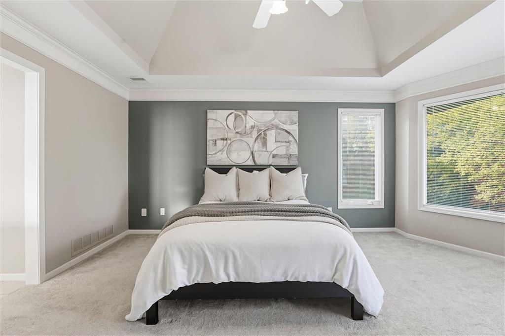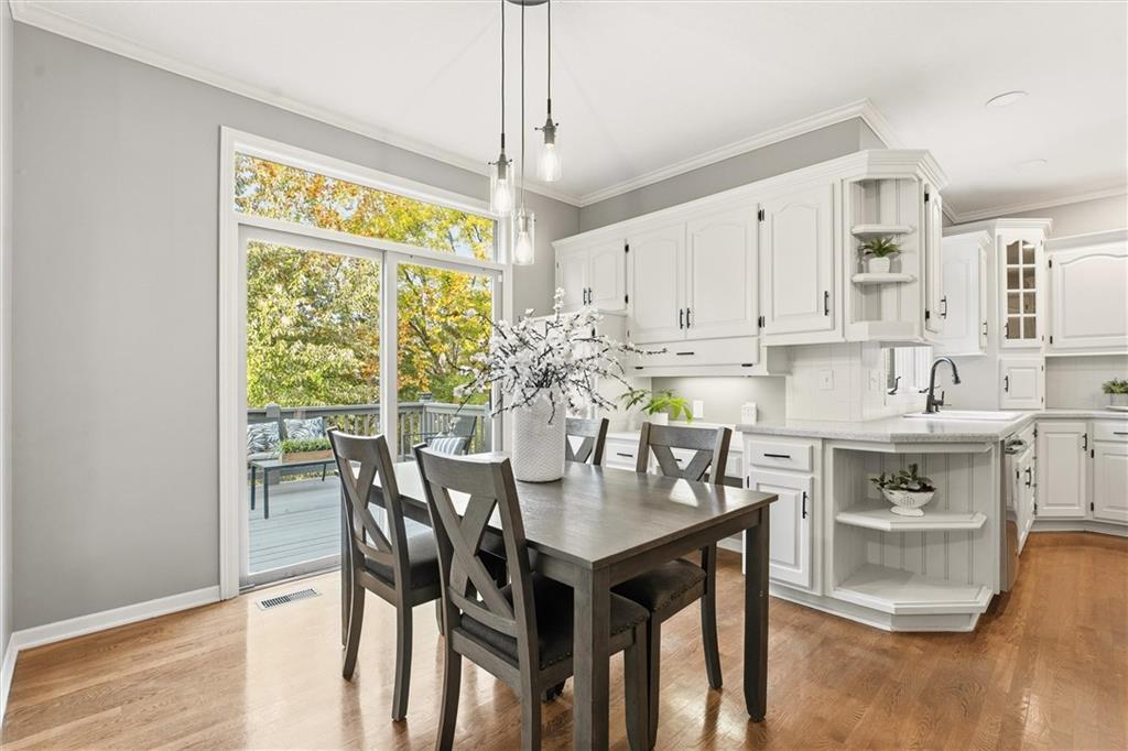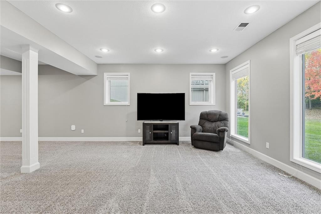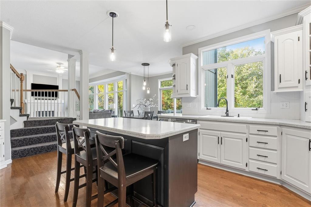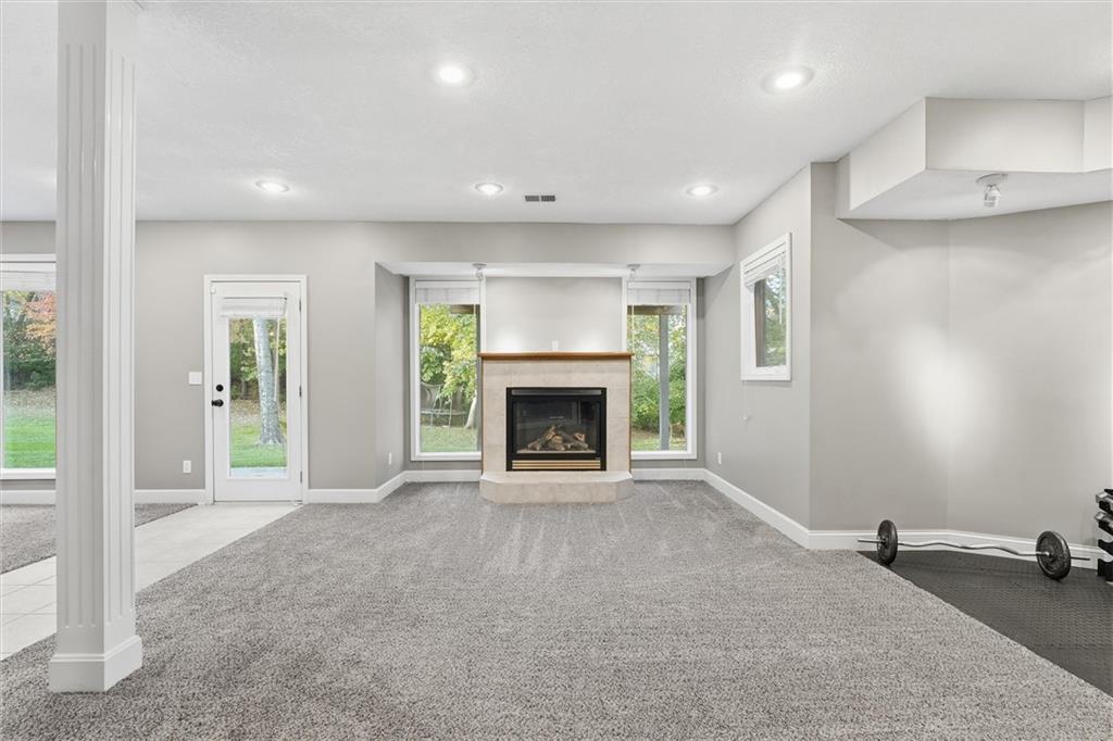 Beautifully Updated 2-Story in Coveted Riss Lake! Perfectly positioned on a quiet cul-de-sac, this home offers the ideal blend of comfort, style, and thoughtful updates throughout. The main floor features an open layout with seamless flow between living, dining and kitchen spaces. The living room features a cozy fireplace and tons of natural light from the floor-to-ceiling windows. The spacious kitchen offers wrap-around counters and cabinetry, a large island, built-in hutch, and an open dining area that leads out to the upper deck — perfect for entertaining. The main floor is completed by a formal dining room, private home office, and a convenient laundry room just off the garage, thoughtfully designed for everyday ease. The upstairs primary suite enjoys its own elevated, private level and includes a walk-in tiled shower, jetted tub, and dual vanities. Each of the three secondary bedrooms includes a walk-in closet and convenient bathroom access, with one offering a private ensuite and the other two sharing a Jack-and-Jill bath. Designed for entertaining, the finished lower level features a spacious family room with fireplace and custom built-ins, open rec space, and a wet bar. A full bath and walk-out access to the patio and tree-lined backyard complete this beautiful extension of the home. Additional highlights include a 3-car tandem garage and beautiful mature trees surrounding the property. Enjoy the exceptional Riss Lake community with lake access, pools, tennis courts, and trails — all from a peaceful cul-de-sac location.