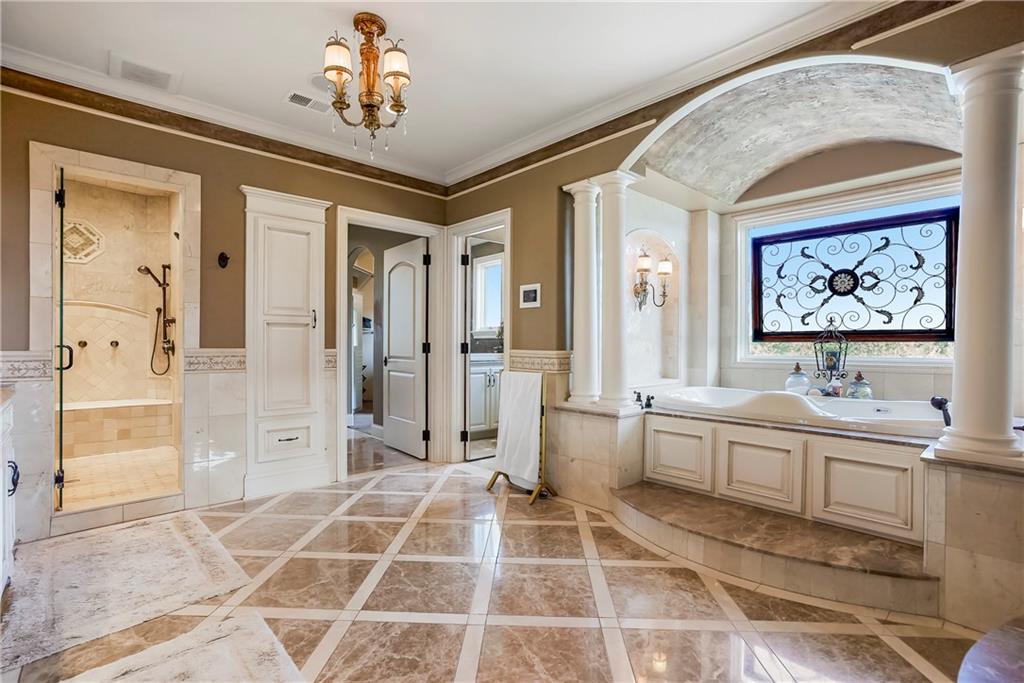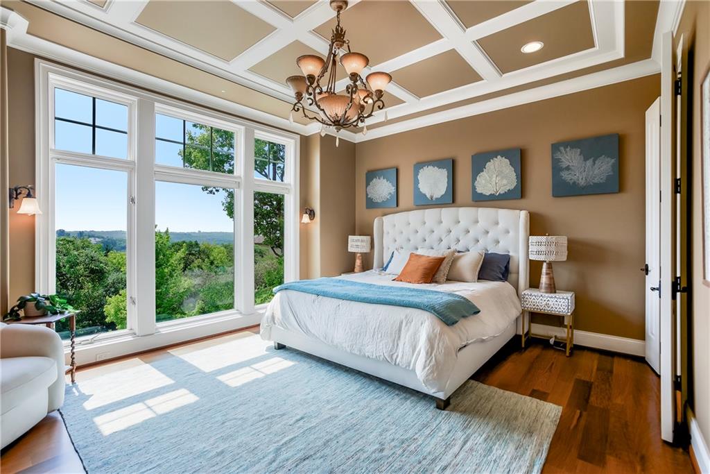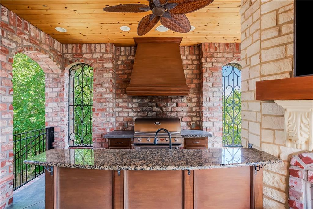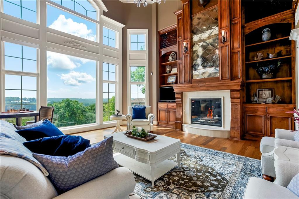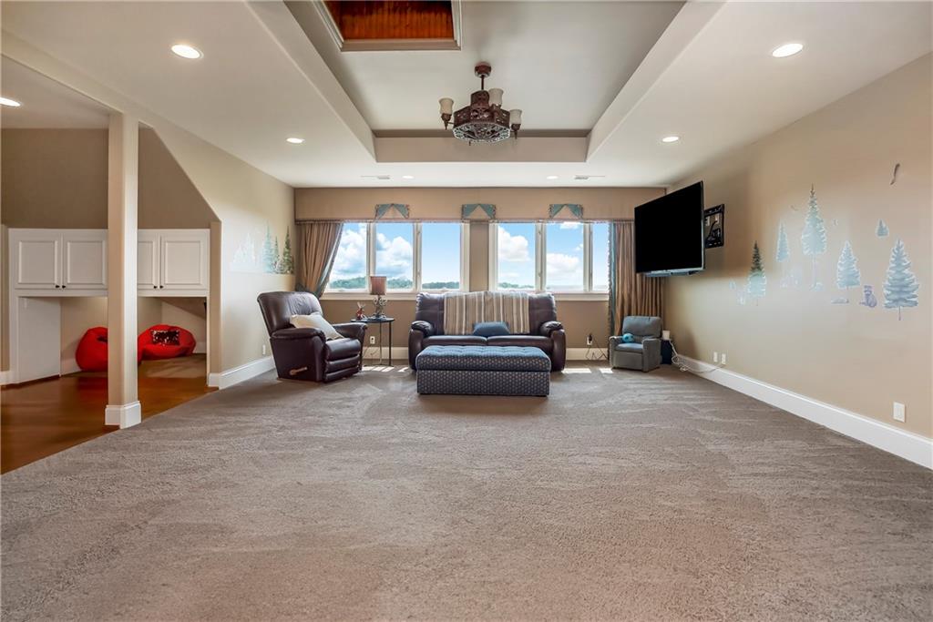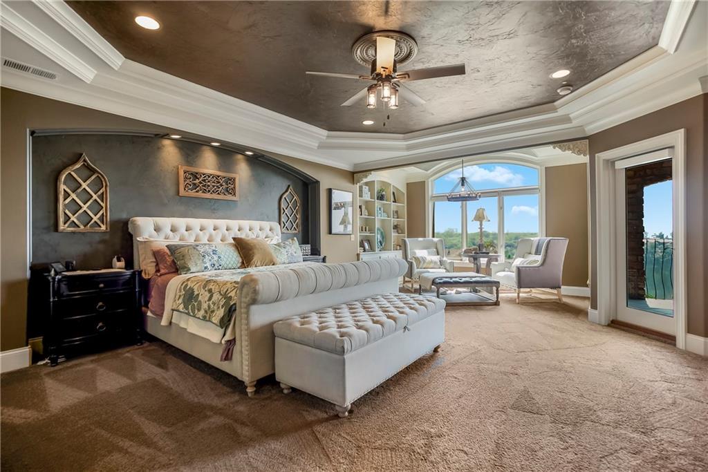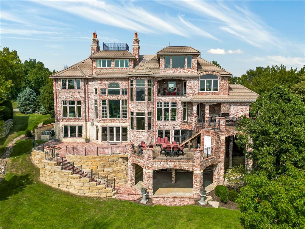 Incomparable custom home designed by Scott Bickford & meticulously built by Charles Kraft. Spectacular views of Shadow Lake & long vista's overlooking the Cedar Creek valley! Recent updates include a completely modernized theater room, new light fixtures & electronics. This phenomenal 5 level property features extensive Brazilian cherry hardwood floors & extensive heated floors as well! Main floor includes a stunning 2-sty Great rm. w/FP, formal dining, Den w/FP, spacious guest suite & casual dining. Dream kitchen features 3 Gaggenau ovens, separate wood front Bosch fridge & freezer, huge walk-in pantry & mud room, twin GE Profile DW's & a 6-burner gas Dacor range! 2nd floor features a spectacular primary suite w/marble bath & FP, custom walk-in shower, expansive walk-in closet, exercise rm., sitting rm., w/adjoining covered deck. Built-ins include a dry-cleaning unit, mini fridge, DW, microwave & make-up vanity w/sink! Three spacious bedrooms all w/private baths & walk-in closets share a versatile loft space. The 3rd floor boasts a large recreation/game rm. & home office, both enjoy the most dramatic views! The finished walkout LL begins with a large Family rm w/stone FP, walk-behind wet bar w/triple Sub Zero fridge/freezer/wine cooler, Meile beverage center, Game rm, 2 additional guest bdrms., full bath, walk-in safe rm & a 22 x 19 tiered Home Theater retreat! Basement level 30' x 25' indoor basketball court w/20 ft. ceilings & climbing wall, which could also be utilized as a golf simulator space, 1/2 pickleball or volleyball court! Over 1,000 sq ft of outdoor paver brick & stained concrete patio space, covered outdoor kitchen & deck w/FP, & plenty of backyard space w/infrastructure in-place to add a swimming pool. Tile roof, circle driveway, exterior constructed with a mix of 100-year-old Coffeyville brick & native limestone. Note: Potential option to enroll children in the Olathe School District if preferred & also close proximity to St. James high school.