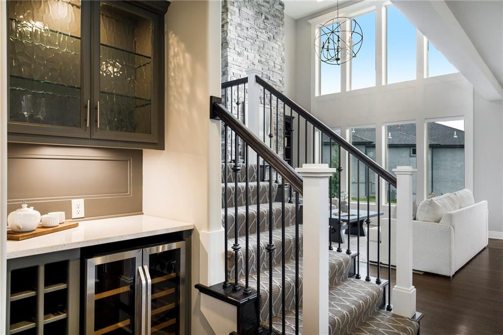 Experience luxury living in WatersEdge, one of Overland Park’s premier communities known for its serene waterscapes, resort-style pool, and clubhouse — all located within the award-winning Blue Valley School District. This stunning Bailey two-story by Roeser Homes offers approximately 3,300 square feet of thoughtfully designed space, featuring four bedrooms and three and a half bathrooms. A pair of elegant double front doors welcome you into a warm and inviting interior that includes a formal dining room, a home office with custom built-ins, and rich hardwood floors throughout the main level. The soaring two-story hearth room showcases a dramatic stone fireplace, while a separate great room offers an additional fireplace, creating multiple cozy gathering spaces. The gourmet kitchen is beautifully appointed with stainless steel appliances, double ovens, a center island, and a custom bar complete with a wine cooler and wine rack. Upstairs, a split staircase leads to the luxurious primary suite, which includes a private sitting area with fireplace, a spa-like bathroom with an oversized shower, jetted tub, and dual vanities, and an expansive walk-in closet with convenient access to the laundry room. Three secondary bedrooms offer spacious walk-in closets, vaulted ceilings and one has an ensuite bath while the other two share a Jack and Jill bath. Outdoor living is just as impressive featuring a covered patio with a fireplace—perfect for entertaining or quiet evenings at home. Additional features include additional outlets built-in ProSlat wall hanging system in the three car oversized garage, an unfinished basement stubbed for a bath and a wet bar, and a mirrored wall for a workout space. Enjoy new fresh interior paint and numerous high-end upgrades including extensive elegant millwork around all windows, a Sonos audio system with ceiling speakers, plantation shutters, a security system and a sprinkler system. This home is a true reflection of pride in ownership.