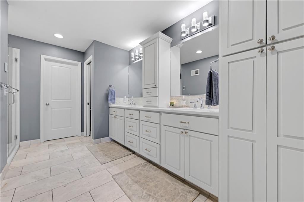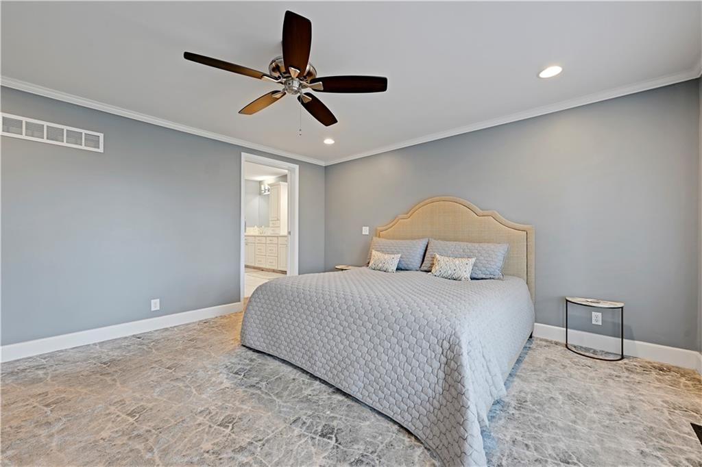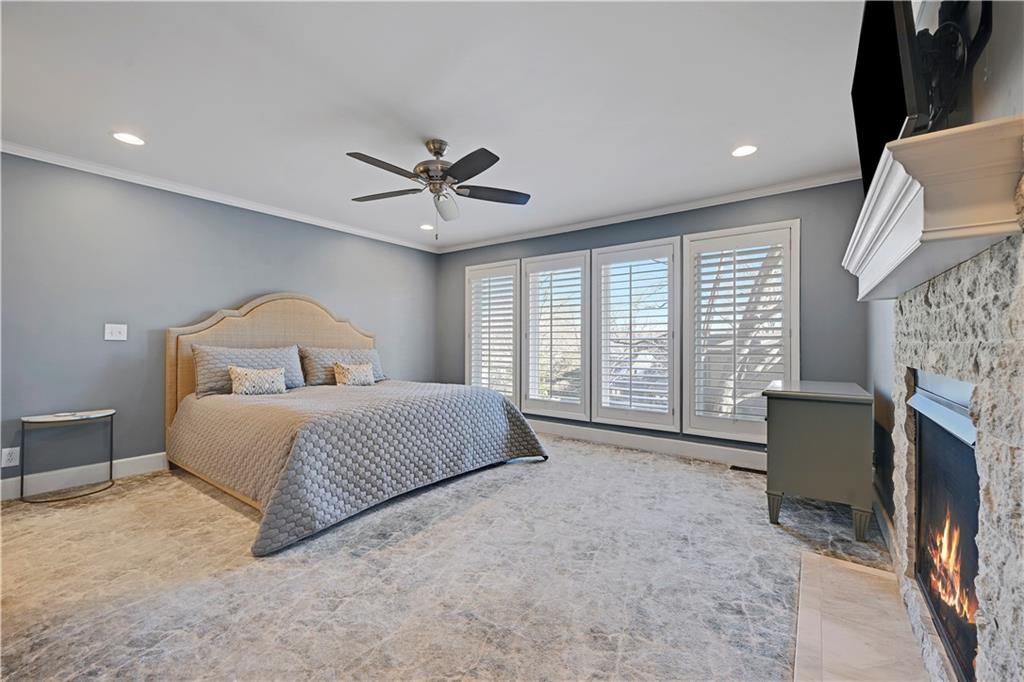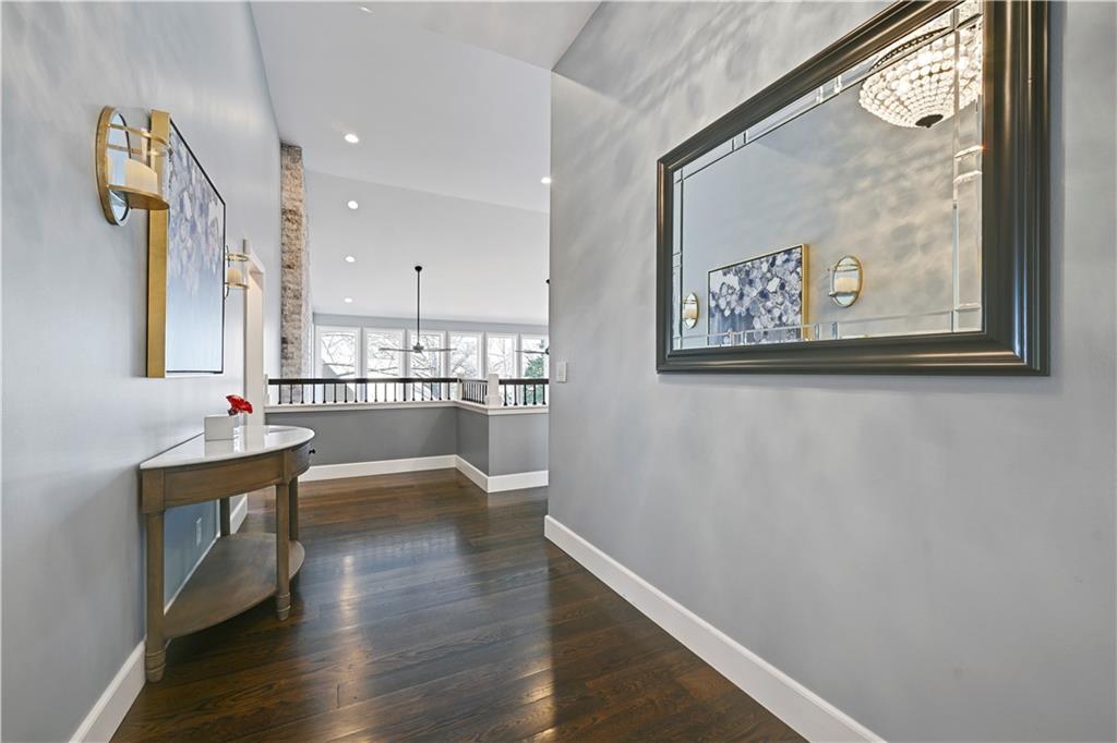 Incredible, totally updated custom contemporary home in Longwood Forest! This one-of-a kind reverse offers 4 bedrooms and 4.5 baths and truly shows like a model home! Charming main level living features a stunning gourmet chef's kitchen with quartz countertops, stainless steel appliances, and a spacious eat-in breakfast area, perfect for entertaining family and friends. Enjoy cozy gatherings in the four season room with tiled floors, abundant windows, and access to a convenient deck ideal for grilling. Beautiful hardwood floors throughout. The elegant dining room showcases a striking light fixture and opens to a darling composite deck! The inviting living room features a warm fireplace for relaxing evenings. The main level also includes a versatile secondary bedroom or home office with a fabulous full bath. The luxurious primary suite boasts brand new carpet and a spa-like en suite bath with heated marble floors. Plantation shutters throughout add timeless elegance. The expansive lower level is an entertainer's dream, featuring built ins and a dramatic floor to ceiling stone fireplace, two spacious bedrooms with accompanying baths plus a large recreation room complete with bar, wine area and space for a pool table and more.. Step outside to the screened-in lower-level porch, perfect for watching the big game! This spectacular home is convenient to shopping, restaurants, and highways! A rare opportunity in an exceptional neighborhood! Don't miss the truly one of a kind home!