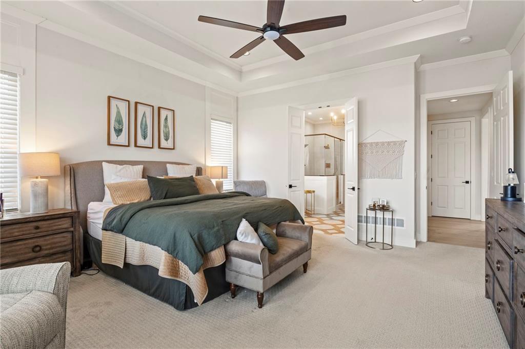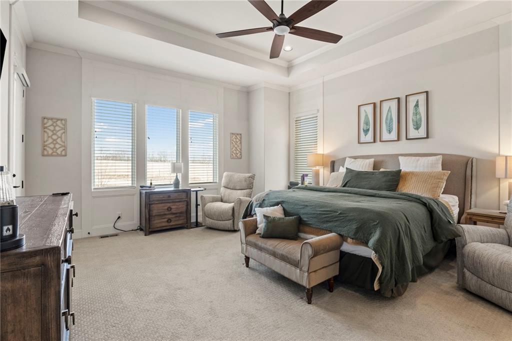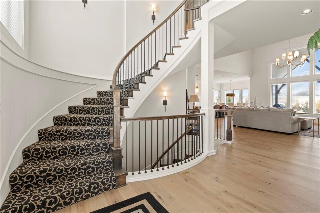 Popular 1.5 Story Hamilton by BICKIMER HOMES in a cul-de-sac backing to GREENSPACE! Full of upgrades include iconic circular staircase, a GRAND TWO STORY GREAT ROOM full of windows, large covered patio that walks out to a spacious level yard backing to green space and trees, elegant curved stairs, MAIN FLOOR PRIMARY SUITE w/ large DOUBLE WALK-IN CLOSETS, unique main level FLEX ROOM/OFFICE just off the kitchen, spacious kitchen with large prep pantry. Three bedrooms upstairs, each with private ensuite baths plus an OVERSIZED BONUS LOFT UPSTAIRS! FINISHED BASEMENT with large recreational room, wet bar and bedroom. TWO LAUNDRY ROOMS (main floor laundry and second floor laundry) to accommodate busy family lifestyle! Future MEDIA ROOM stubbed out or use as addtl storage. Century Farms is a new upscale community located on a rolling hillside in Overland Park. Resort style swimming pool with slide, stunning club house with fitness room, kids play area, community vegetable garden, and pickle ball courts! Blue Valley Schools in Overland Park just off Quivira at 167th Street.