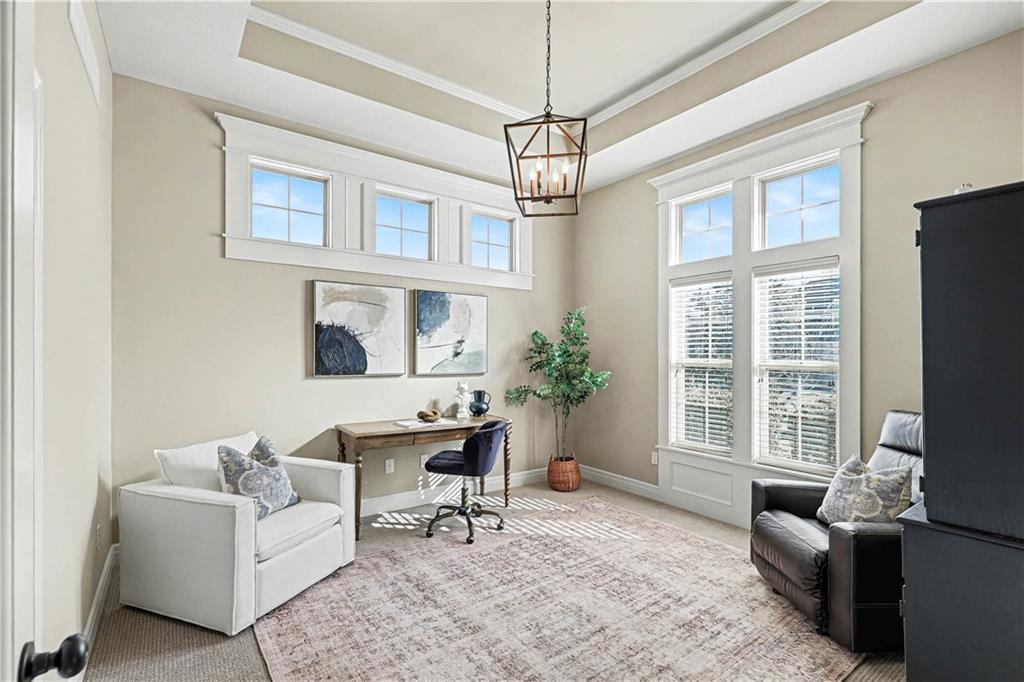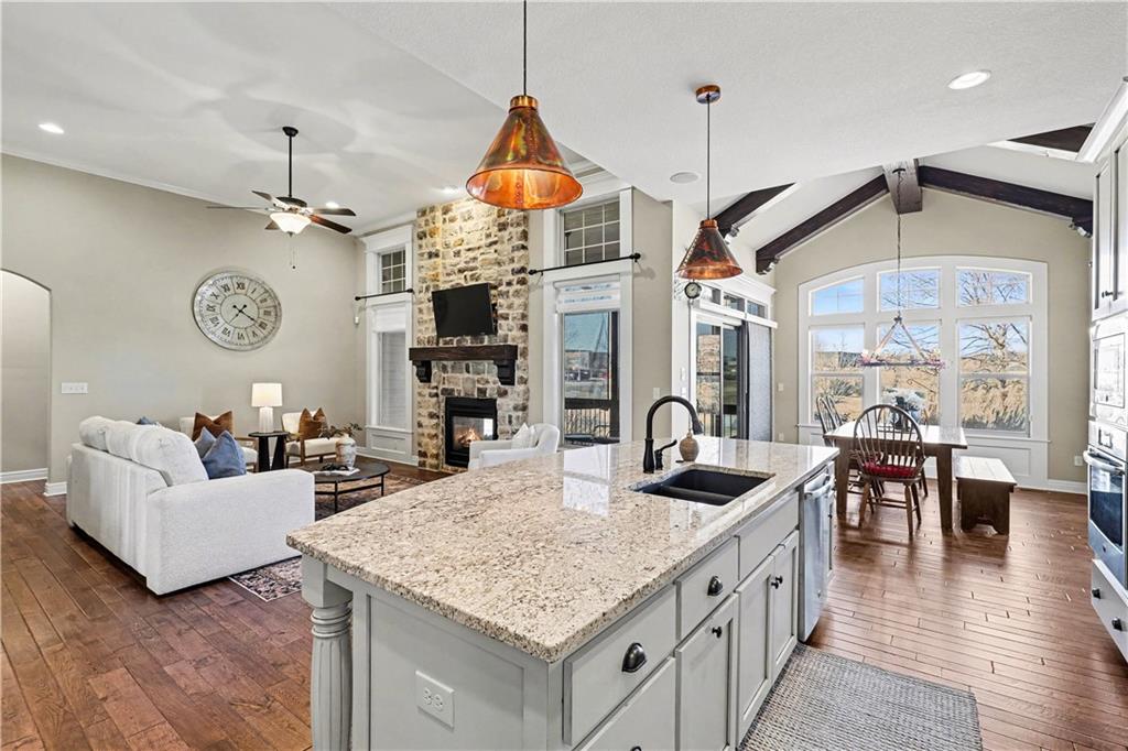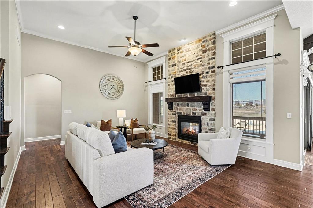 Welcome to 9158 W 178th Terrace, a beautifully maintained Emery Expanded 1.5-story home by James Engle Custom Homes, located on a quiet lot with pond views in the desirable Arbor View subdivision. This elegant home offers 6 bedrooms, 4.5 baths, and a 3-car garage, with an open, light-filled layout and upscale finishes throughout. The gourmet kitchen features granite countertops, a large island, stainless steel appliances, and a walk-in pantry. The main level includes a private primary suite with a spa-like bath and direct access to the laundry room, plus a flexible bedroom or office. Enjoy outdoor living on the covered patio with a fireplace overlooking the beautifully landscaped yard. Upstairs offers spacious bedrooms and a loft, while the finished lower level includes a recreation area, a sixth bedroom with egress, a full bath, and ample storage. Premium upgrades, including trim work, whole-home audio, and landscaping, make this move-in-ready home a must-see in prime Overland Park!