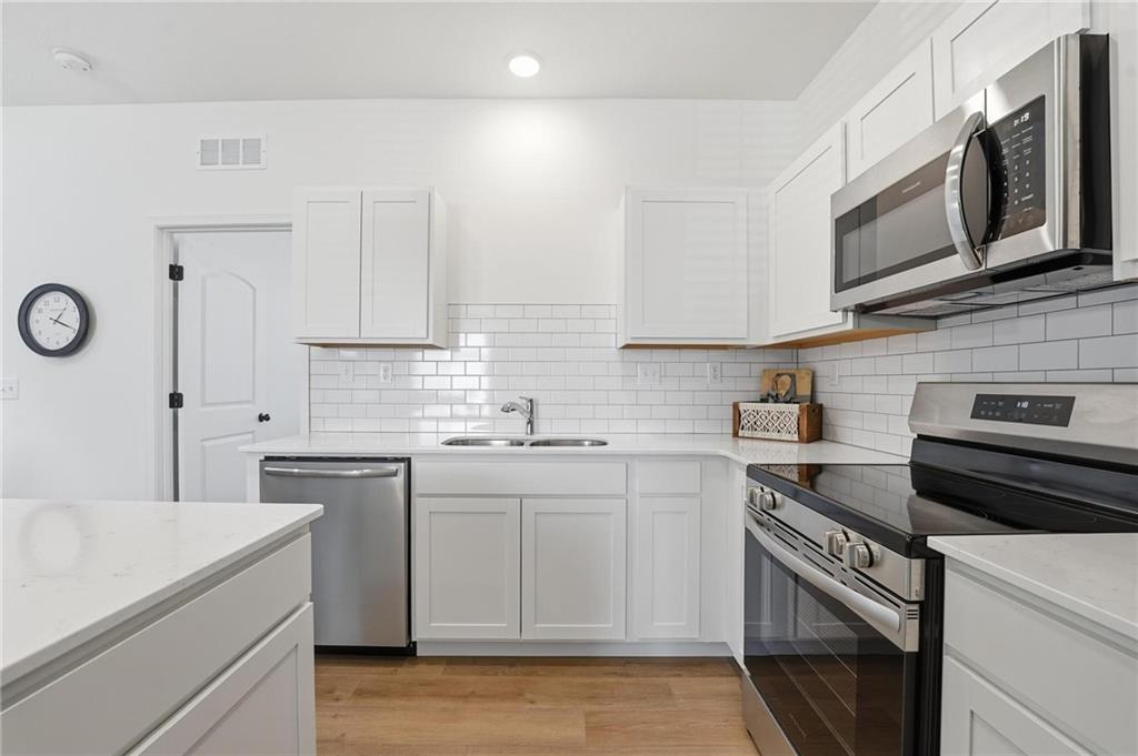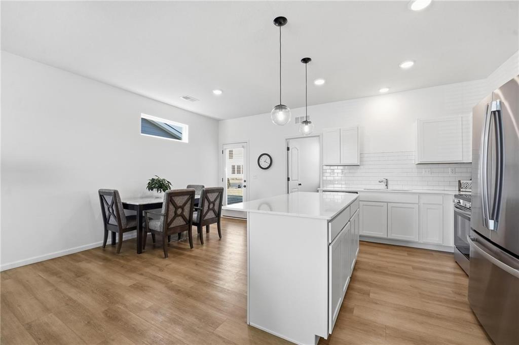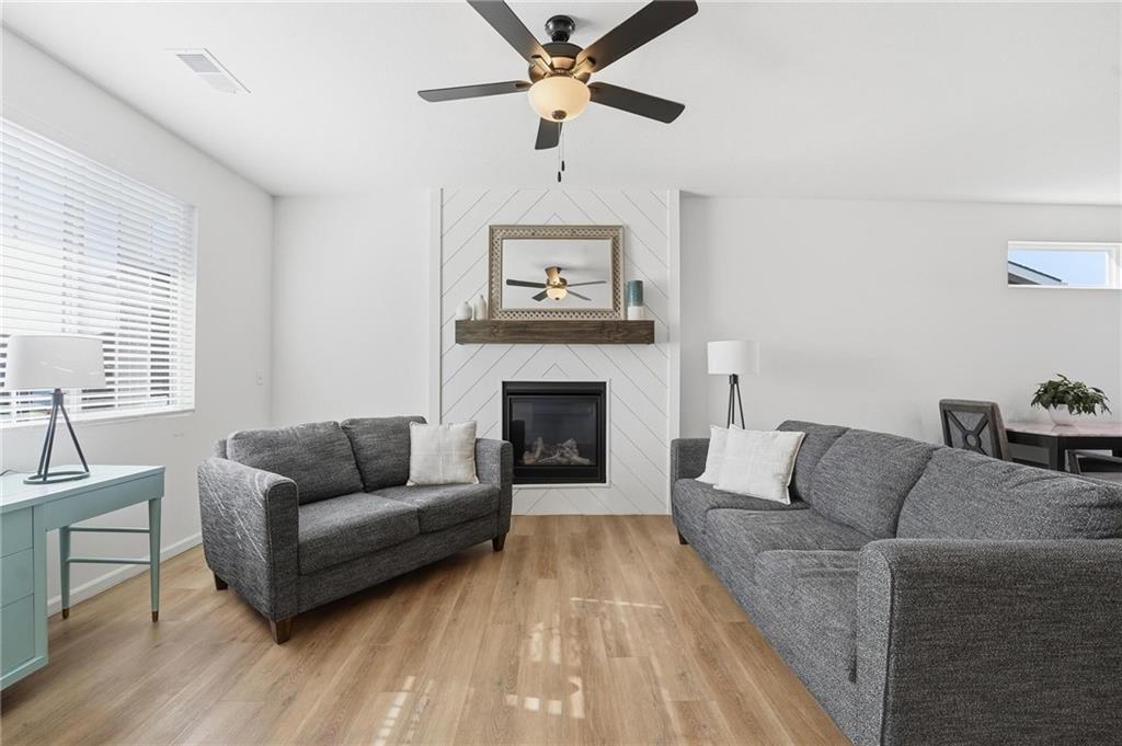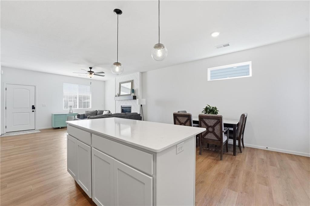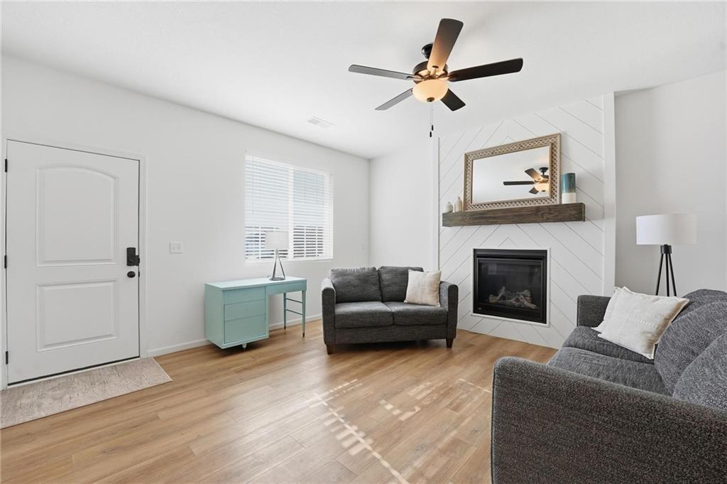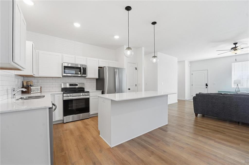 Better than new - UPGRADES and priced well below reproduction! Gorgeous ranch is open and bright. Welcoming front porch offers opportunity to sit out front. Through front door, open living space with clean white walls, shiplap surrounds the gas fireplace! Kitchen has large center island, upgraded QUARTZ countertops, subway tile backsplash, stainless steel appliances and great pantry! Spacious dining area has large window allowing natural light. Full glass door out to covered patio & level backyard. The primary suite is at the back of the home for quiet privacy. Large bedroom has high ceiling, fantastic walk-in closet! The private bath has double vanity, huge shower, LVP flooring. There are 2 additional bedrooms on other side of home, with walk-in closets! The hall bath has same LVP flooring (looks like wide plank wood), shower/tub. Spacious laundry room on the main level has great storage space. The 2 car garage has upgraded garage door opener! Why wait and build, and spend a lot more, when this beautiful home is ready NOW.