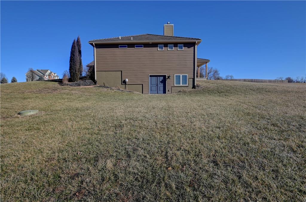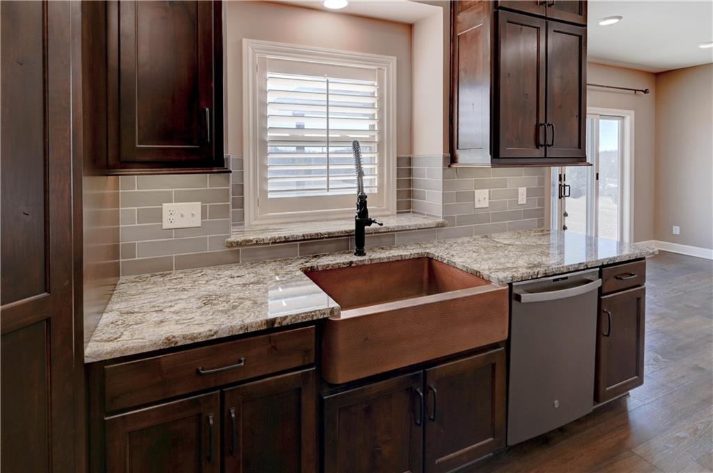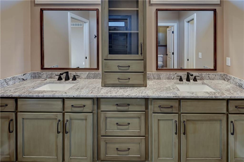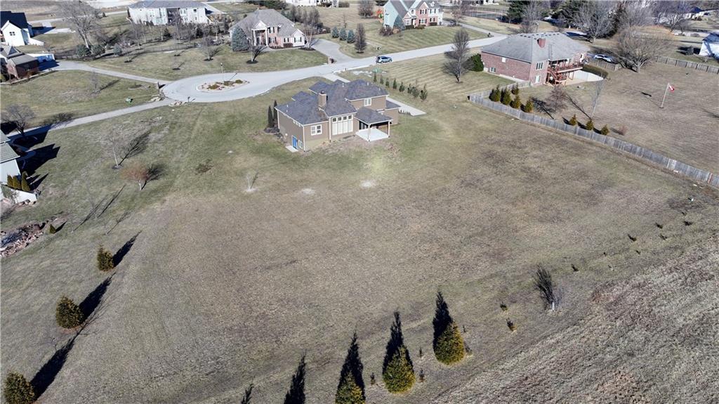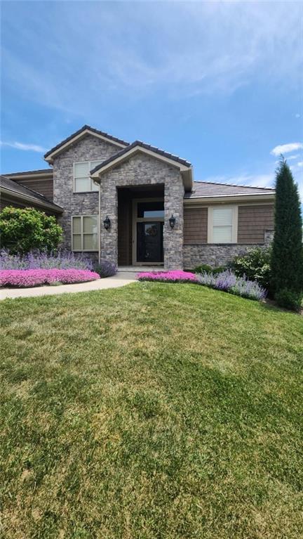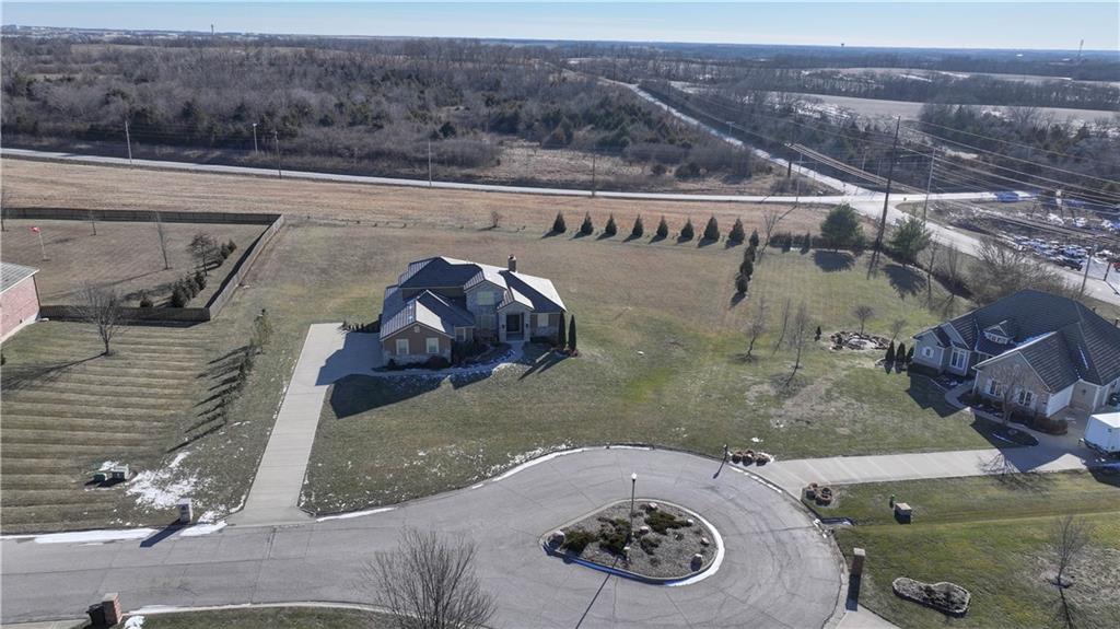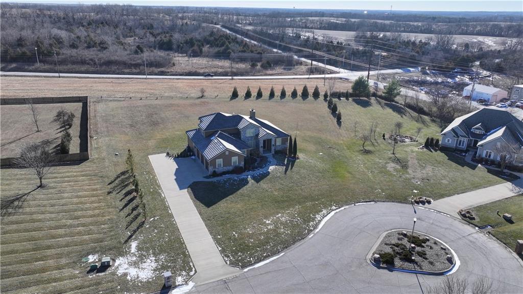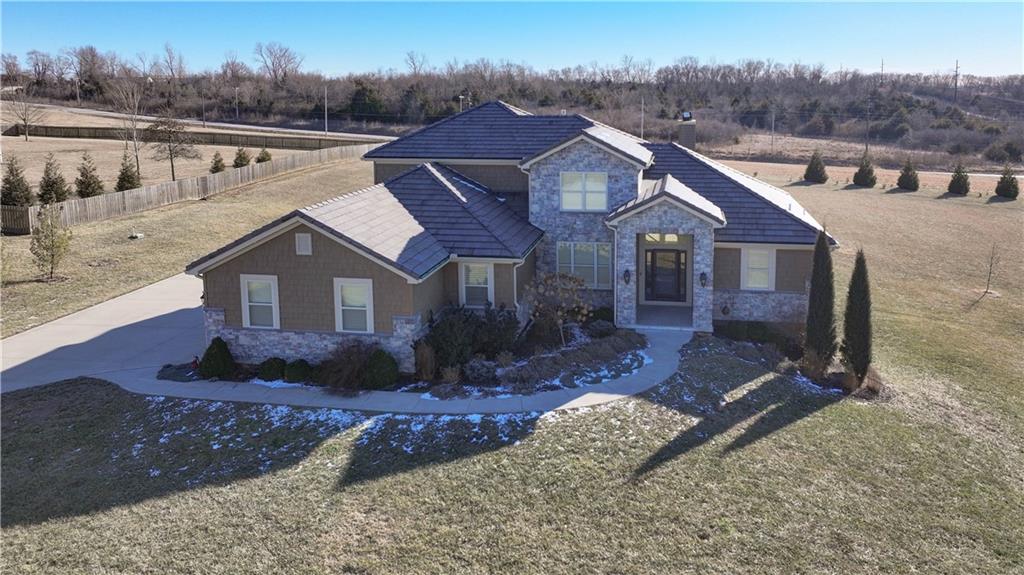 Stunning custom-built Jay Jackson home offering quality craftsmanship and timeless design on 1.5 beautifully landscaped acres. The oversized three-car garage features individual doors, larger bays, workshop space, and a wash sink. A spacious mudroom includes stone paver flooring, seating cubbies, folding area, broom closet, and laundry with cabinets. Hardwood floors flow through the kitchen, dining, and great room. The kitchen is designed for entertaining with GE Profile gas range, custom stained cabinetry, painted oversized island, granite countertops, copper farmhouse sink, and a large walk-in pantry. The dining area opens to a covered patio with ceiling fan. Plantation shutters throughout. The great room features a floor-to-ceiling stone fireplace and exposed beams. A custom half bath adds charm. The office offers wood floors, built-ins, and French doors, ideal for a flex or TV room. The entry showcases a striking light fixture, and the covered front porch is accented with stone. The main-level primary suite includes carpet, ceiling fan, exposed beams, walk-in closet, and master bath with double granite vanities and tiled shower with bench and dual shower heads. The upper level includes a large loft (possible 4th bedroom), two bedrooms with walk-in closets, and a Jack-and-Jill bath. The walk-out lower level is unfinished, plumbed for a bath, and offers excellent expansion potential. Additional highlights include a tile roof, stone and Hardy board siding, and beautiful seasonal landscaping.
