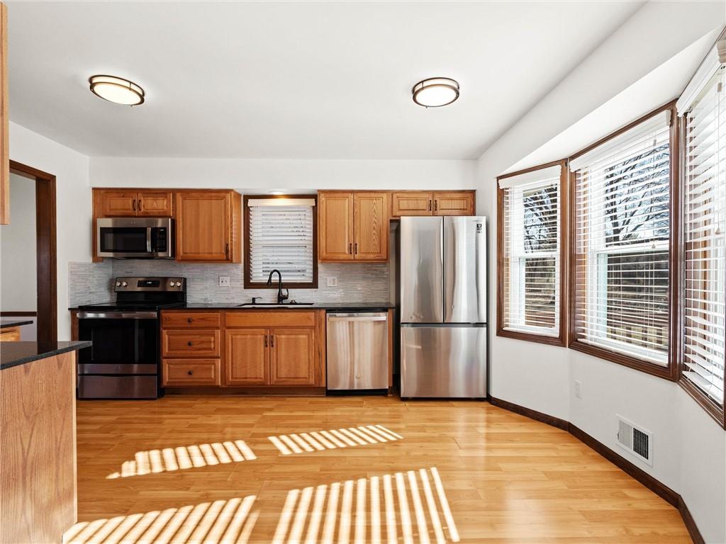 Prepare to fall in love with this meticulously maintained raised ranch that’s been pampered from head to toe. From the moment you pull up, you’ll appreciate the excellent curb appeal, one year old architectural roof, newer garage doors, and crisply poured concrete driveway and extra wide stairs leading up to the front porch. Step inside to find a home that perfectly balances "fancy dinner party" vibes in the formal rooms with "kick back and relax" energy in the family room, where vaulted wood-beamed ceilings and a crackling fireplace steal the show. The kitchen is a total standout with its shimmering glass backsplash, granite counters, and shiny newer appliances that are just waiting for your first home-cooked meal. Retreat to a primary suite—complete with a gorgeously remodeled bathroom featuring a spa-like shower—or head downstairs to discover a basement that’s ready for movie marathons. If you’ve been dreaming of a space for your side hustle, the garage-adjacent hobby room with its own sink is a total game-changer for crafters, stylists, or remote workers. Top it all off with a massive, fenced-in backyard featuring a "party-ready" expanded deck and a sprinkler system to keep your lawn the envy of the block, and you’ve got a home that’s as fun as it is functional! Enjoy peace of mind with the big items taken care of for you including newer windows throughout, freshly scraped ceilings, and one year old roof. Schedule your private showing NOW & see what makes this home truly exceptional!
