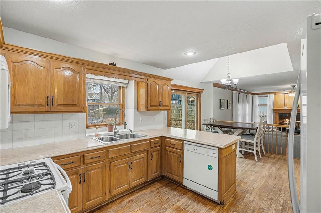 Step into a home where architectural detail and warmth come together, beginning with a stunning foyer that sets the tone for what’s ahead, a beautiful wooden staircase, featuring an open catwalk-style overlook! Turning into the front room, you’ll find plenty of natural light filling the space, creating a bright and welcoming atmosphere. Moving into the kitchen, classic wood continues through the cabinetry, offering warmth and timeless appeal. This area provides convenient access to the laundry room and a half bath, perfect for guest use. Just beyond, the dining room showcases vaulted ceilings and abundant natural light streaming through a sliding glass door that leads to the backyard. A short step away, the living room features a charming wood-detailed fireplace along with additional windows that enhance the cozy yet open feel. A two-car garage completes the main level. Upstairs, the open hallway overlooks the main level below, adding to the home’s spacious design. The primary bedroom is generously sized and filled with natural light. The primary bathroom is a true retreat, featuring a soaking tub, separate shower, dual sinks, and a walk-in closet. Three additional bedrooms and a full bath complete the upper level. In the basement, you’ll find a recreation room ready to be customized to your needs, whether a man cave, kids’ play area, or movie room. Outside, the fenced-in backyard offers a beautiful brick patio, ideal for grilling, relaxing, and enjoying time with friends and family. From quiet mornings to lively gatherings, this home is ready to support every stage of life!!