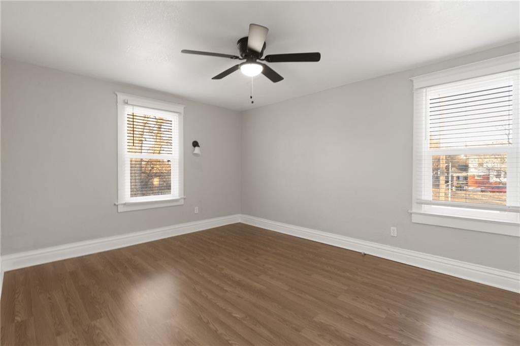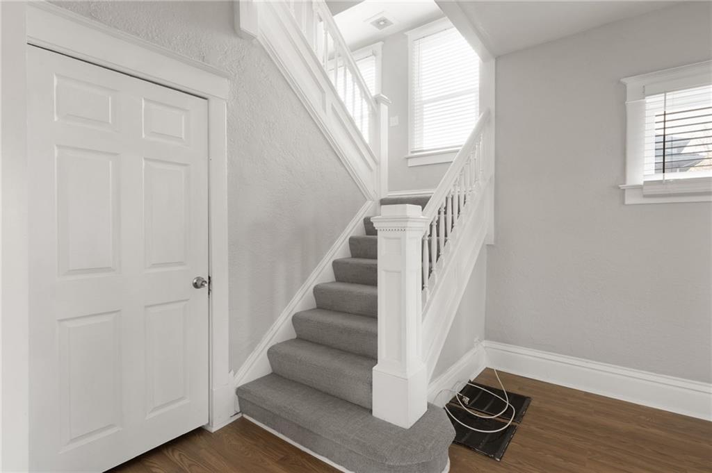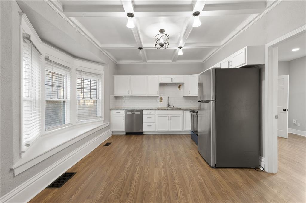 Step into this beautifully updated home where every detail has been thoughtfully refreshed. The bright, open foyer welcomes you with gleaming hardwood floors, soaring ceilings, and an elegant staircase that sets the tone for this stunning property. Natural light pours through oversized windows, highlighting the fresh neutral paint and crisp white trim throughout. The heart of the home features a completely renovated kitchen with white shaker cabinetry, sleek granite countertops, modern subway tile backsplash, and stainless steel appliances—perfect for both everyday living and entertaining. Retreat to the spa-like bathroom showcasing designer marble-look tile flooring, modern fixtures, and a dramatic black accent wall in the shower/tub area that creates a striking contemporary feel. The spacious backyard offers mature trees and endless potential for outdoor enjoyment. This home combines classic architectural charm with modern updates—truly a rare find that's move-in ready and waiting for you!