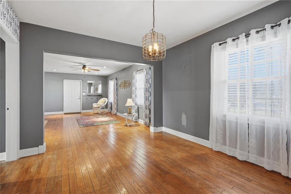 Spacious 3-bedroom, 1-bath ranch offering 1,300+ sq ft of finished living space on a large corner lot in the heart of Richmond, MO. This home features a large living room with a wood-burning fireplace and original hardwood floors throughout, plus a formal dining room and updated kitchen that make everyday living easy and entertaining even easier. The bathroom includes a double-vanity and tiled shower, while laundry hookups both upstairs and downstairs provide flexible living options. Vinyl replacement windows improve efficiency, and ample closet space—plus an unfinished attic area for additional storage. Outside, enjoy a big inviting front porch, along with a spacious fenced yard, deck, and concrete patio—perfect for relaxing or hosting friends. Conveniently located in town with quick access to the highway and close to shopping, dining, and schools. This one checks all the boxes.