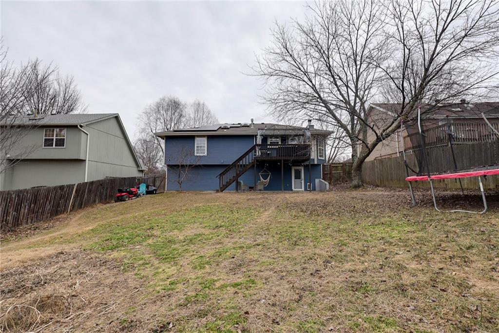 Welcome HOME to this spacious and sun-filled 3-bedroom, 2.5-bath beauty tucked away on a quiet cul-de-sac in the highly sought-after Blue Springs School District. Designed for both comfort and connection, this home features FRESH PAINT and thoughtfully laid-out main level with laundry conveniently located near all bedrooms and a generous primary suite complete with an en-suite bath and ample closet space. All bedrooms are well sized, offering room to grow, relax, and recharge. Natural light pours through large windows throughout the home, creating a bright and inviting atmosphere from morning to evening. The spacious dining room flows seamlessly into the light-filled living room and warm, welcoming kitchen, making it ideal for lively family gatherings and unforgettable conversations.The large high deck adds even more space for family and friends to enjoy the outdoors. Downstairs, enjoy a large second family room, a dedicated home office, and a walkout to the expansive, fully fenced backyard—perfect for entertaining, playtime, or peaceful evenings outdoors. Step outside to the large covered patio, extending your living space even further. The large fenced in yard gives ample space for kids and pets to safely run. This HOME is as SMART as it is Beautiful, featuring 15 solar panels for incredibly low electric bills and a reverse osmosis water system delivering clean, crisp, great-tasting water every day, not to mention some updates and fresh paint through the home. Location is hard to beat—walking distance to the elementary school, just a block or two from multiple parks and soccer fields and walking trails and minutes from dining, shopping, and entertainment, and quick highway access while still feeling tucked away in a hidden neighborhood. A RARE blend of space, efficiency, location, and lifestyle—this is the kind of home where MEMORIES are made and futures are built. COME CHECK IT OUT TODAY!!!