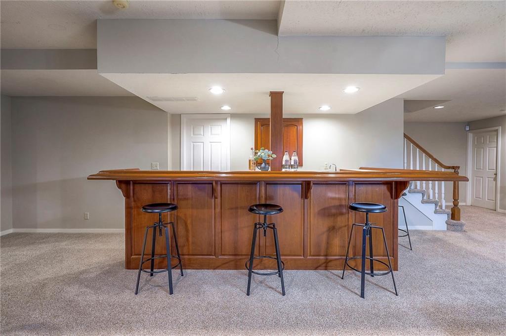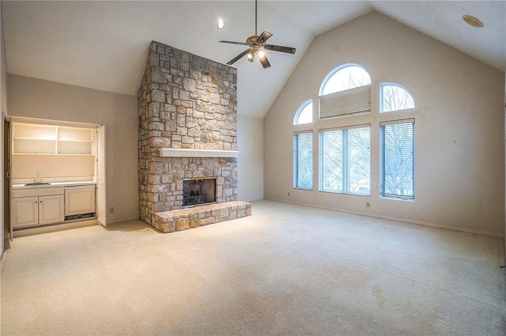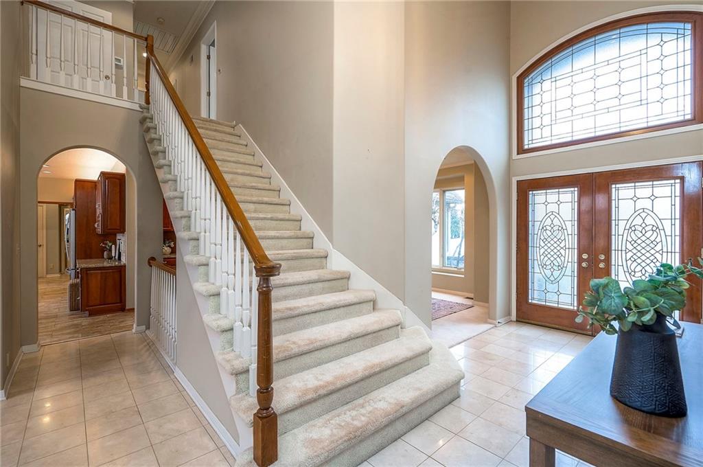 Welcome to this expansive and well-built 1.5-story home offering 4,224 square feet on the main & second floors, plus a large finished walkout basement with 1,500 finished square feet. The home sits on a beautifully landscaped lot in a prime Overland Park location. You’re greeted through a leaded glass front door from a charming courtyard into an impressive two-story entry, where a nearby three-story fireplace anchors the home & immediately showcases its grand scale. The main level features a spacious living room with wood beams, a fireplace & abundant natural light. A large formal dining room easily accommodates entertaining on a grand scale. The kitchen boasts several high-end Wolf appliances & a four-burner gas stove with a griddle. Just off the kitchen is an exceptionally large laundry room. The main-floor primary suite features a vaulted ceiling, generous closet space, and an en-suite bath with separate tub and shower and extensive storage. The second floor offers three very large bedrooms, excellent closets, and two and one-half bathrooms. The half bathroom could potentially become a second laundry room. There is also a bonus room featuring a wet bar, a fireplace and a large vaulted ceiling. It has the potential to serve as a second primary suite. The finished walkout basement is designed for entertaining, with a large bar, multiple gathering areas, wine storage, an additional bedroom and full bath, and access to a spacious patio. There is also significant unfinished space. Additional highlights include a huge deck overlooking the private lot, mature landscaping, a deep side-entry garage well-suited for large SUVs, trucks, and storage, zoned HVAC, partial HVAC replacement, and a major investment in several newer windows. This home offers a rare opportunity—exceptional bones, generous proportions, and a premier location with excellent schools, quick highway access, and nearby shopping and dining—ready for the next owner to bring their design vision to life.