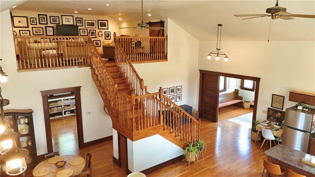 Step into history with this beautifully remodeled 1920s church, now transformed into a unique and spacious home filled with character and charm. From the moment you enter the welcoming foyer, you will be captivated by the architectural details and open concept design that seamlessly blends old world craftsmanship with modern living. The main floor features soaring ceilings and a stunning open living area that includes a kitchen, dining area and multiple cozy sitting and gathering spaces perfect for entertaining or simply relaxing in style. A spacious main floor master suite offers privacy and convenience with an en suite bath, while a main level laundry and additional bathroom add everyday functionality. Upstairs a loft area provides additional space for a home office, reading nook or creative studio. The lower level is ideal for multi-generational living or guest quarters, featuring a second full kitchen, three generously sized bedrooms, a full bathroom and a large living or game room. Whether you are looking for a distinctive residence or a home with flexible layout options his converted church offers endless possibilities and timeless appeal. A 3 car detached garage offers space for car - truck - suvs and workshop with 3 overhead doors and walk in door. Lots of character in the one of a kind home come take a look!!