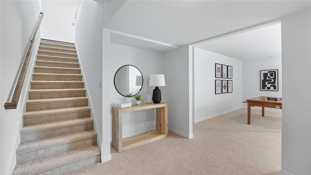 The Reagan is a ranch plan featured at Prairie Trace. This is a spacious and modern home designed with open-concept living carefully considered throughout. This home features four bedrooms, three and a half bathrooms, finished basement and a three-car garage. An inviting foyer greets you upon entering and leads you into the heart of the home. This open plan features a family room, dining room, and kitchen designed with entertaining in mind. The kitchen is equipped with a pantry, 36" cabinets with crown molding, quartz countertops with tile backsplash, stainless steel appliances, and a large island with a breakfast bar, making it perfect for both dining and guests. The luxurious primary suite offers a large walk-in closet and a primary bathroom with dual vanities and plenty of space to get ready. The additional two bedrooms share access to the secondary bathroom on the opposite side of the home offering privacy from the primary suite. With its thoughtful design, this ranch floorplan is the perfect place to call home at Prairie Trace. Pictures are representative.