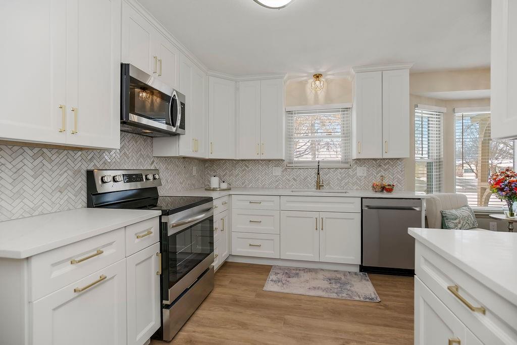Newly remodeled garden home in sought-after Foxwood Springs 55+ community! This 2BR/2BA home offers 1,891 SF with office, four-season sunroom, and 1-car garage. Completely updated with new kitchen cabinets, marble tile backsplash, quartz countertops, stainless appliances, new LVP flooring and carpet w/ 8-lb pad. Features include new lighting and added can lights, 2-panel interior doors, brushed-gold hardware, 5" base trim, faux-wood blinds, built-in dining buffet, updated baths with quartz vanities and glass shower doors, fresh interior paint, textured ceilings (popcorn removed), new landscaping, and exterior door. HVAC, windows, humidifier, and hot water heater less than 5 years old. Move-in ready! Enjoy maintenance-provided living with HOA services that include 24-hour security, emergency response, lawn care, snow removal, trash, exterior and interior maintenance, and utilities (water/sewer). A one-time $3,000 access fee provides use of community amenities including indoor pool, fitness center, library, lounges, meeting rooms, billiards, shuffleboard, garden plots, greenhouse, picnic area, and on-site dining, with optional housekeeping and transportation services. Experience the perfect blend of independence and community—truly a wonderful place to call home.