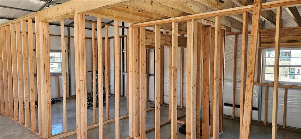 Cozy barndominium ready for your finishing touches! This metal barndominium is framed for a 1-bedroom, 1-bath open floor plan with a combined kitchen and living area. Features include a covered front porch, covered carport, storage shed, and a backyard fire pit—perfect for enjoying the outdoors. Electric service has been connected, and a water meter is scheduled to be installed. Located in the Linn Valley Lakes subdivision, owners enjoy access to amenities such as a community center, fishing, camping, boating, golf, abundant wildlife, and more.