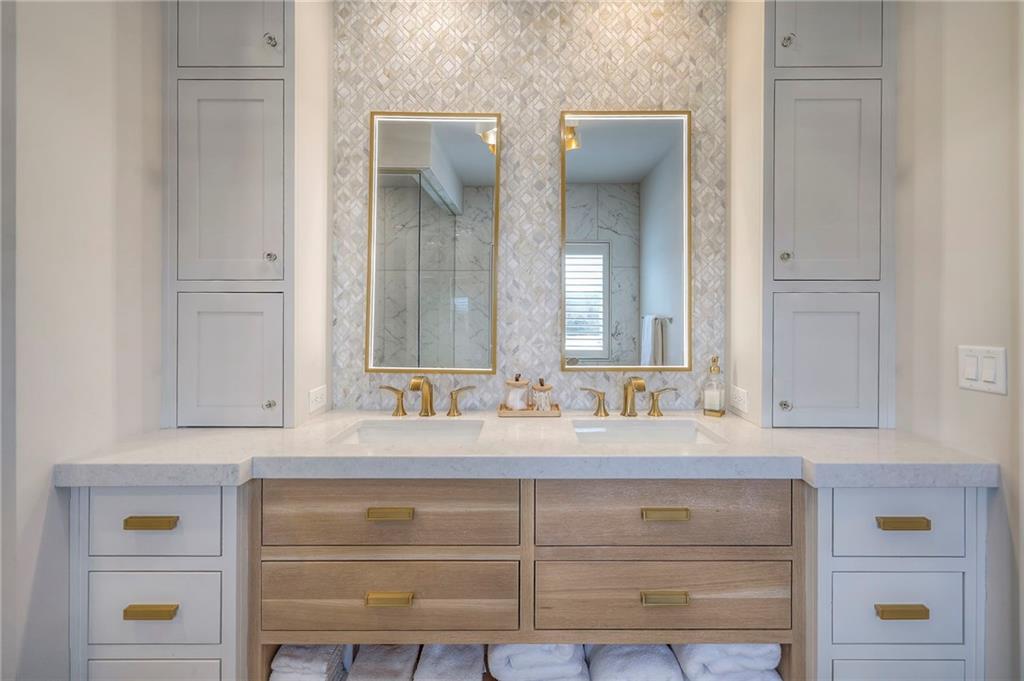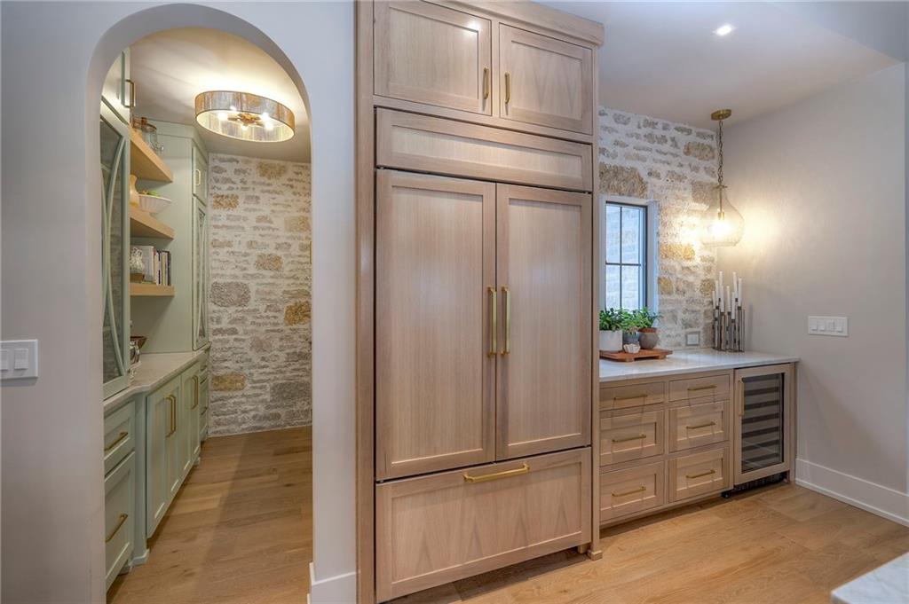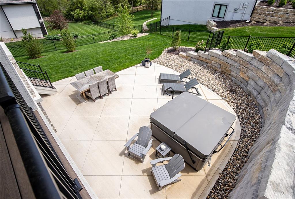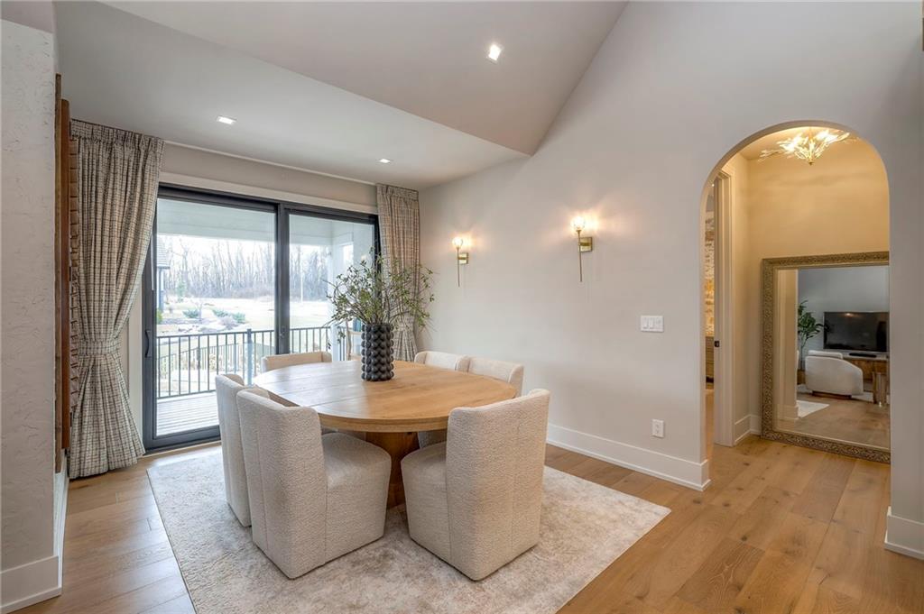 Welcome to this stunning, thoughtfully designed home where elevated finishes and exceptional entertaining spaces come together beautifully. The dramatic living room showcases soaring 18-foot ceilings, custom built-ins, and charming arched fireplace, all complemented by wide-plank hardwood flooring that flows seamlessly throughout the main living areas. Plantation shutters throughout the home and elegant arched doorways add timeless architectural character, style, and privacy. The designer kitchen is both sophisticated and functional, featuring a gas range, quartzite countertops, striking stone feature wall, wine fridge, and abundant workspace for everyday living or hosting. Just off the kitchen, a spacious butler’s pantry provides additional storage and convenience, complete with a second oven, making entertaining effortless. The kitchen opens directly to a large covered deck with low-maintenance Trex decking, creating the perfect indoor-outdoor connection. The luxurious primary suite is a private retreat, highlighted by a beamed ceiling and stone feature wall, and complemented by a spa-inspired bath offering LED mirrors, quartzite countertops, a soaking tub, and an oversized walk-in shower. The laundry room is conveniently located just off the primary suite for added everyday ease. The walk-out lower level is designed for unforgettable gatherings, featuring a media room and an impressive entertaining bar with waterfall-edge quartzite countertops, microwave, drink fridge, and wine fridge. Step outside to the patio, partially covered for year-round enjoyment, complete with a see-through stone fireplace and hot tub, creating an inviting outdoor living space perfect for relaxing or hosting guests.
