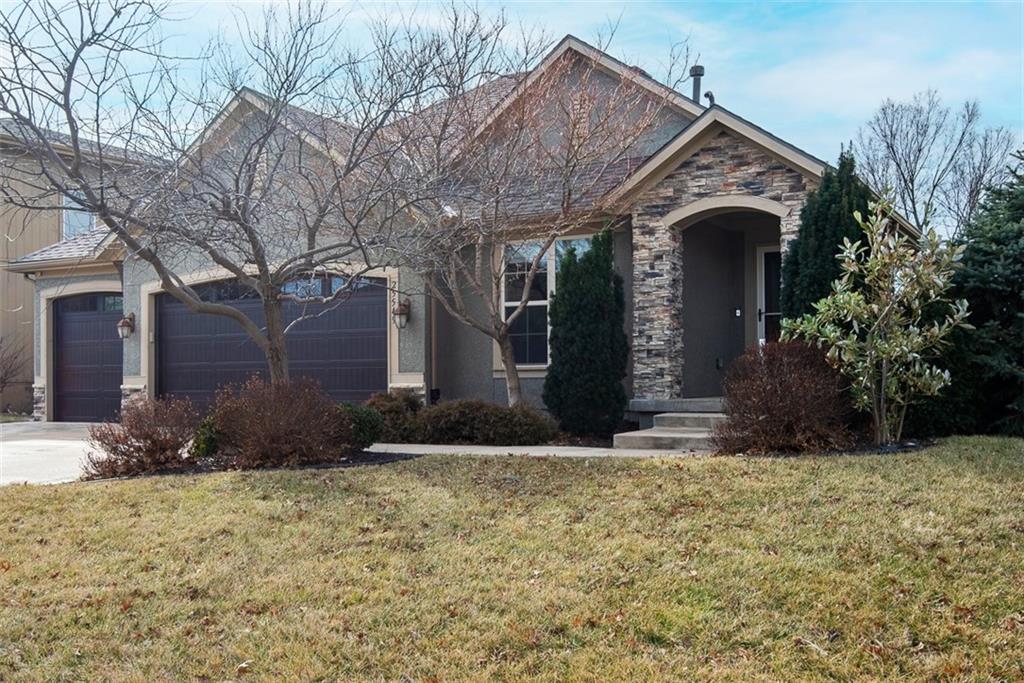 Don't miss out on this home in The Greens at Prairie Highlands - located in one of the area’s most sought-after golf course communities, just minutes west of Lake Olathe. This former model home is filled with thoughtful upgrades and timeless style. The popular reverse ranch floor plan offers an open-concept layout connecting the living room, kitchen, and dining area, perfect for everyday living and entertaining. The kitchen features a center island, pantry, pull-out drawers, and abundant cabinetry, while the stone fireplace and accent wall create a warm, inviting focal point in the living space. The spacious primary suite includes a spa-like bathroom with dual vanities and a soaking tub, conveniently connected to the laundry room. 2nd bedroom/office is also located on the main floor. Start your mornings on the covered deck overlooking peaceful green space and visiting wildlife. The finished lower level family room is ideal for entertaining. Additional features includes two bedrooms, full bath, plenty of storage and walkout/walkup access to the backyard. A three-car garage, in-ground auto drain sprinkler system, and close proximity to the community pool bring comfort and ease to everyday living. Residents enjoy access to the community pool, neighborhood activities, and Crush Restaurant at the Prairie Highlands Golf Course Clubhouse - open to the public. Golf course play requires membership. A single-owner home, thoughtfully maintained and ready to be enjoyed by its next owner.