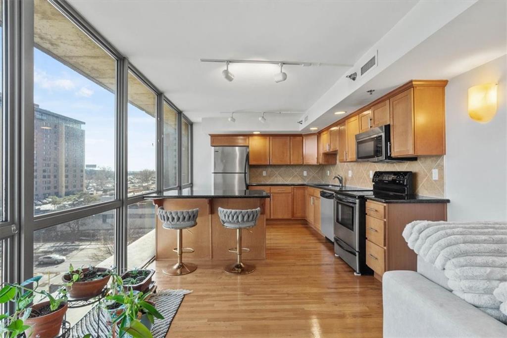 Bright, cheerful, and full of good vibes, this is the kind of place that makes you smile the moment you step inside. Drenched in sunlight, it features a full window wall that frames the city, has sensational amenities, a tax abatement, and a coveted outdoor space you will adore. The layout is open, airy, and thoughtfully designed to maximize space. The kitchen is well-equipped with today’s conveniences, generous cabinetry, granite counters, and a central island that anchors the room. Steps to the living area, it’s perfectly suited for casual entertaining, cozy nights in, or simply enjoying the sunset while dinner comes together. Hardwoods add warmth and continuity throughout, while the balcony provides the ultimate spot to start or end the day. The bedroom offers a serene escape, filled with natural light and expansive windows that keep the skyline in view, complemented by an ensuite that blends style with everyday function. Thoughtful extras include in-unit laundry, two parking spots (one in the garage and one surface), and additional storage for your convenience. The amenities go above and beyond, with pools, hot tubs, and basketball courts. Hit the gym, unwind in the sauna, or stretch and strengthen in the yoga room. Add a tennis/pickleball court, a club room, a movie theater, an executive kitchen, and a garden for quiet escapes. There is even a laundry service and a 24/7doorman. Perfect as a first home, city retreat, or investment property, this charming condo offers the complete package just moments from all the downtown action.