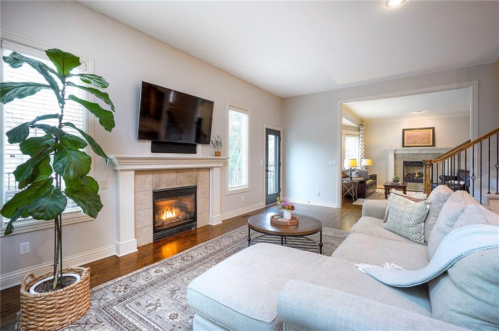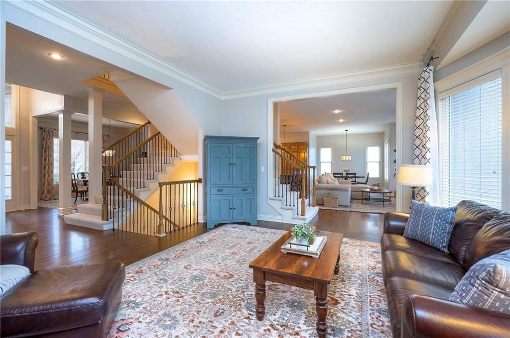 Stately 2 story in BLUE VALLEY SCHOOL DISTRICT offering timeless curb appeal, generous space, and thoughtful updates. The main floor offers hardwoods throughout with a terrific flow for everyday living and entertaining. Enter into a 2 story foyer with french doors leading to a quiet, private office on one side, and smart formal dining on the other. Walk past a split front/back staircase to a great room with a wall of windows, and 1 of 4 gas fireplaces. The large kitchen has a huge granite island and seamless flow into a spacious hearth room with fireplace and breakfast nook. From here, you can walk right out to a newer composite deck. The 2nd floor expansive primary bedroom has a sitting area with fireplace, spa bath and walk in closet. 3 additional bedrooms, 2 baths and a laundry room round out the top floor. The walkout finished basement comes with a full bar, large rec area, fireplace, and 2 storage rooms. Outside is a stamped concrete patio perfect for a fire pit or basketball hoop, and a generous fenced in backyard. Newer HVAC! This is a wonderful family home in a terrific community!
