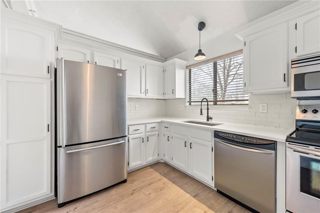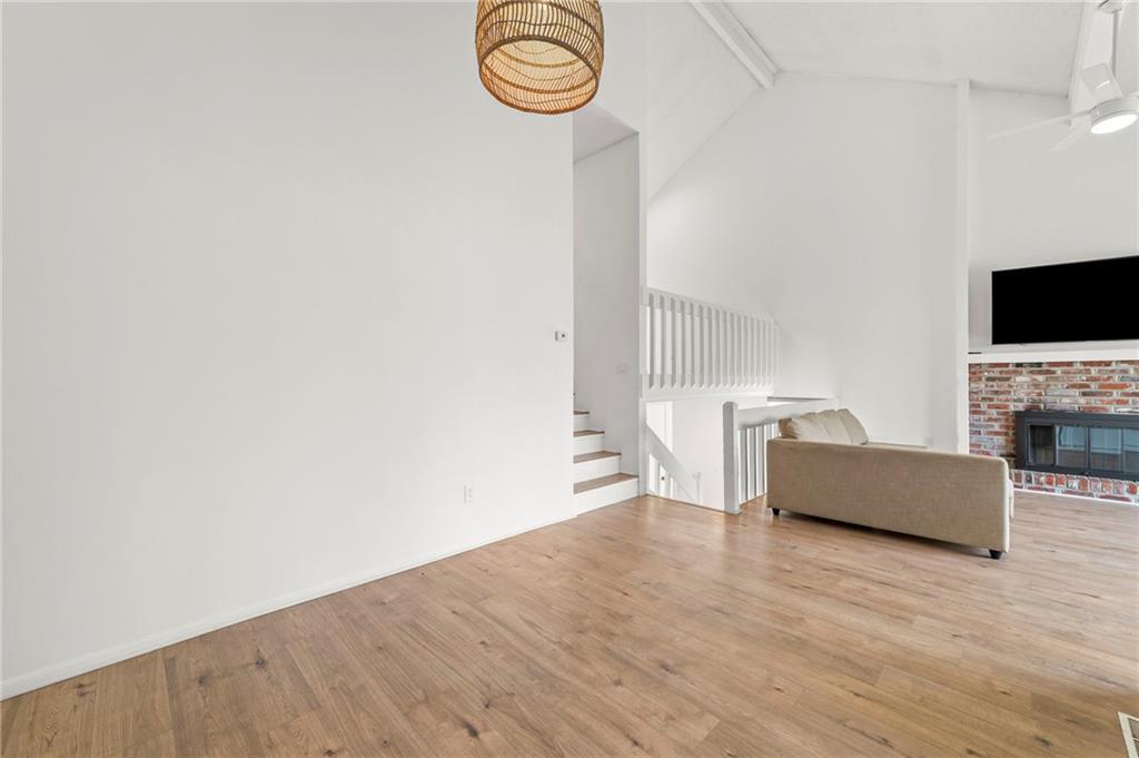 This townhome in The Trails features soaring vaulted ceilings, a seller-updated kitchen and bathrooms, new flooring, and a 2-car garage! Enjoy a private patio with a six-foot privacy fence and an unfinished basement—perfect for storage or to finish and add value. The kitchen opens to an inviting family room highlighted by a beautiful masonry fireplace. The loft overlooks the main level and works perfectly as a home office, workout space, or both, and could easily be enclosed to create a third bedroom. Located on a quiet cul-de-sac close to schools, shopping, and restaurants. Community amenities include walking trails, a swimming pool, and tennis courts for easy, low-maintenance living. Schedule your showing today!