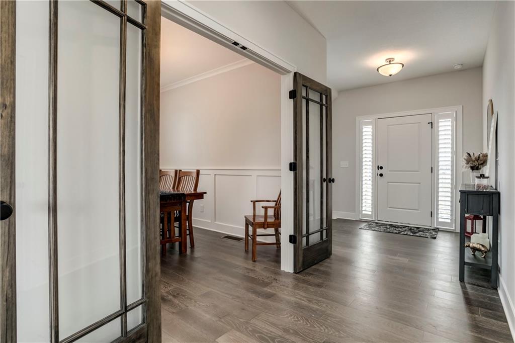 Welcome to your dream home featuring thoughtful upgrades and stylish finishes throughout! Step inside to beautiful hardwood flooring in the Entry, Breakfast Area, Kitchen, Dining/Office (with elegant French doors), and Great Room — with recently added hardwood stair landings for a timeless appeal. Light and privacy are enhanced with the 2-inch faux wood blinds. The heart of the home boasts a modern kitchen with striking graphite quartz countertops, upgraded enamel cabinetry, and seamless functionality. A convenient, built-in mud bench at the garage entry keeps everyday organization effortless. Retreat to the spa-like bath with a luxurious free-standing tub — a standout feature that elevates the master bath with the custom tile shower. Additional enhancements include a painted garage interior and a programmable smart thermostat for comfort and efficiency. Enjoy easy outdoor living with the new patio extension and hardscape improvements with a privacy wall. Large back yard and sprinkler system. This vibrant community offers exceptional amenities — including a stocked fishing lake, heated pool with extended seasonal use, playground, picnic shelter, fire pit area, and trails — perfect for fun, relaxation, and connection. Taxes and square footage are estimated.