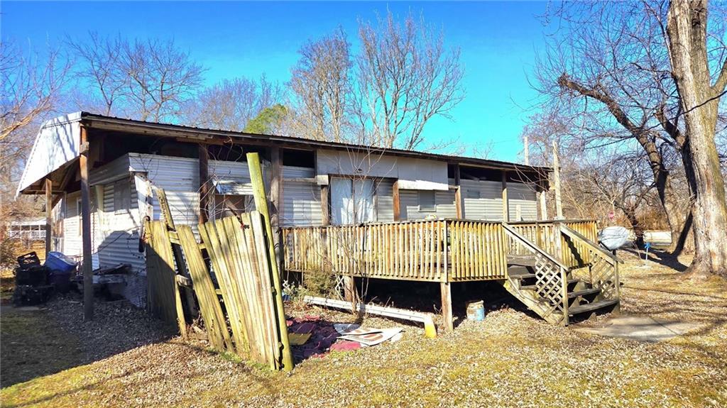 Pleasanton, KS Fixer-upper on a corner level lot with multiple mature hardwood shade trees. This manufactured home has received multiple stick frame additions through the years, including a 2 bay open lean-to garage, a metal roof, and more. The water meter is City of Pleasanton.
