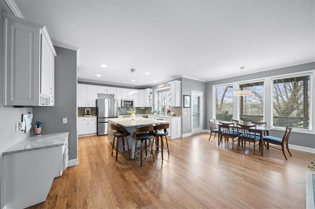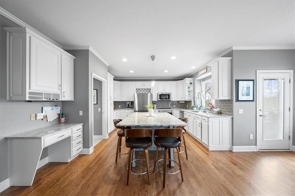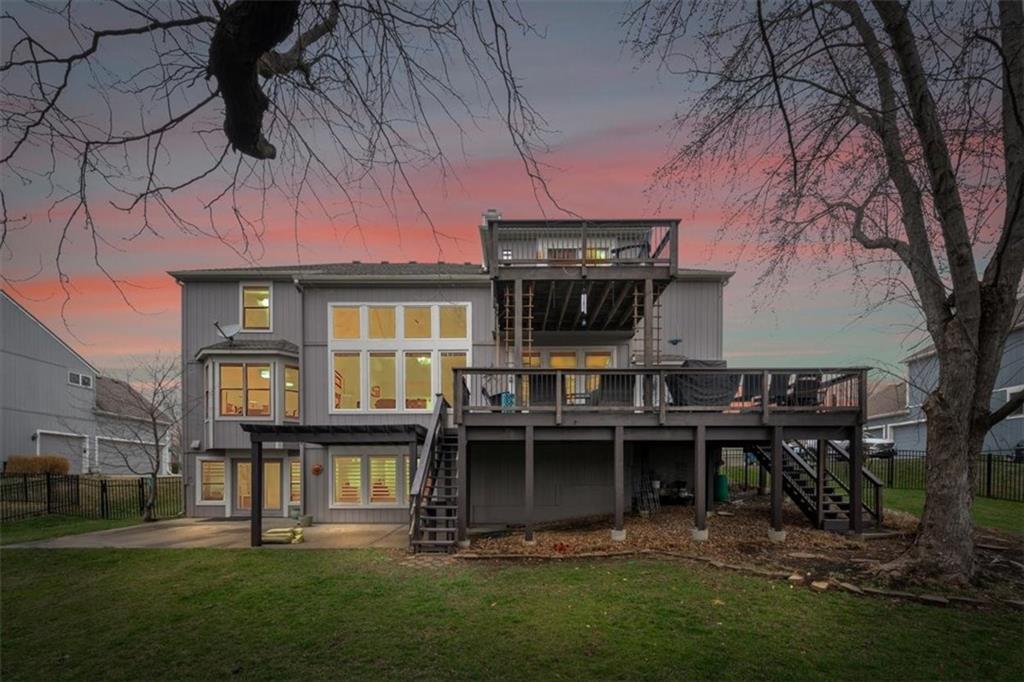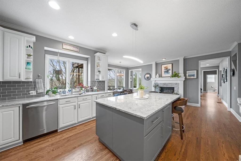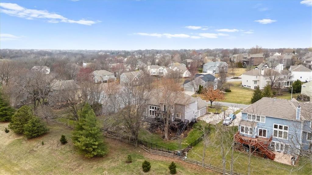 Check out this incredible opportunity in the highly sought-after Steeplechase subdivision—backing to Ironwoods Park for peaceful views and an outdoor setting you’ll love. Step into a grand entry featuring vaulted ceilings and a stunning spiral staircase. Open & inviting layout filled with tons of natural light and beautifully refinished hardwood floors throughout the main level (2026). Kitchen beautifully updated with painted cabinetry, quartz countertops, a large undermount sink, and stainless steel appliances, including refrigerator, double oven, cooktop & microwave. Plenty of places to eat & gather with a large formal dining room, eat-in bar, bright breakfast nook, and a cozy double-sided fireplace shared between the kitchen & living room. A generous deck just off the kitchen provides the perfect space to relax or entertain. Wet bar located just off the living room, plus a separate second living/family room and an additional office area with built-in bookshelves—ideal for working from home or enjoying a quiet retreat. Beautifully remodeled primary suite offers a spacious bathroom with a new tile shower, updated flooring and countertops, a large jetted tub, and two spacious walk-in closets for plenty of storage. The primary bedroom includes a cozy fireplace, a comfortable seating area, and its own private deck overlooking the serene backyard. Large walk-out basement with lots of natural light, an added full bathroom, and a walk-out to the back patio—perfect for entertaining, a home gym, game room, or additional living space. Enjoy a treed & fenced backyard with expansive views and a rare connection to the park-like setting beyond. Large three-car garage! Located in the award-winning Blue Valley School District, and just minutes from shopping, dining, and everyday conveniences.
