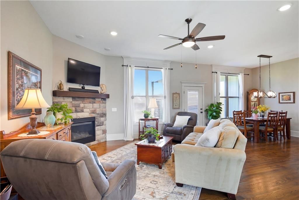 Former model home in highly desirable Greyhawke at the Lake! This spacious 4-bedroom, 3-bath residence offers an open and airy floor plan with tall 6-panel doors, large closets, and quality finishes throughout. The main level features three bedrooms, including a private primary suite with dual vanities, a jetted tub, a tiled glass walk-in shower, and a private water closet. Hardwood floors flow through the great room, dining area, and kitchen, and a gas fireplace anchors the living space perfect for both everyday living and entertaining. The finished daylight basement provides flexible space for recreation, guests, or hobbies. Step outside to enjoy the covered patio overlooking a beautifully landscaped corner lot that adjoins greenspace and includes an in ground sprinkler system. A security system and internal antenna streaming system are added bonuses. The three car attached garage offers plenty of room for vehicles, storage, or lake gear. Recent updates include a new roof and gutters for added peace of mind. Located just minutes from Smithville Lake and Paradise Pointe Golf Complex, with easy access to top-rated Smithville schools and Northland amenities, this home delivers space, comfort, and an unbeatable location.