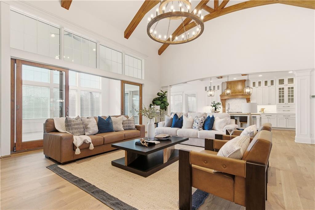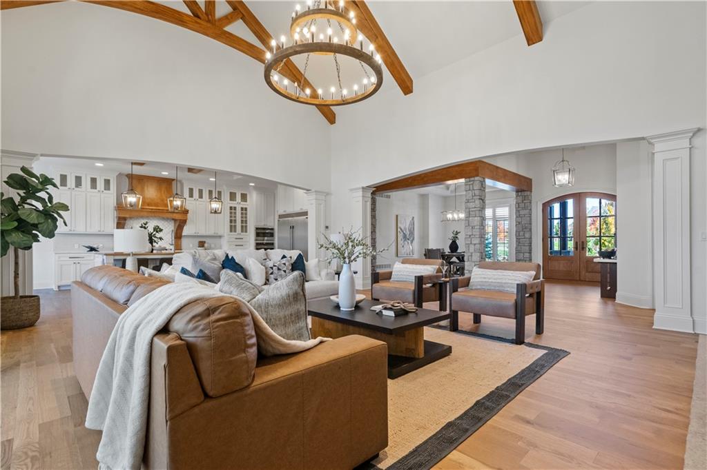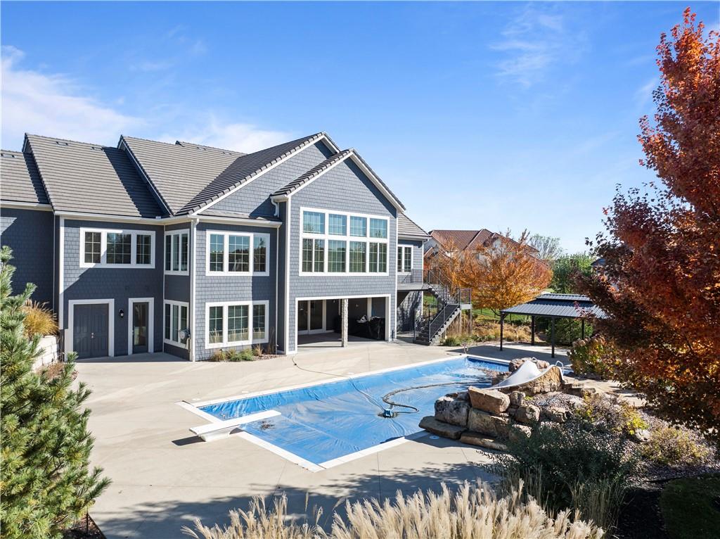 SHOWSTOPPER Reverse 1.5 story in The Farms at Garnet Hill! Impressive from the start--thoughtful landscaping, circle drive and a 5 car garage. Custom build by Cecil & Ray design team. This elegant home blends timeless design with resort-style living. Step inside to soaring ceilings, rich hardwoods and expansive windows showcasing beautiful views of the private backyard oasis. The open-concept main level features a great room with stone floor to ceiling fireplace and built-ins flowing seamlessly into the gourmet kitchen. Please any chef and entertain in style in this expansive kitchen featuring custom cabinetry, large center eat-in island, walk-in butler's pantry and high-end stainless steel appliances. Adjacent dining and breakfast areas! Easily move the experience onto the lanai with multiple access points for convenience. Spacious primary suite offers a spa-inspired bath including double vanity, soaking tub, large walk-in shower and huge walk-in closet conveniently adjacent to laundry room. Second main-floor bedroom or office with built-ins adds flexibility. Option to take the stairs or use the elevator to the beautifully finished walk-out basement. Here the entertainer’s dream continues with a family room, rec area, gorgeous wet bar, tiered media room, two additional bedrooms each with their own en-suite bath and walk-in closets and bonus pool bathroom with changing room and 2nd laundry. Walk-out access to the in-ground resort styled pool, covered patio, sun deck and lush landscaping providing privacy. Impeccably maintained, thoughtfully designed and located in one of Overland Park’s most desirable neighborhoods—this is luxury living at its finest! WELCOME HOME!