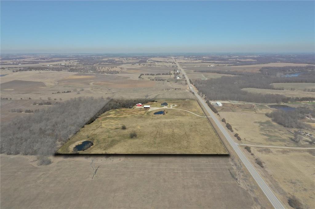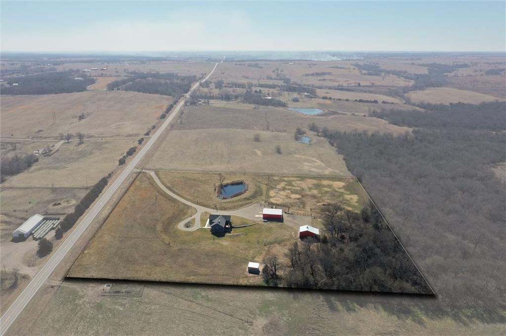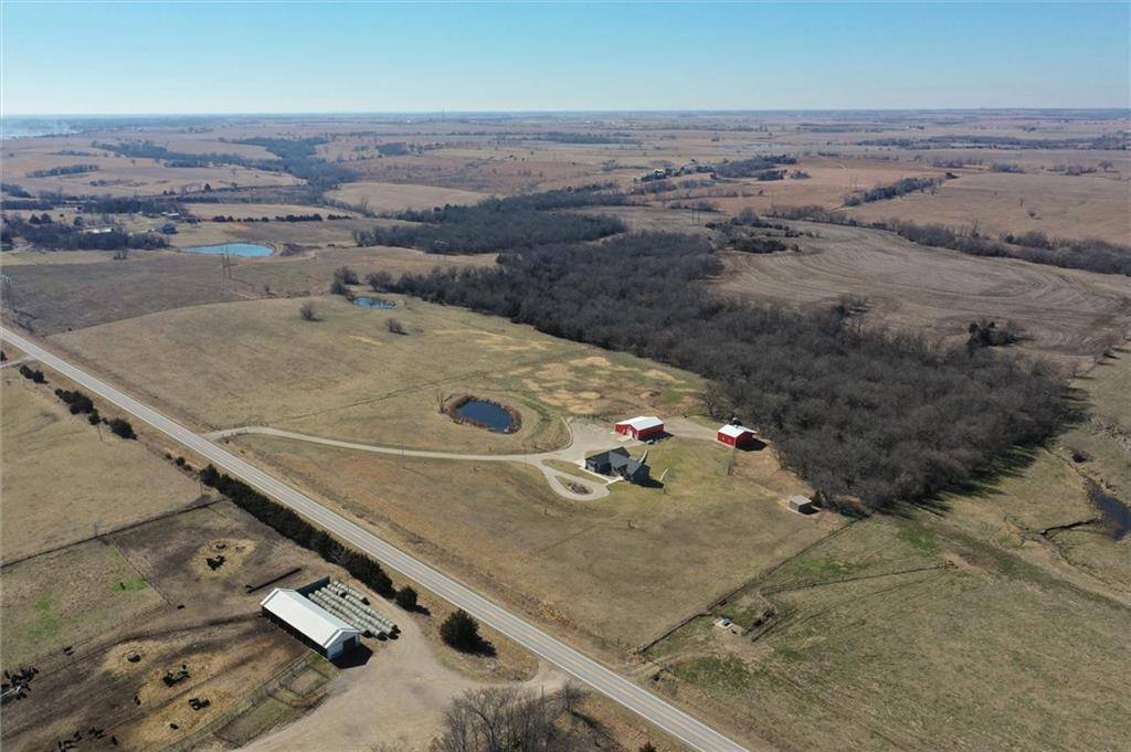 Gorgeous dream home located on 20 +/- picturesque acres. Expect to be impressed upon entering this 4 bedroom, 4 bath ranch. Open floor plan, reclaimed hardwood floors throughout main living area, vaulted ceilings, an abundance of natural light, solid wood doors and upgraded lighting. Great room featuring floor to ceiling stone fireplace, open to stunning kitchen boasting GE Cafe appliances, custom cabinetry with marble pulls and knobs, granite countertops, pot filler, gas stove and walk-in pantry. Large island and dining space to accommodate all of your family and friends making it perfect for hosting gatherings. Step outside to your private deck for enjoying the fabulous sunsets. Great master suite with vaulted ceiling, double vanity, separate shower, relaxing soaking tub and huge walk-in closet. Two additional spacious bedrooms on main level as well. Full finished walk-out lower level complete with wet bar, huge family/rec room, plenty of windows, 4th bedroom, full bathroom, safe room, plus unfinished space for storage. The property also features a 30x50 insulated shop with 200 AMP power, concrete floor, large wood burning stove, 2 separate garage doors (in/out) plus three 16x20 bays with lighting. Newly added 30x34 2 stall stable with commodity area and 30x10 lean to for additional equipment storage or animal cover. The cutest custom chicken house stays too. This remarkable property is not only beautiful, but it virtually has it all! Perfect farm space for cattle or horses, abundance of wildlife, trails through the timber down by the creek and fish in the pond. It is a sanctuary retreat by day and night all year long! Serene environment to call home! All located on hard-surface road. Easy commute to Lawrence, 15 minute commute to Baldwin City and Topeka!