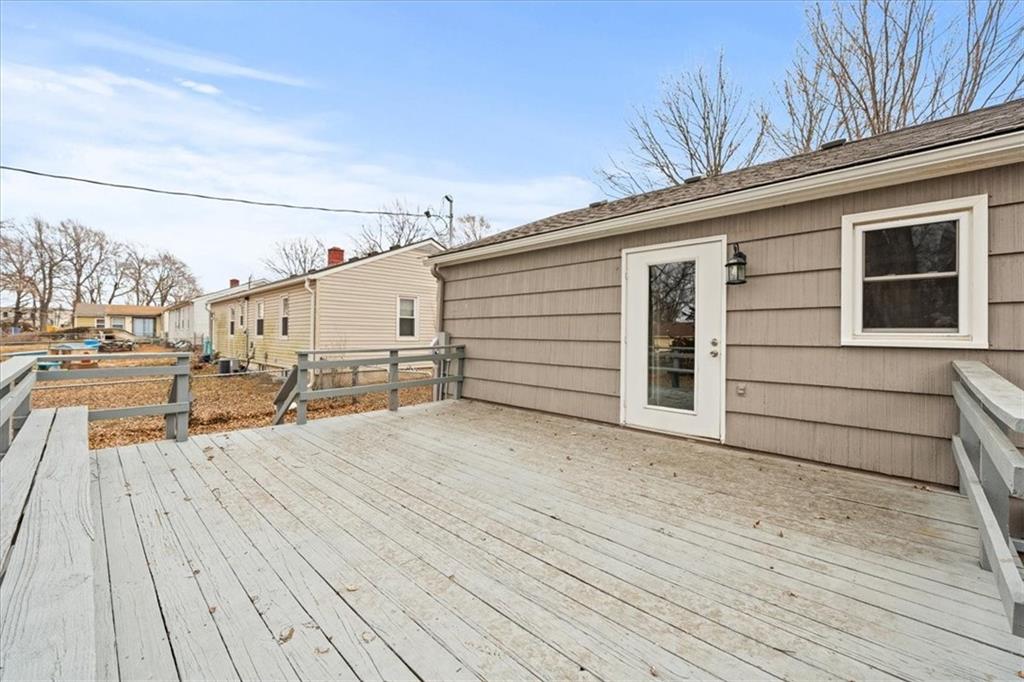 Wonderful 3 bedroom, 1 bath ranch located in a well establish neighborhood! This charming home features a roof just 1.5 years old and an inviting front porch that welcomes you as you arrive. The extra wide driveway provides ample parking for multiple vehicles. Inside you'll find a bright living room filled with natural light and a functional kitchen offering abundant cabinetry and generous counter space. All appliances stay, including the refrigerator, washer and dryer-making this home truly move in ready. The basement provides tons of storage space, complete with built in shelving and a workbench area. Step outside to a large fenced backyard featuring a spacious deck with built in seating, access on both sides of the yard, raised garden beds for future gardeners, and a bonus storage shed. Conveniently located just minutes from Raytown schools, walking trails at Cave Spring Park, shopping, and highway access. A wonderful opportunity for first time homebuyers or anyone looking for comfortable, easy living!