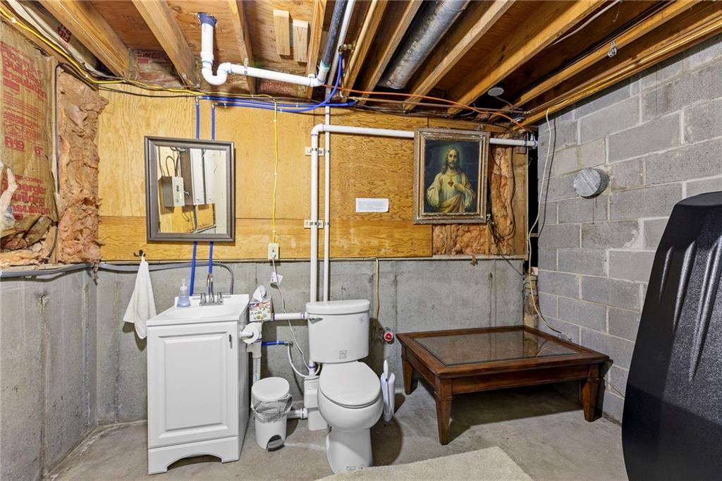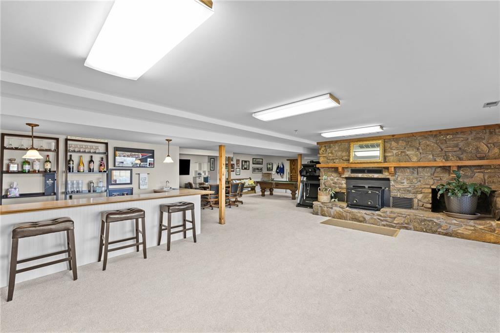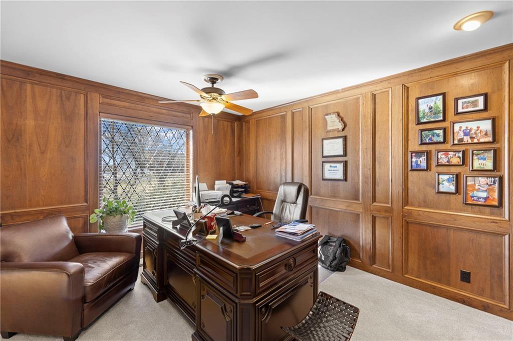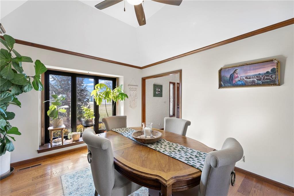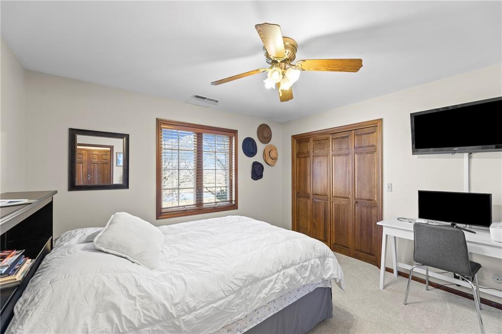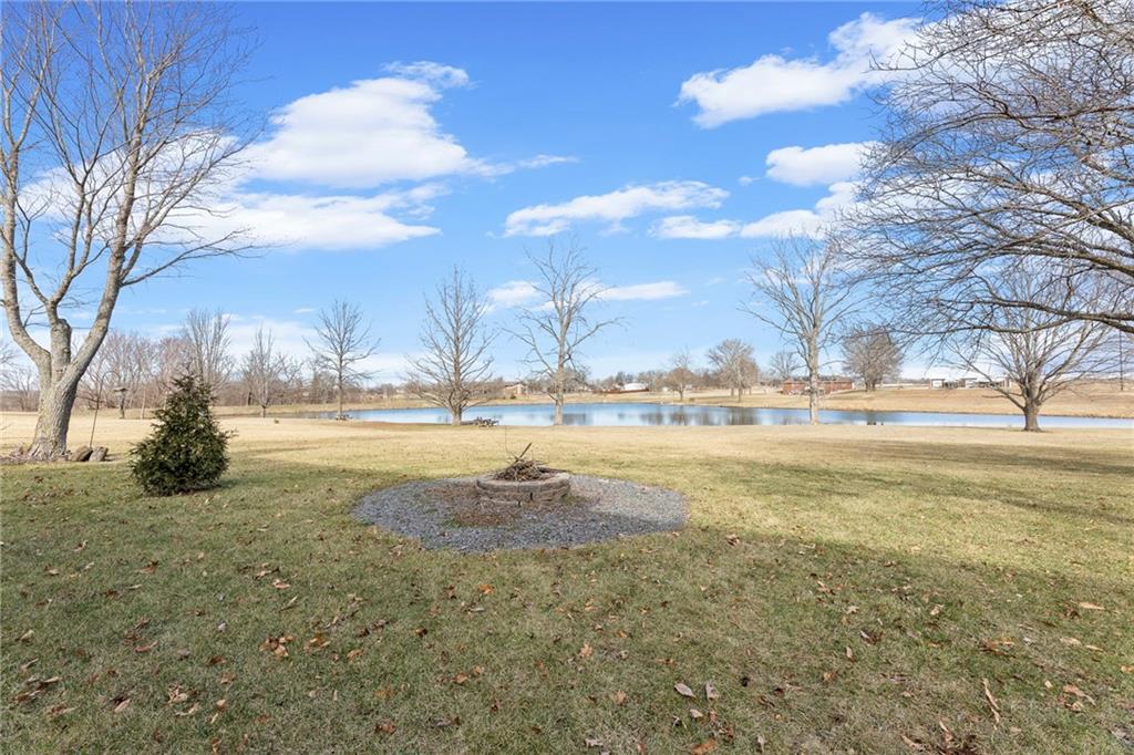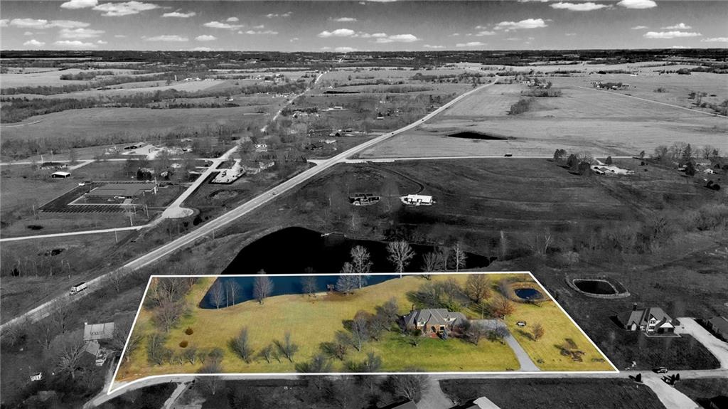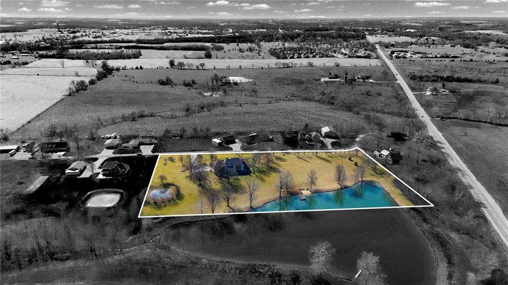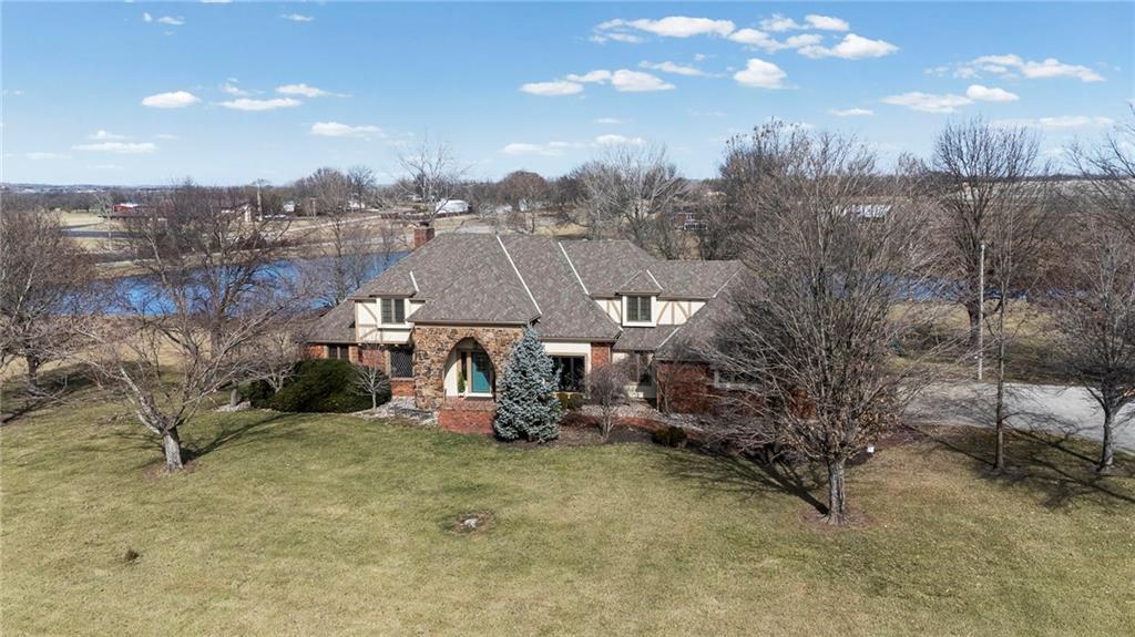 Nestled on 4.95 lush acres just north of the Paola Country Club, this exceptional custom-built 1.5-story residence offers a rare blend of superior craftsmanship and tranquil lakeside living. The heart of the home is a gourmet kitchen finished with rich walnut cabinetry, granite countertops, and warm oak hardwood floors, which flows seamlessly into a magnificent great room where walls of windows frame breathtaking views of a 2-3 acre stocked shared lake. Architectural integrity shines through the 6-inch wall construction, Anderson windows, and a high-impact resistant roof, while the interior showcases refined details like a custom-designed pecan study with solid core doors and two fireplaces. The main-floor primary suite serves as a private sanctuary with vaulted ceilings, walk-in closets, a shower and granite double vanities with Kohler fixtures. Upstairs, three additional spacious bedrooms share a beautifully updated full bathroom, ensuring comfort for family or guests. The versatile walkout lower level extends the living space with a bright family room, den, and a dedicated 24x13 workshop, all leading out to a sprawling yard, perfect for entertaining. Enjoy the fruit trees, blackberry bushes, strawberry and asparagus patches, plus a 30 ft. x 12 ft. garden area. Situated on a quiet dead-end road, this meticulously maintained brick frame and stone trim estate provides a serene escape without sacrificing proximity to local amenities.