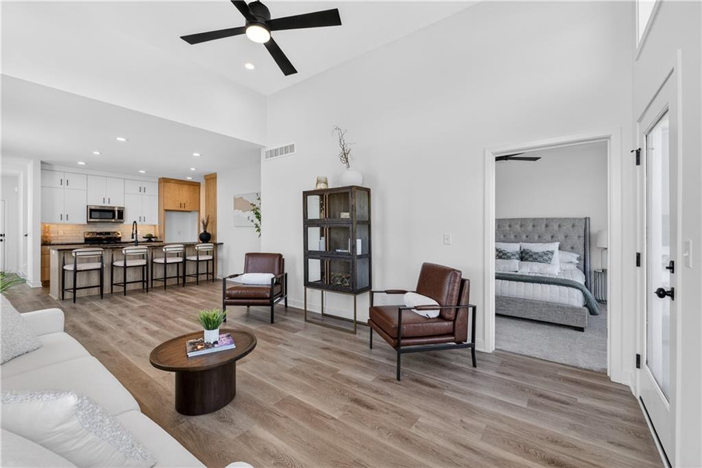 Discover refined, low-maintenance living at The Cliffs of Watercrest, where modern design and everyday convenience come together beautifully. This exclusive 1.5-story townhome blends contemporary style with functional comfort while offering a truly elevated lifestyle. Inside, soaring 20-foot ceilings and an open-concept layout create a bright, airy atmosphere filled with natural light. The spacious living area flows effortlessly into a functional luxury kitchen with premium finishes—perfect for hosting gatherings or enjoying a quiet evening at home. The main-level primary suite serves as a private retreat, featuring a spa-like bath with dual vanities and a generous walk-in closet and ensuite laundry. Upstairs, a versatile loft space leads to your own private rooftop terrace—an ideal setting for morning coffee, sunset views, or entertaining guests. Two additional large secondary suites each with their own walk-in closets ensures comfort and privacy for family or visitors. An unfinished walkout basement provides abundant storage and endless opportunities to customize the space to fit your needs. Ideally situated just minutes from premier shopping, dining, and major highways, The Cliffs of Watercrest offers the perfect balance of accessibility and upscale living. With low-maintenance services included, you can truly embrace a lock-and-leave lifestyle. ***Residents of the Cliffs also receive access to the amenities of WaterCrest Landing including the Pool, future Pickleball Courts and Play Area*** The Cliffs townhomes are also a perfect opportunity for investors looking to build their portfolio and take advantage of an exciting opportunity in a rapidly BOOMING area of Johnson County. Schedule your showing today!
