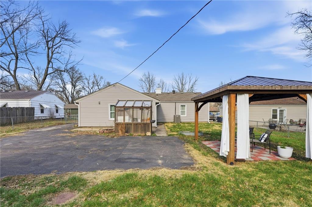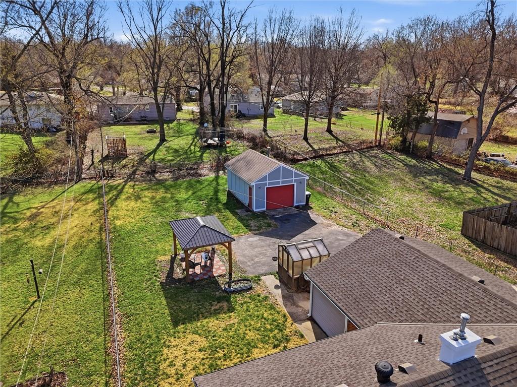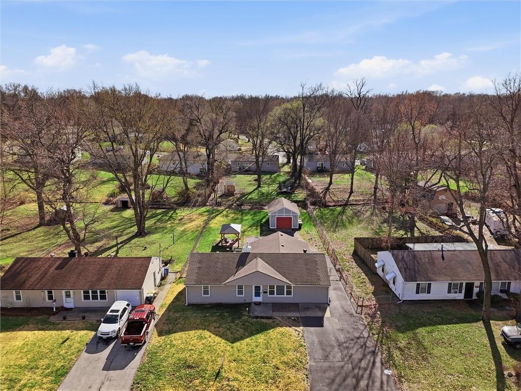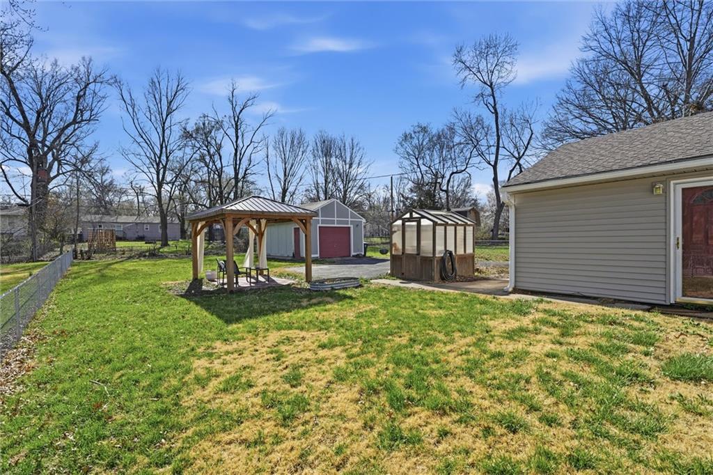 Fully updated ranch offering true main level living just minutes from Longview Lake. This four bedroom, one bathroom home features spacious bedrooms and an oversized bathroom with a comfortable and functional layout. The updated kitchen includes a walk in pantry and flows conveniently to the main level laundry room located just off the kitchen. Updates throughout the home include fresh paint, updated finishes, and thoughtful design from floor to ceiling creating a bright and inviting living space. Outside you will find a double driveway with a double gate leading to the backyard and an oversized detached garage featuring a heated shop complete with shelving, work benches, and ample workspace. The large fenced backyard offers additional outdoor living space with a gazebo and greenhouse already in place. A rare opportunity to own a move in ready ranch home with a workshop, outdoor amenities, and convenient access to Longview Lake, parks, and nearby conveniences.