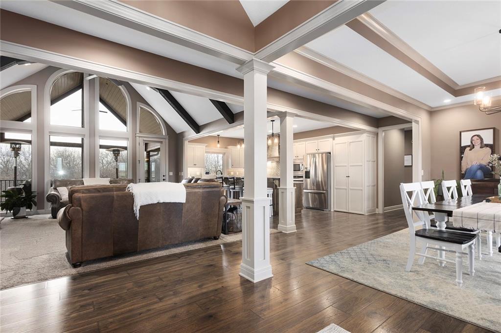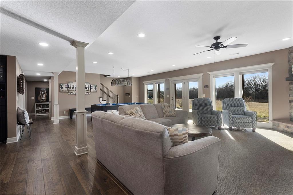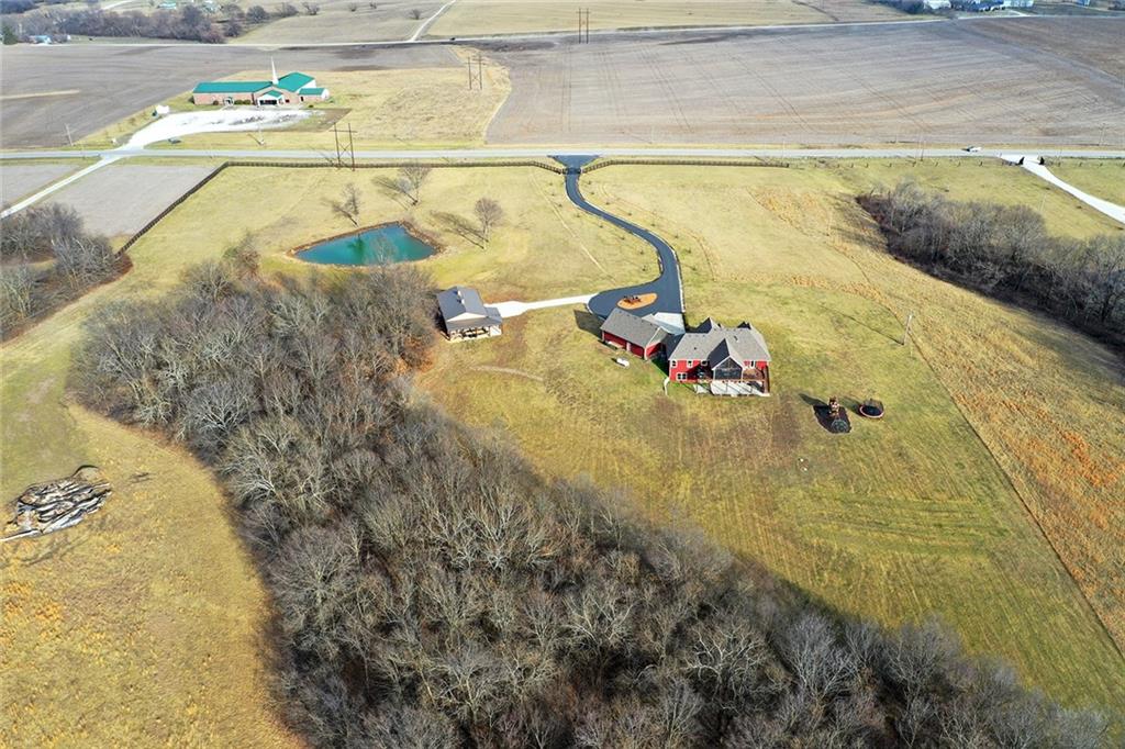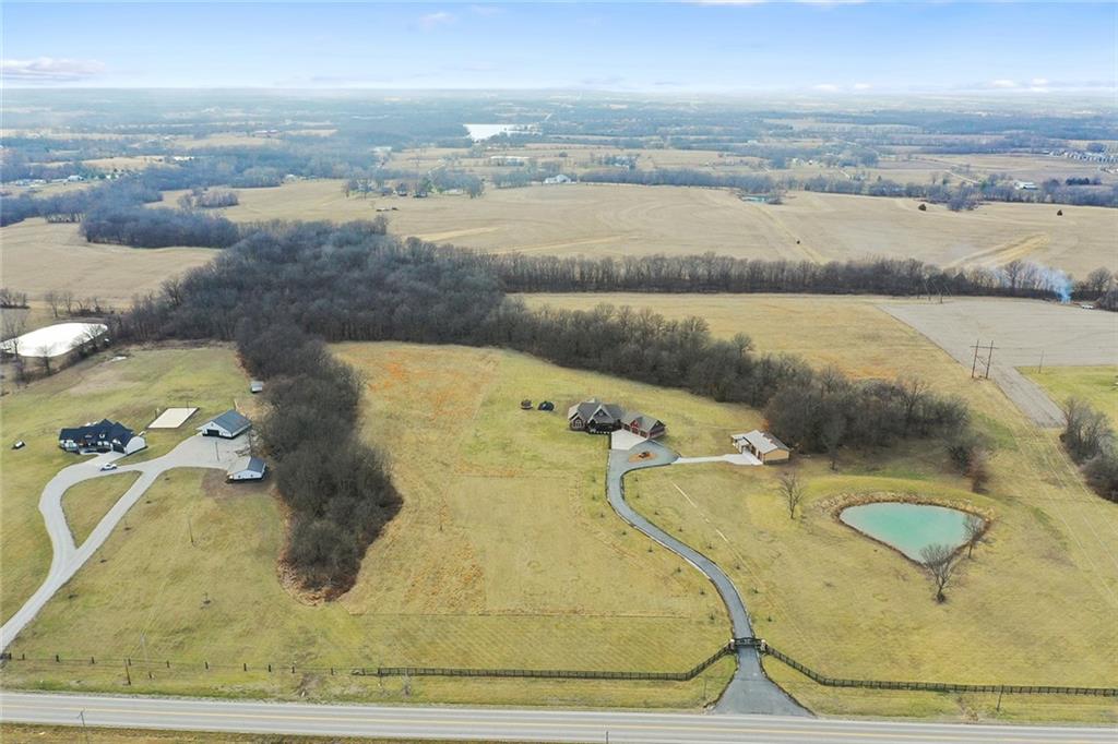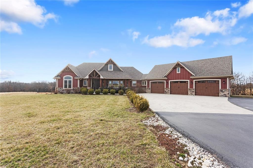 Welcome to Murricane Ranch — a private, gated estate where luxury meets the land. A winding paved drive lined with brilliant Fire Maples creates a breathtaking approach, setting the tone for nearly 25 pristine acres framed by classic Kentucky horse fencing and highlighted by a fully stocked pond. Designed to embrace the natural beauty and uniqueness of the property, this custom-built reverse 1.5-story captures sweeping treed views and unforgettable sunsets from its screened-in covered deck. Inside, the open-concept layout is anchored by a true chef’s kitchen featuring custom cabinet detailing and an amazing walk-in pantry built for both serious cooking and seamless organization. The kitchen flows effortlessly into the main living areas, creating a warm and inviting space ideal for everyday living & entertaining. A thoughtfully designed main-floor pet/mud room adds convenience and function. The private owner’s retreat is a sanctuary of its own, complete with heated floors and a spa-quality shower that elevates daily living. Guest rooms are intentionally positioned for privacy, while the full walkout lower level offers two additional bedrooms, a spacious game room, wet bar, and dedicated media area. Quality construction is evident throughout, including zoned high-efficiency HVAC, engineered laminated floor joists, and a reinforced storm room for peace of mind. The absolutely massive heated 3 car garage (with over 1100 sq ft) accommodates even the largest vehicles with ease to maneuver and provides the option to finish a private apartment above. A 1,500-square-foot heated and cooled outbuilding with office space, bathroom, and an impressive man cave expands the lifestyle possibilities even further. Though privately tucked away, Murricane Ranch is just minutes to I-70 & approximately 20 minutes to Blue Springs—offering convenient access without sacrificing seclusion. This is more than a home; it is a purposefully crafted retreat where land, luxury, & lifestyle converge.