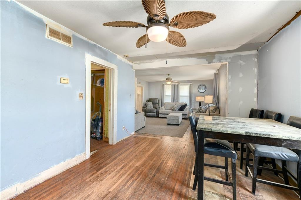 This 1.5-story home features 4 bedrooms and 2 baths and is priced to sell. Located just one block from the square, it sits in the heart of Paola. The main level includes the laundry room, the primary bedroom and full bathroom. Upstairs you'll find three secondary bedrooms and an additional full bathroom. Enjoy plenty of off-street parking thanks to the pass-through driveway. The stove hookup is electric. The extra-large fenced backyard includes a shed and a clubhouse. Attractive brick hardscaping accents the patio and front sidewalks. The roof is approximately 10 years old, the HVAC system is about 12 years old, and the water heater is roughly 4 years old. This home has good bones and is ready for some updates and repairs.
