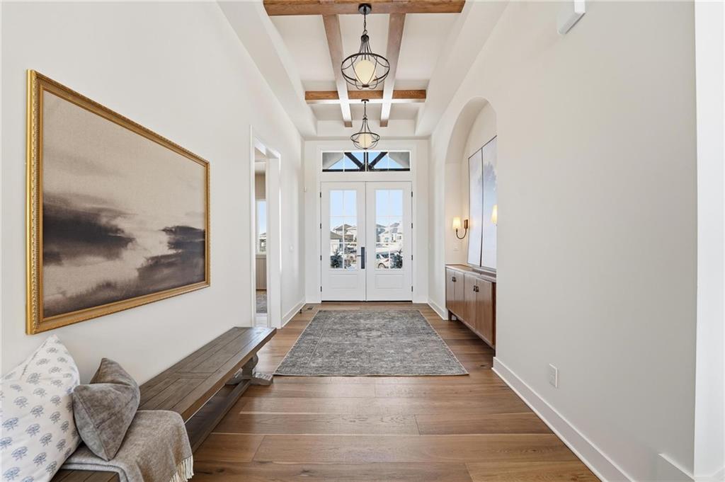The new Aspen floor plan by Coventry Builders. THIS IS A MODEL AND IS NOT AVAILABLE FOR SALE. This 4 bedroom + Loft, 4.5 bath, 1.5 Story home features a large front porch. The Great Room has a soaring two story ceiling and the open living area is complete with a beautiful fireplace, built-ins, and tons of natural light. The kitchen has lots of cabinet and countertop space and a huge island. The large pantry/prep kitchen is adjacent. Beams in the Entry Foyer ceiling add to the WOW. The Dining room opens to the large covered composite deck. The main level features a 2nd bedroom with it's own bath and walk-in closet. The spacious main level Primary Bedroom opens to the luxurious Mbath with a large walk-in shower and free-standing tub. The large Master closet features plenty of storage possibilities. Connected to the master closet is the laundry room with a quartz countertop. The second level features a large loft that overlooks the Great Room. There are two additional spacious bedrooms on this level. This home is on a walkout lot, has a 3 car garage and a large covered deck. Don't miss seeing this home! Community amenities are open and include: clubhouse w/ fitness room, dog spa, gathering room and catering kitchen; 4 pools including a zero entry outdoor pool, outdoor kiddie pool, Indoor lap pool and indoor machine pool; sport court for basketball and pickleball, and playground. The new Blue Valley elementary school, Aspen Grove, is located in the center of the community.