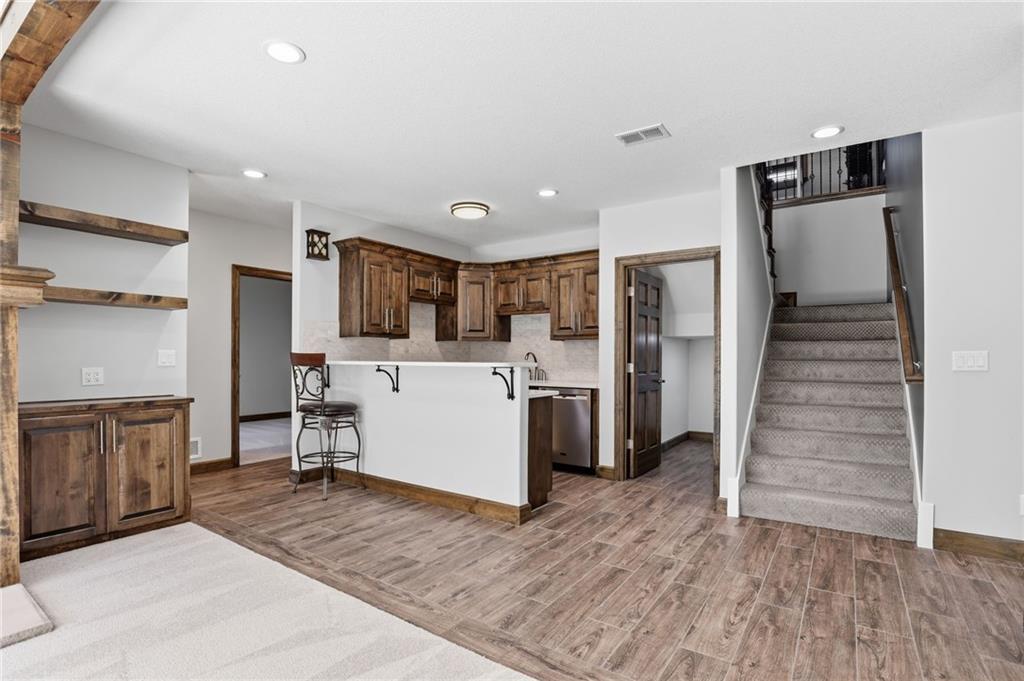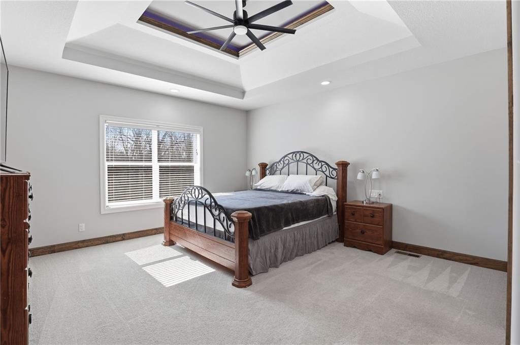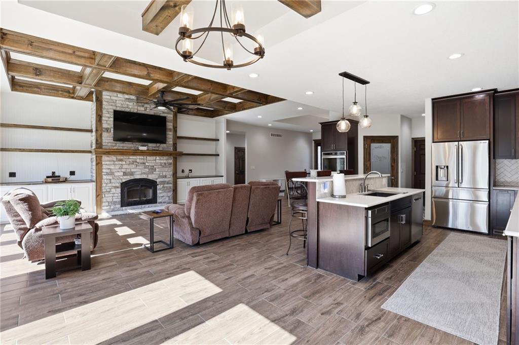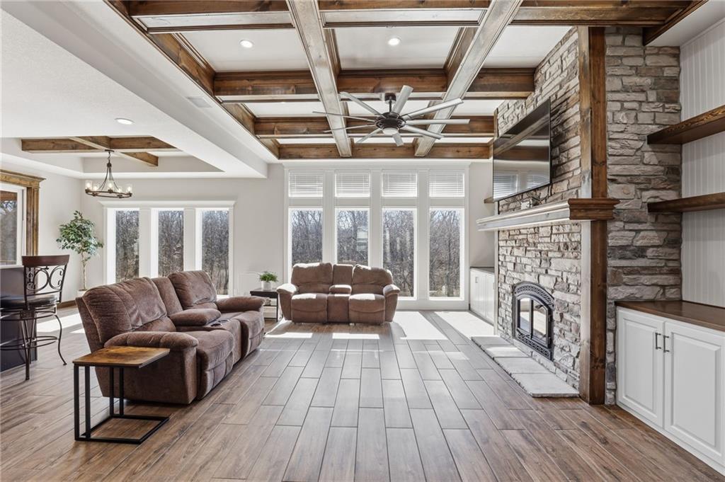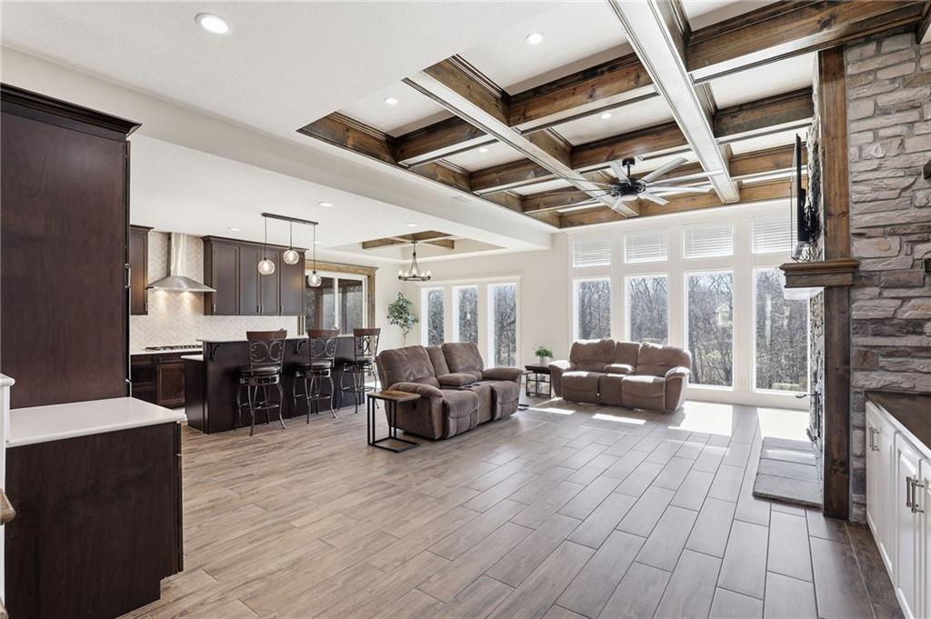 Tucked away in the sought-after Whispering Woods community of Lee’s Summit, this exceptional five-bedroom, four-bath residence offers the perfect balance of sophistication and comfort. From the moment you step inside, you’re welcomed by an airy, light-filled layout where oversized windows frame the outdoors and a dramatic stone gas fireplace anchors the main living space. Designed with both everyday living and entertaining in mind, the kitchen showcases premium appliances, warm wood details, and generous prep space, all flowing seamlessly into the dining and living areas. Just off the kitchen, a screened-in porch with its own fireplace creates an inviting spot to unwind while overlooking the backyard retreat. The walkout lower level is equally impressive, featuring a spacious family room with a stunning timber ceiling, custom built-ins, and a second fireplace. An additional kitchen and direct access to the pool area make this level ideal for hosting guests or creating a private getaway for extended stays. Step outside and discover your own backyard escape. The fully fenced yard is surrounded by mature landscaping and centers around a heated lap pool—perfect for energizing morning swims or peaceful evenings under the stars. Thoughtful design ensures both privacy and functionality for kids, pets, and gatherings alike. Energy-efficient upgrades, including thermal windows, Energy Star appliances, and solar panels, provide long-term savings without sacrificing comfort or style. This is more than just a home—it’s a lifestyle. Don’t miss the opportunity to make it yours.