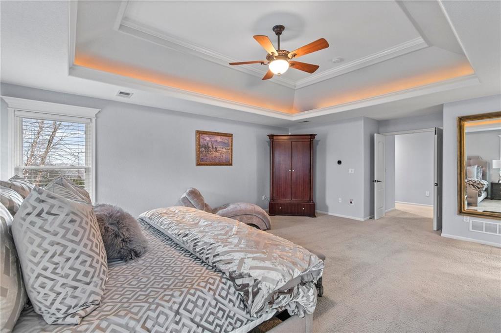 Prepare to fall in love with 14530 Grant Lane in the highly sought-after Windsor Hills neighborhood! A stunning retreat in the heart of Overland Park, KS! This 4-bedroom, 4.5-bathroom home effortlessly combines elegance and functionality, offering the perfect backdrop for modern living. Need extra flexibility? The main floor boasts a dedicated office that could easily transform into a 5th bedroom—ideal for guests or a growing household. Step inside to discover a spacious, open-concept living room bathed in natural light, with a large formal dining room at the entry plus a cozy dinette area. The kitchen is a chef's dream, featuring ample counter space, a generous walk-in pantry, and plenty of room to gather and create. Upstairs, convenience reigns with a second-floor laundry room, perfectly placed near the bedrooms. And the magic doesn’t stop there—venture downstairs to the expansive finished basement where endless opportunities await. This incredible space features a huge living room/entertainment area perfect for movie nights, game days, or hosting large gatherings. The built-in bar adds a touch of sophistication and makes entertaining a breeze, while the full bathroom ensures comfort and convenience for your guests. Whether you’re envisioning a cozy family retreat, a lively party space, or a home gym, this basement delivers in spades. Don’t overlook the outdoor sanctuary waiting just for you. The private backyard is a lush retreat, featuring beautiful landscaping that creates a peaceful oasis for relaxation or entertaining. Picture yourself enjoying morning coffee on the patio, hosting barbecues with friends, or simply unwinding amidst the greenery after a long day. To top it off, imagine waking up to serene views of the neighborhood’s large, tranquil pond just beyond your front door. This home offers the lifestyle you’ve been searching for: space, charm, and a location that can’t be beat. Schedule your tour today and discover the possibilities!