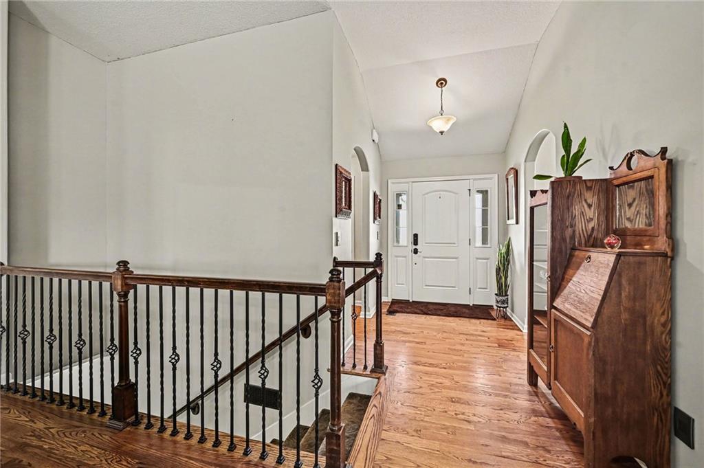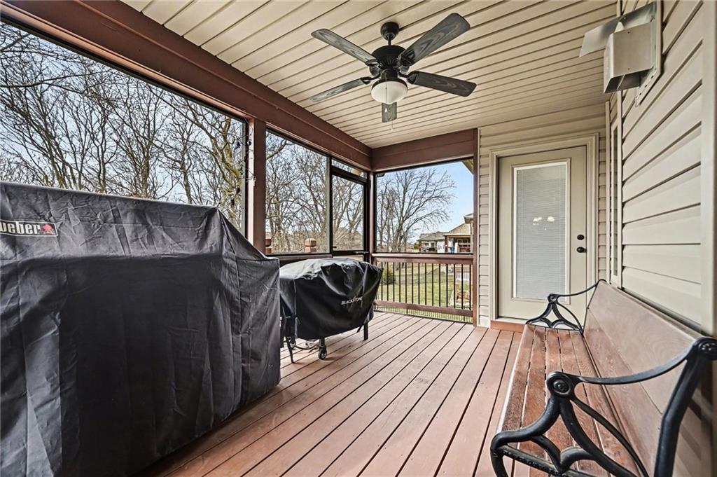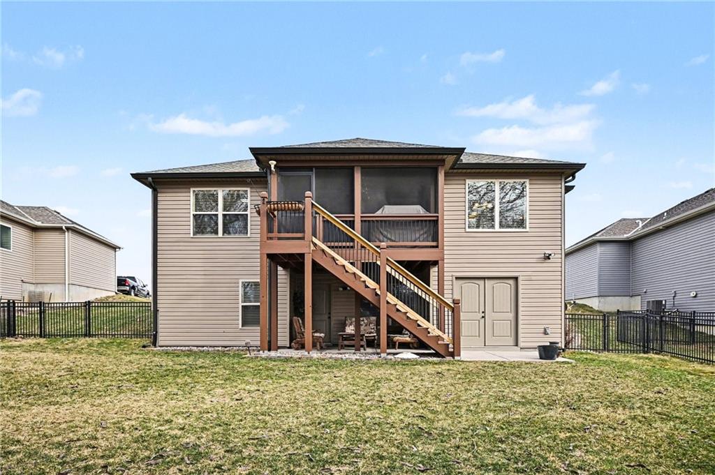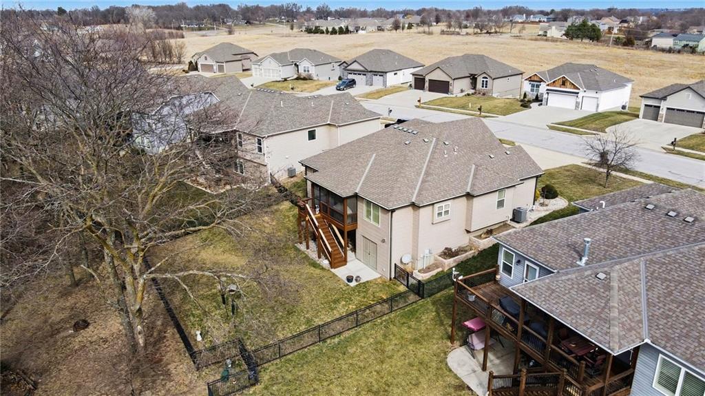 Located in the desirable Greyhawke neighborhood within Smithville School District, this home offers an ideal location just minutes from Smithville Lake, walking trails, a dog park, and a nearby golf course. Upon entering, you are welcomed by vaulted ceilings and beautiful wood floors that continue throughout the main living spaces, along with plantation shutters throughout the home. The open concept living room flows seamlessly into the kitchen and dining area and features large windows and a cozy gas fireplace. The kitchen offers a walk in pantry, stainless steel appliances, and warm wood finishes that complement the space. The primary bedroom includes vaulted ceilings, large windows, and private access to the screened in porch. The ensuite bathroom features dual sinks, a soaking tub, a separate shower, and a spacious walk in closet with direct access to the laundry room for added convenience. Two additional bedrooms and a full bathroom complete the main level along with a three car garage. The lower level provides a large basement ready to be finished and customized to your needs, along with a bedroom and full bathroom. A generous storage area offers plenty of space and includes double exterior doors for easy access. The backyard is fully fenced with black metal fencing and backs to a tree line, providing added privacy. Additional features include French drains and a gas line on the screened in porch, perfect for outdoor grilling and entertaining.