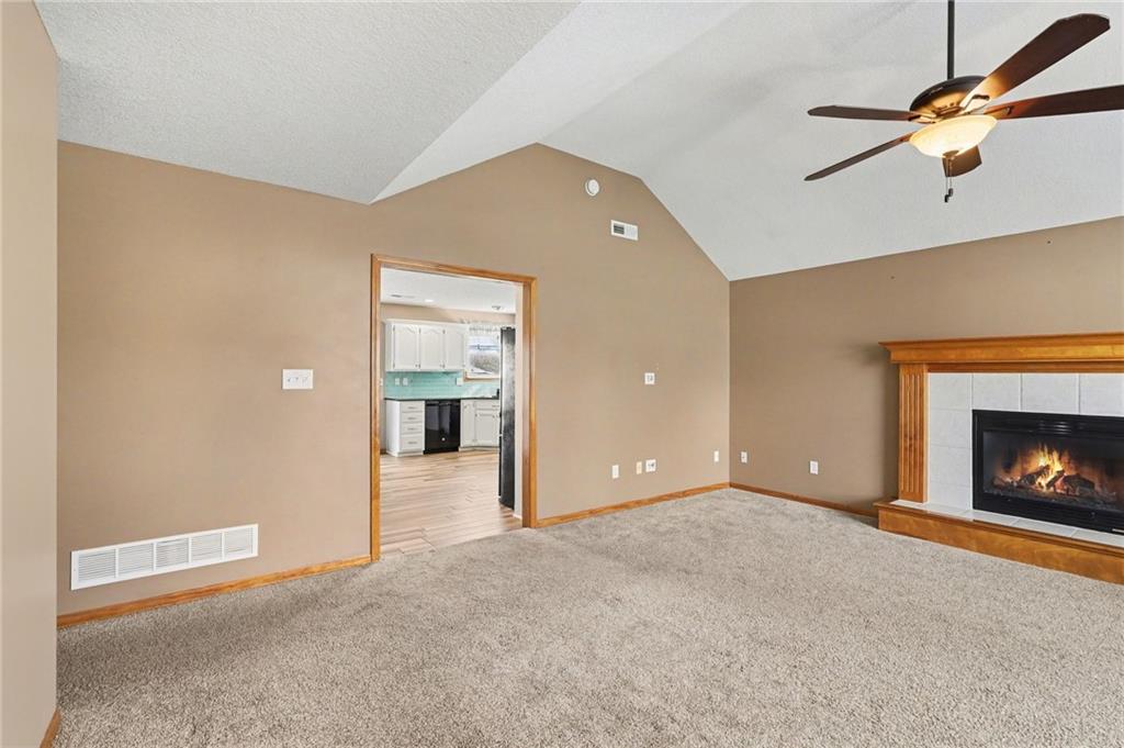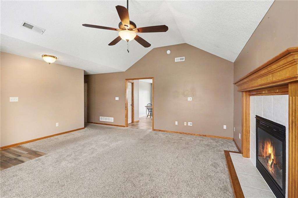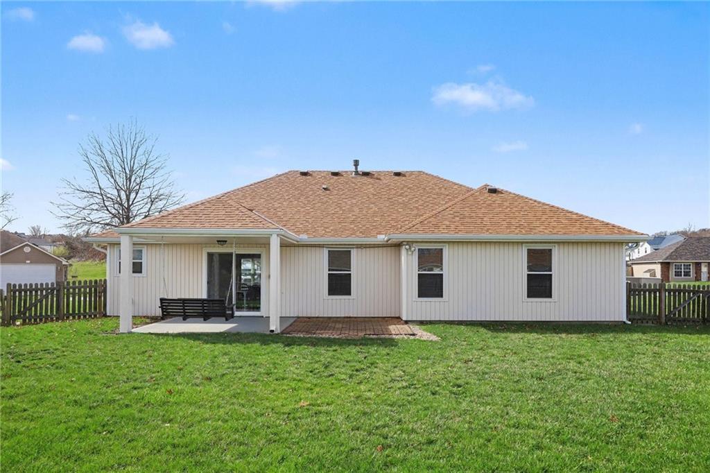 Beautiful ranch that shows like new! The inviting living room features vaulted ceilings and a cozy fireplace, creating the perfect space to relax or entertain. The kitchen offers granite countertops, tile backsplash, and a spacious walk-in pantry. The primary suite includes a tray ceiling, walk-in closet, and private bath with granite countertops. Newer windows and a newer back patio door provide added efficiency, and wood blinds are featured throughout the home. Step outside to enjoy the covered patio and fenced backyard — ideal for gatherings or quiet evenings at home. You’ll love the extra storage with an 8x20 space above the garage complete with lighting. Bonus: An 8-person storm shelter in the garage offers added peace of mind to keep your family safe.