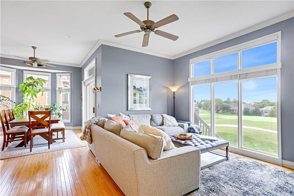 Views, views, views!!! Enjoy expansive, stunning views of the sunsets overlooking the 18th green on Falcon Ridge Golf Course from the wall of windows from every west facing room on the main floor: primary bedroom, formal living room, hearth room and the kitchen/breakfast room as well as the deck or patio. Updates galore! Kitchen was remodeled in Nov '22 with Cambria/quartz countertops, new backsplash, navy cabinets, new gas cooktop and new dishwasher. Most of the interior was painted in '22 and the exterior was painted in '23. Two bedrooms and a bath in the lower level were added in '21. Fabulous floorpan with primary bedroom and laundry on the main floor and tons of space for entertaining. The lower level has three additional bedrooms and a bonus room along with two full bathrooms, a large sliding door walks out to a patio with a wisteria covered pergola for plenty of shade and more views of the golf course! Lots of space for the pool table (that stays) as well as plenty of room to host the big game with a wet bar area as well. Electric fence by Pet Defence around the front and back yard. Maintenance provided community so say goodbye to your lawnmower and hello to carefree living! Beautiful flowers bloom for color in every season: tulips, hydrangea, peonies, roses, mums. Join the pool and clubhouse for an additional $295 estimated for the year, optional. So many wonderful restaurants, and shopping nearby with Lenexa City Center just 2.6 miles away, and super easy highway access. About 25 minutes to Arrowhead, Power & Light or Allen Fieldhouse. Owner/Agent
