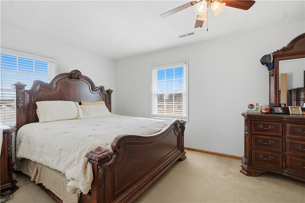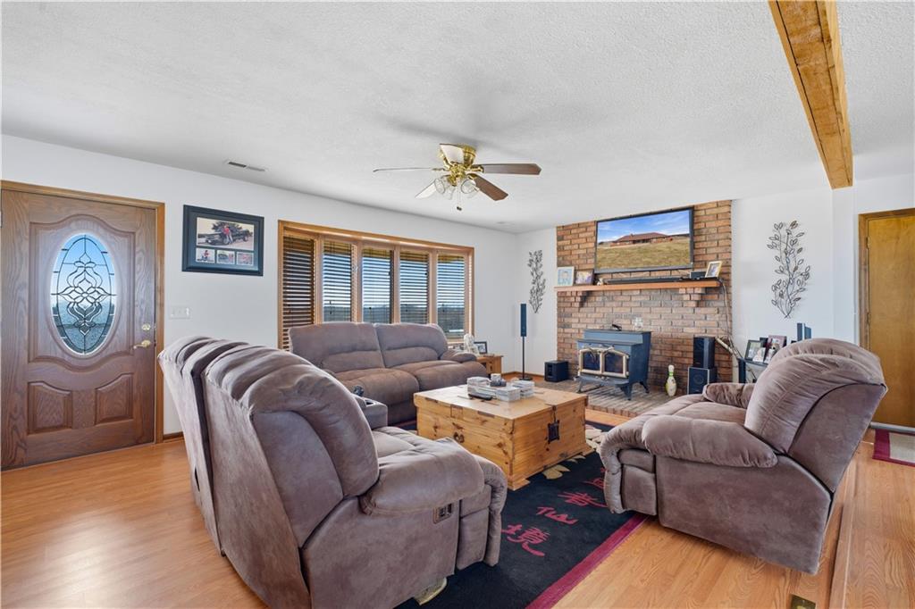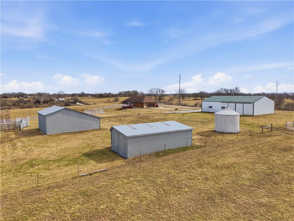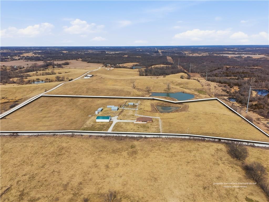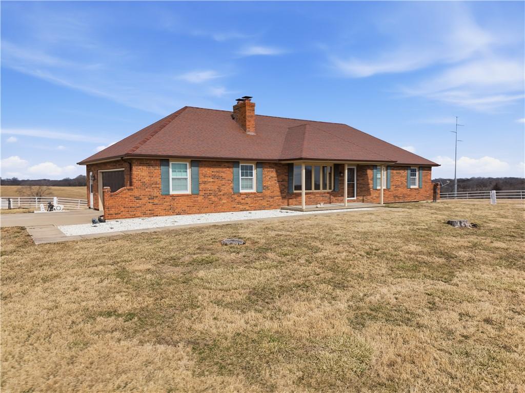 Beautifully maintained ranch home on 19+/- rolling acres featuring 2 main level bedrooms plus 3 non-conforming bedrooms in a fully finished walkout basement complete with a large second kitchen and spacious living room. Meticulously prepped for your comfort and located just 25 minutes from Kansas City, this property delivers the perfect mix of comfort, function, and wide open space. As you drive up, scenic views unfold across your land, buildings, fencing, and stocked pond. The large covered front porch is made for conversations that turn into lasting memories. The main level offers an open concept layout filled with natural light. The kitchen has northern exposure to the property, while the living room features large south-facing windows. Two oversized bedrooms sit on the main floor, including a spacious primary suite with private bath and pond views. A full hallway bath adds convenience. The kitchen includes granite countertops and space for a full size dining table. The walkout basement expands the living space with three additional non-conforming bedrooms and direct outdoor access, ideal for multi-generational living, guests, or entertaining. Formerly a cattle farm, the property is well suited for horses and includes recently painted fencing and gates, refreshed barns, and five total outbuildings. The 40x60 shop with concrete floors and power offers serious workspace. Fencing supports multiple farm animals, including that sought after Highland cow. An additional acreage directly north is available to expand your farm life even more. In the spring, the land comes alive with lush grass and vibrant views. Peaceful country living with city access within minutes. Well cared for. Move in ready. Built for lifestyle and legacy.