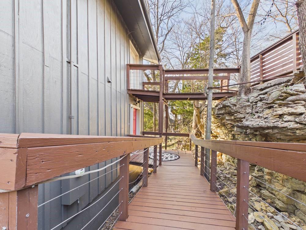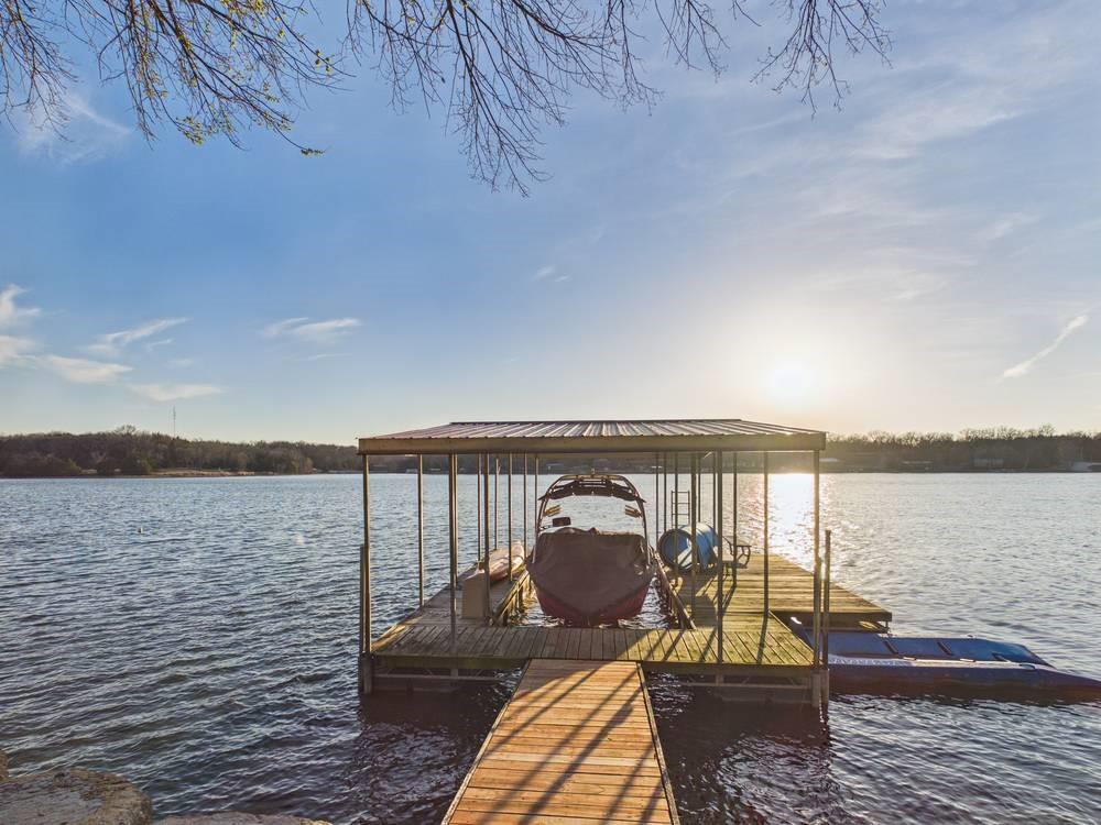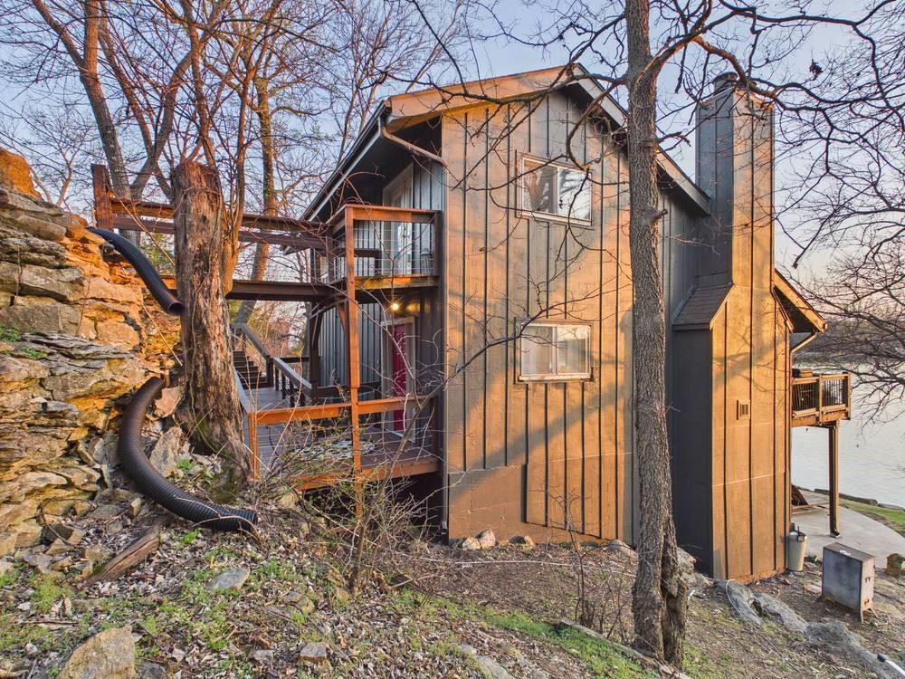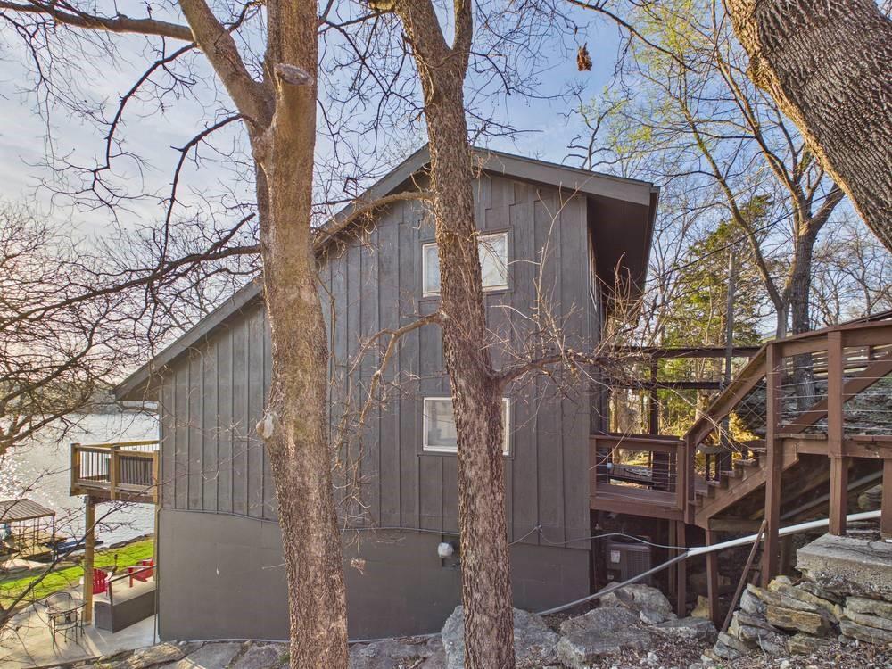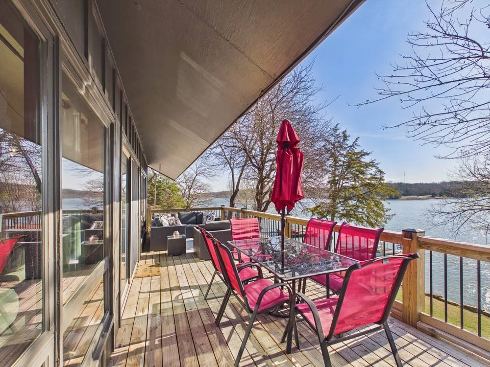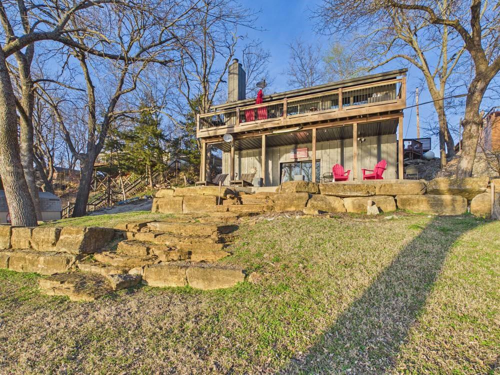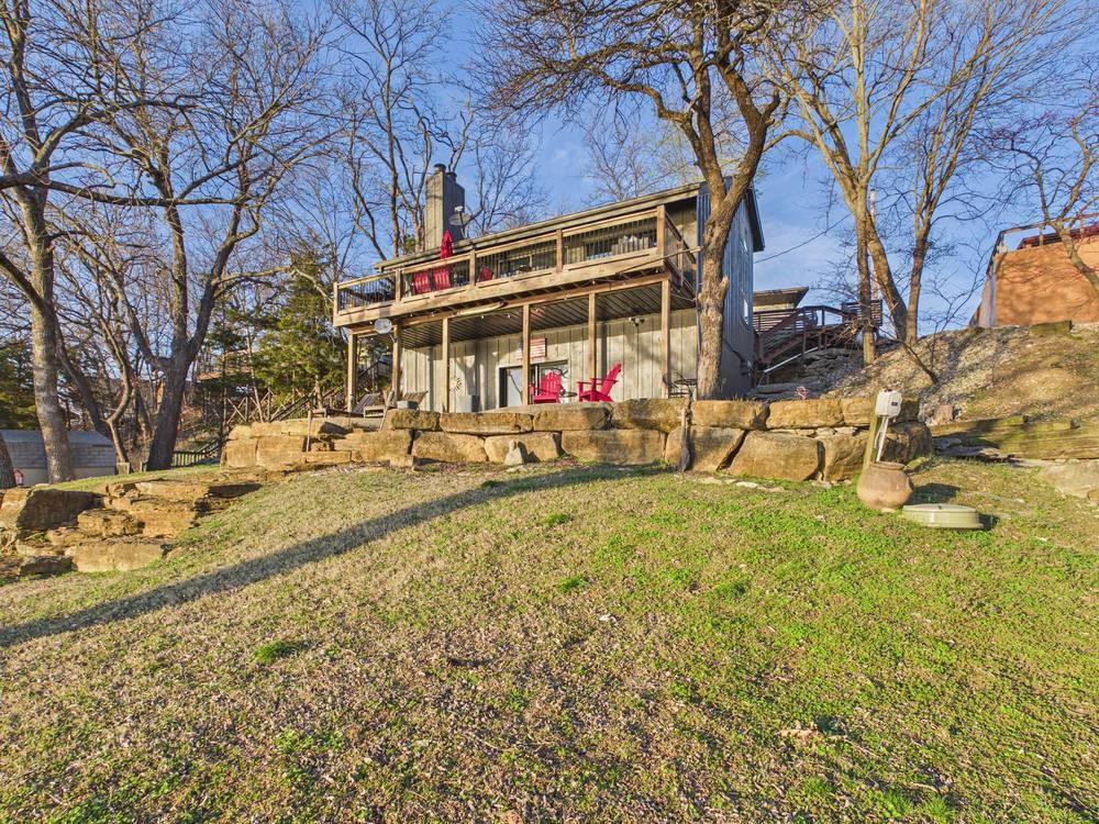 Situated on the tranquil shores of Lake Fort Scott, this fully furnished property features a charming main house and a separate recreation building, ideal for hosting guests and enjoying leisure time. The main house boasts three bedrooms and two-and-a-half bathrooms. Spanning three levels, the residence features a bright and airy open floor plan on the main level, highlighted by vaulted ceilings and modern stainless steel appliances in the kitchen. The expansive deck provides ample space for outdoor gatherings, while the lower-level covered patio serves as an additional entertainment area, ideal for relaxing by the lake. The separate recreation building enhances the property with an entertainment area, complete with a full bath, wet bar, sleeping area, and dining space, making it an excellent retreat for relaxation or entertaining. Additional perks include two storage sheds for convenience and a private boat dock complete with a lift, making it a perfect retreat just an hour and 15 minutes from the Kansas City area. Enjoy lakeside living at its finest! The exterior of the main house has just been completely repainted with wood repair and interior touch-ups. Lake Fort Scott has a $150 a year lake frontage fee and a monthly sewage bill paid to the city.