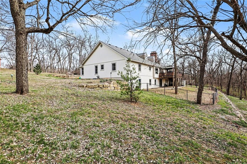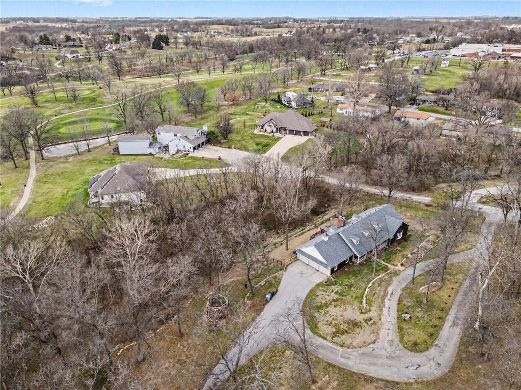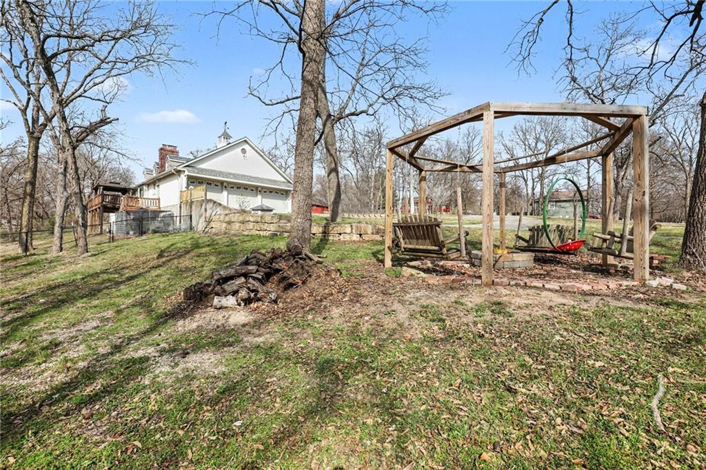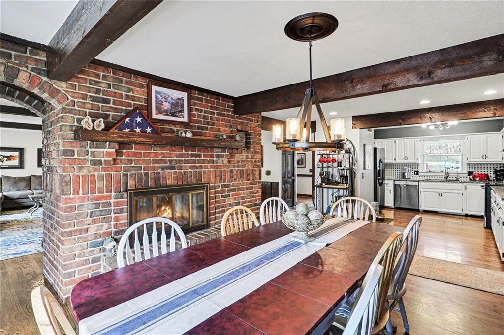 This charming, storybook home near the golf course is nestled on just over an acre with beautiful wooded views, offering character, space, and inviting farmhouse touches throughout. As you walk through the front door, you are greeted with original wood floors, open living spaces, and a gorgeous see through brick fireplace with a wood burning insert as the focal point of the living room. The dining room flows seamlessly from the living area and shares the two sided fireplace, while the spacious kitchen features granite countertops, a large pantry, and cottage inspired farmhouse charm. The primary bedroom is a true retreat with a bow window, hardwood floors, and an oversized walk in closet. The ensuite includes double sinks and a custom barn door. A second main level bedroom with its own bathroom, along with additional half baths, a laundry room, and a three car garage, complete the main floor. Upstairs offers two bedrooms and a full bathroom. The finished basement adds extra living space with a large recreation area, custom shuffleboard, a bedroom, full bathroom, generous storage, and a fourth garage, plus potential for a non conforming fifth bedroom or second kitchen. Outside, enjoy a spacious fenced backyard with a deck, covered gazebo, and patio, all backing to woods with golf course views. A charming fire pit with swings adds the perfect touch for relaxing or entertaining.