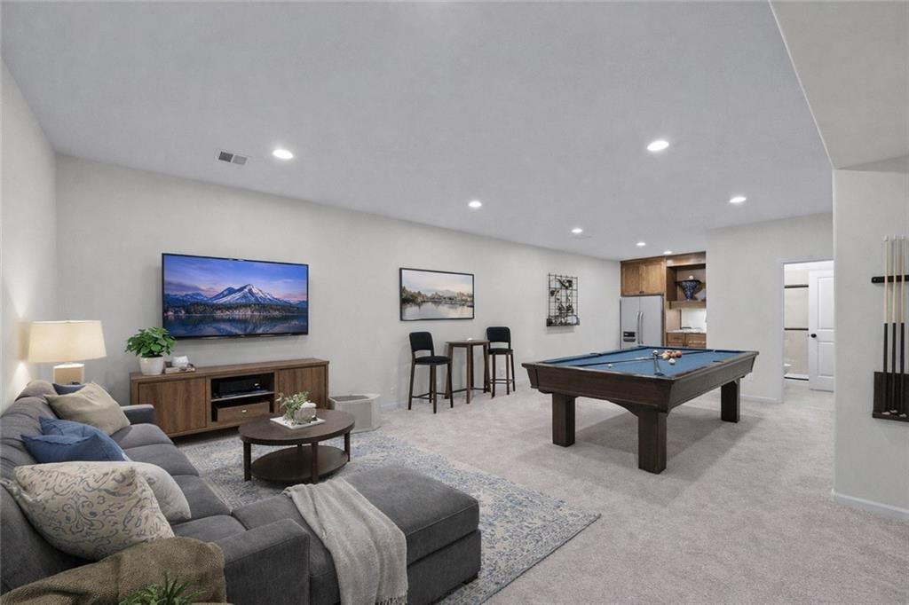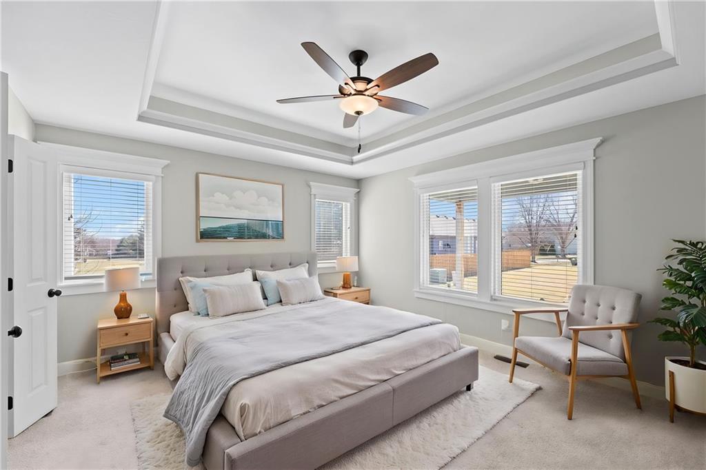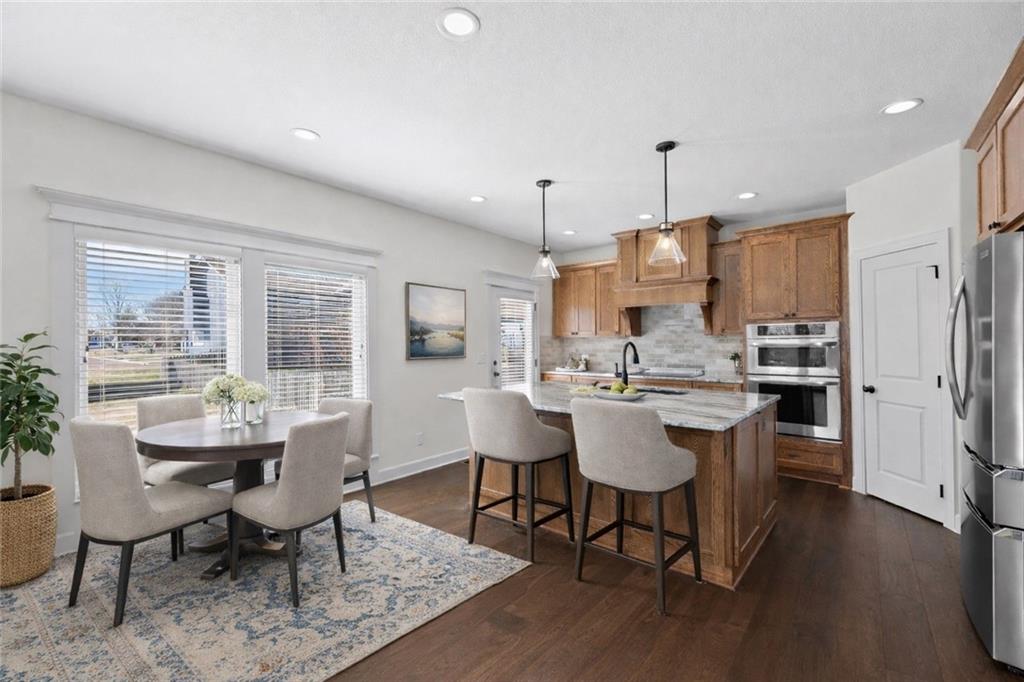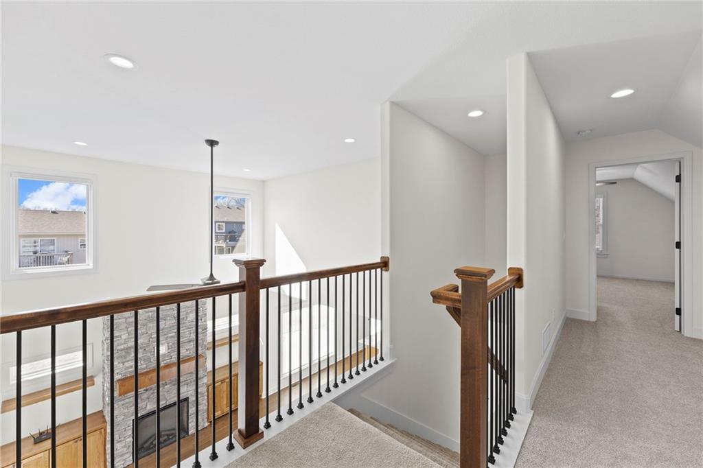 You will fall in love with this thoughtfully designed, nearly new 1.5-story custom home located on a quiet cul-de-sac in Spring Hill. This residence perfectly blends contemporary style with high-end features and energy-efficient systems. The open floor plan boasts soaring ceilings, large casement windows, premium hardwood floors, and a 9’ stone fireplace flanked by custom built-ins. The gourmet kitchen is a chef’s dream, featuring granite countertops, a large island with seating, a walk-in pantry, WiFi-enabled LG appliances, a restaurant-style vent hood, and soft-close white oak-stained cabinets. Additionally, a main-floor flex room serves as an ideal home office. The spa-like primary suite offers a tray ceiling with cove lighting, a walk-in rainfall shower, dual granite vanities, and a custom walk-in closet connected directly to the laundry room. The upper level includes two bedrooms, a full bath with a dual vanity, and a loft overlooking the great room. The finished basement provides a fourth bedroom with an ensuite bath, a large recreation room, a wet bar, a kitchenette, and an oversized unfinished flex space. Outside, you can enjoy your morning coffee or evening libations on the southeast-facing covered patio. This SMART home is equipped with Cat 5 wiring, dual-zone HVAC with humidity control, WiFi lighting, an 8-zone Rain Bird irrigation system, and a Sonos audio system. It is also generator-ready and pre-wired for solar. The oversized three-car garage includes WiFi-enabled doors and a built-in sink. Located just steps from trails, a four-acre park, shops, and dining, this home is also only minutes from Hillsdale Lake and Sycamore Ridge Golf Course. Schedule your showing today!